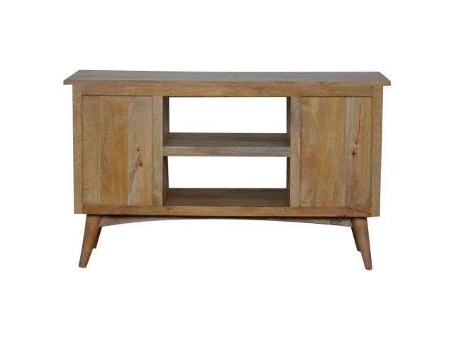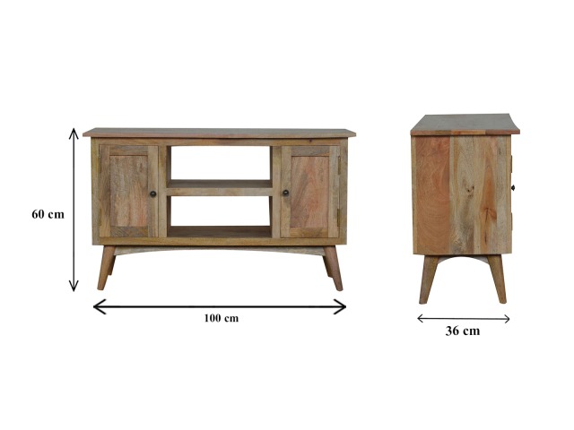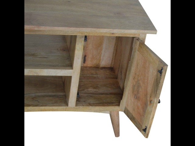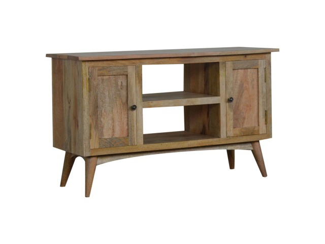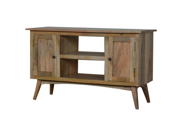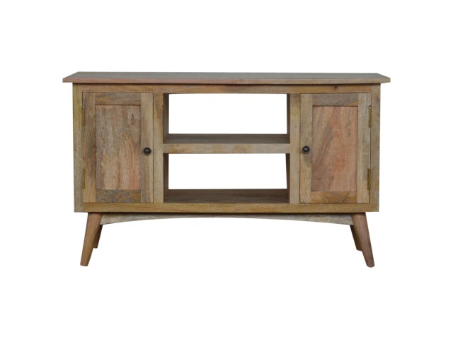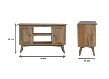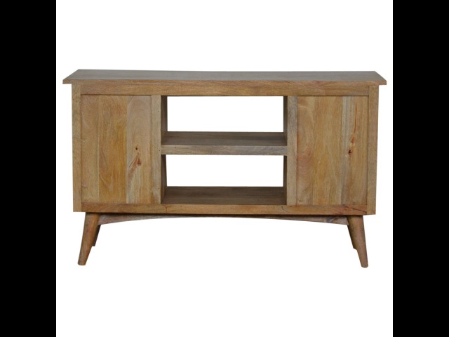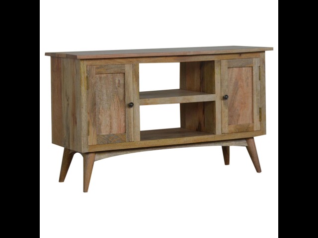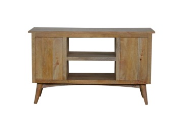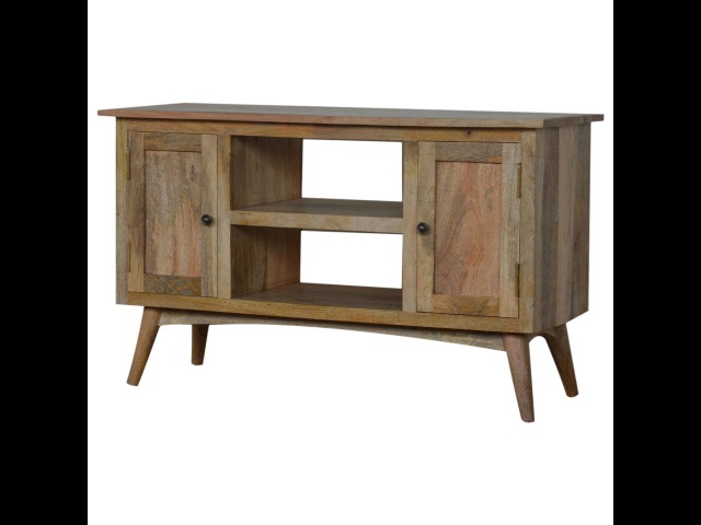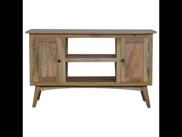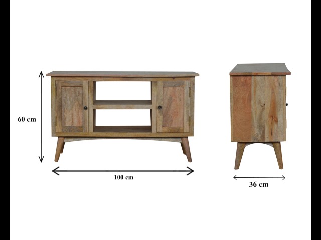 This solid timber media unit is expertly constructed from 100% solid mango wood and has a clean and simple design to suit most homes. This piece has a lovely oak-ish finish and features carefully handcrafted joints wooden runners and handles to the two drawers. It is carefully finished in a durable lacquer to help protect and enhance the look of this solid piece of furniture. Every piece of furniture is individually handcrafted and includes swing care tickets explaining the cautions and aftercare instructions.