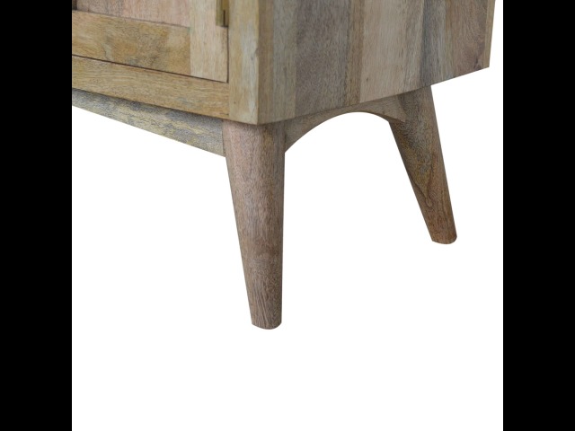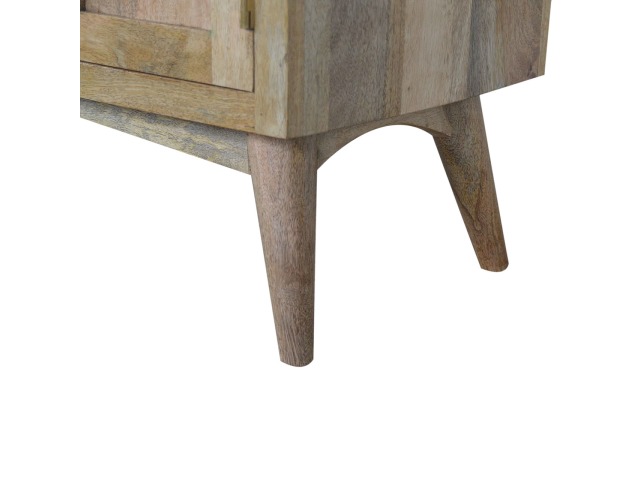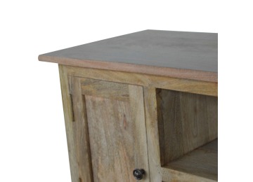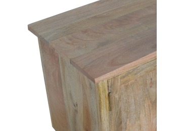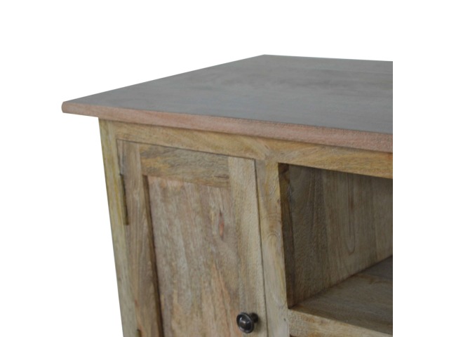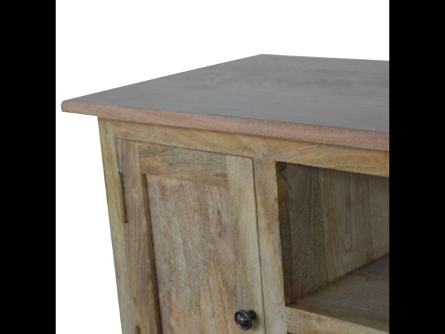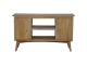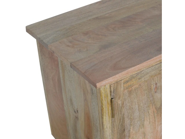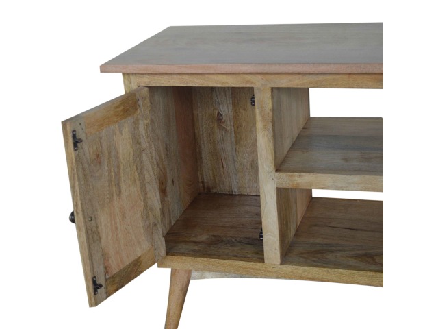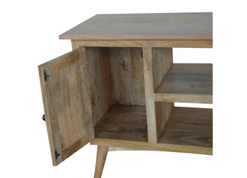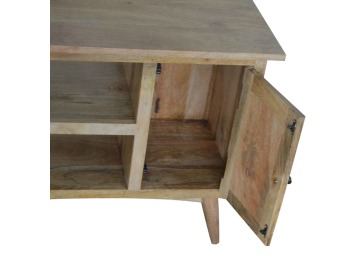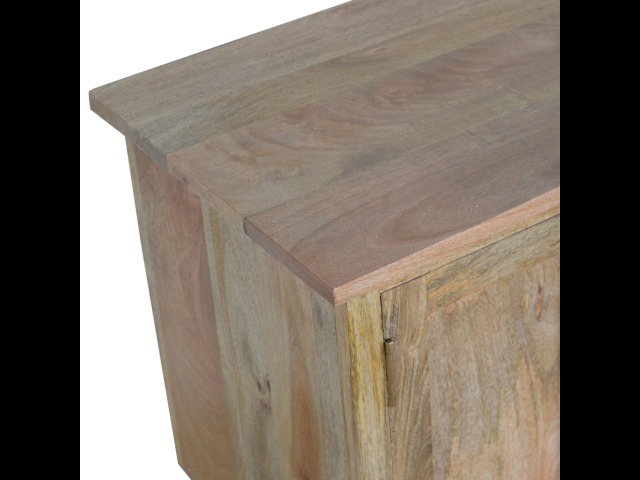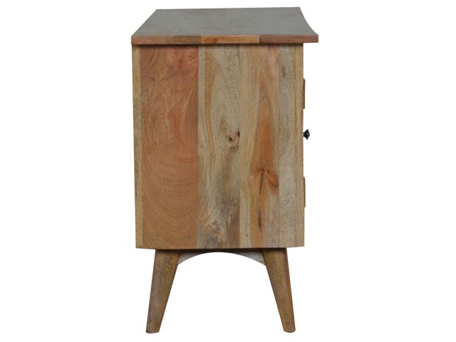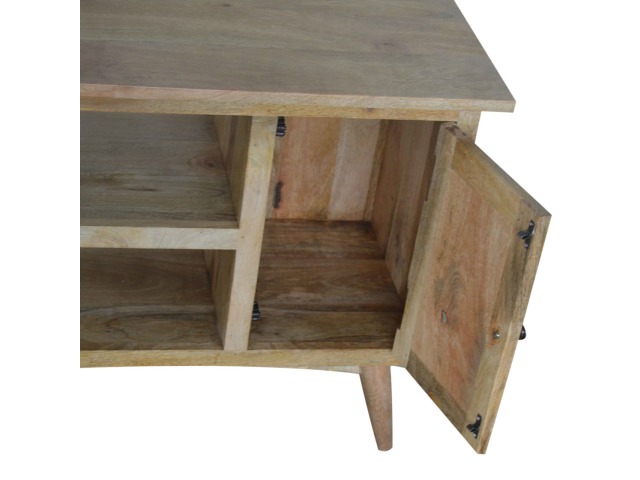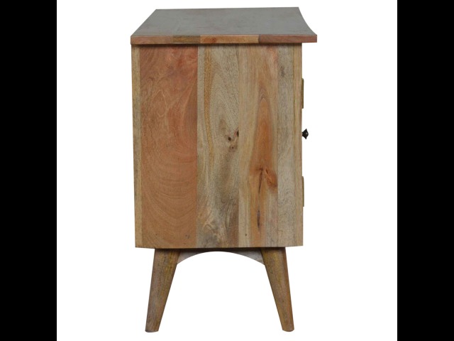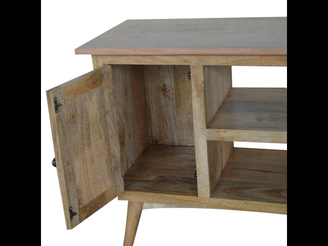 This solid timber media unit is expertly constructed from 100% solid mango wood and has a clean and simple design to suit most homes. This piece has a lovely oak-ish finish and features carefully handcrafted joints wooden runners and handles to the two drawers. It is carefully finished in a durable lacquer to help protect and enhance the look of this solid piece of furniture. Every piece of furniture is individually handcrafted and includes swing care tickets explaining the cautions and aftercare instructions.