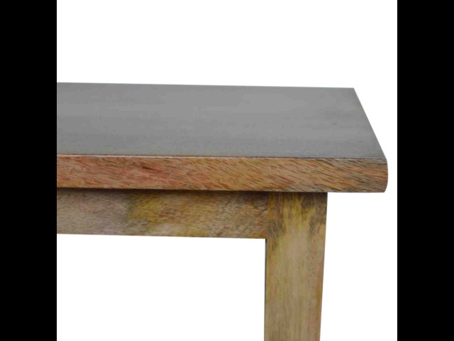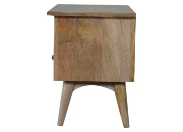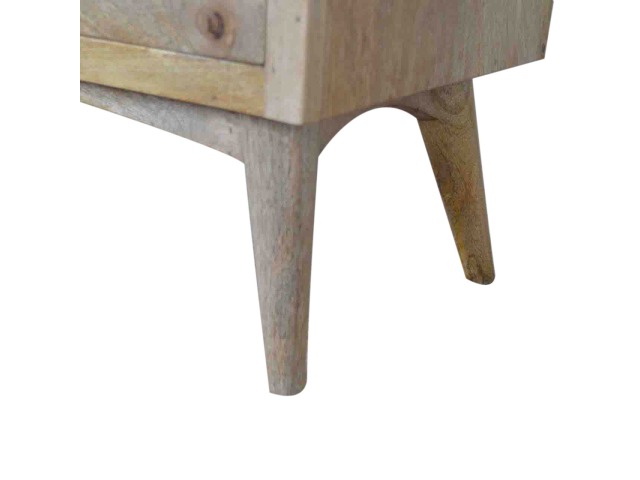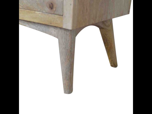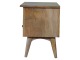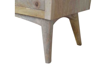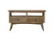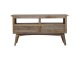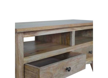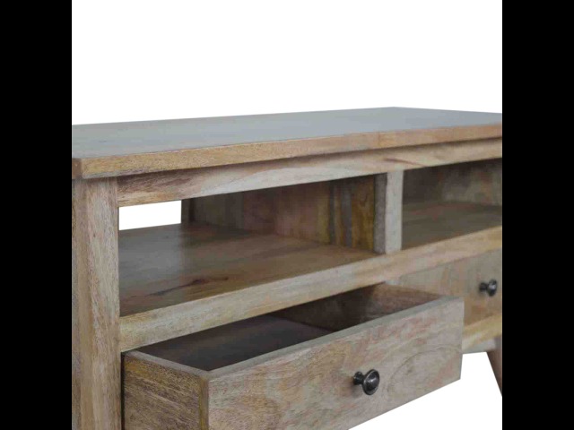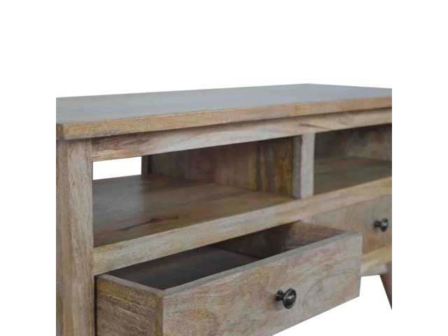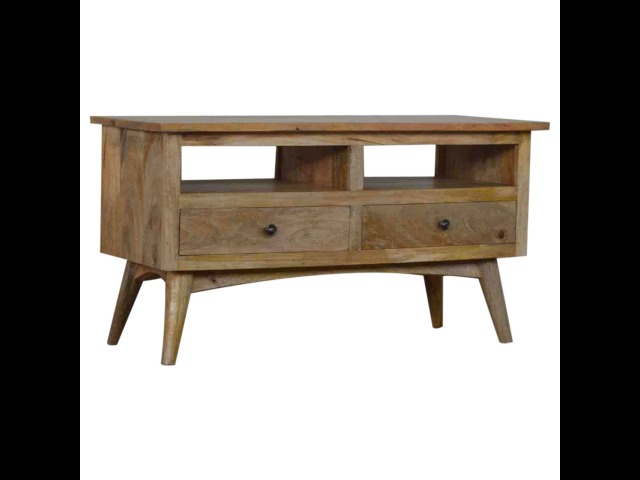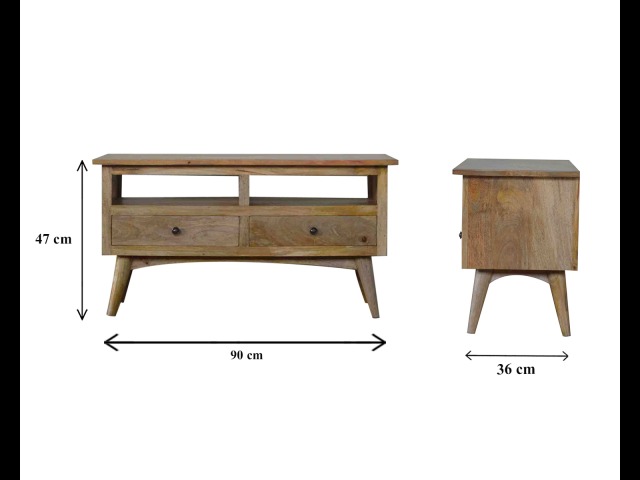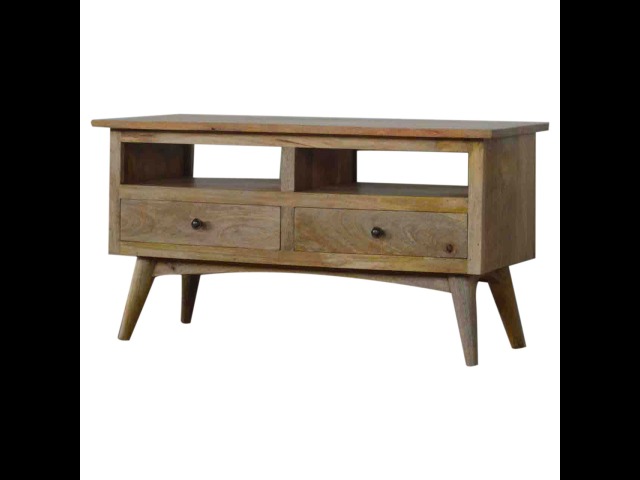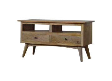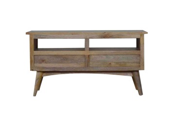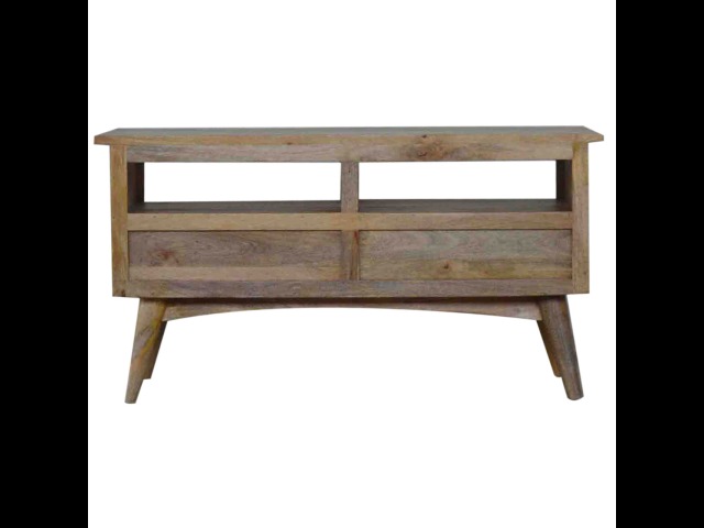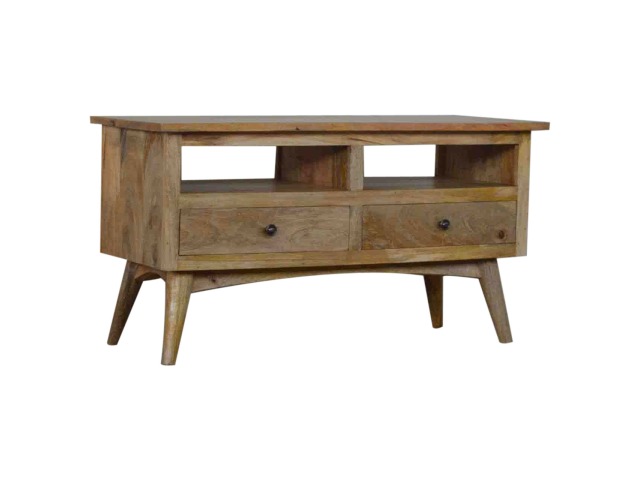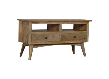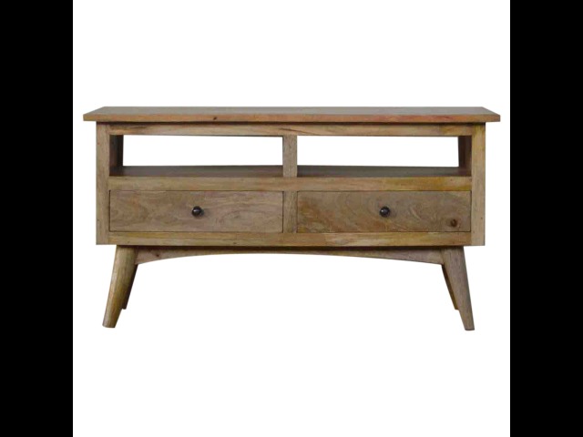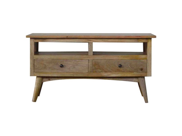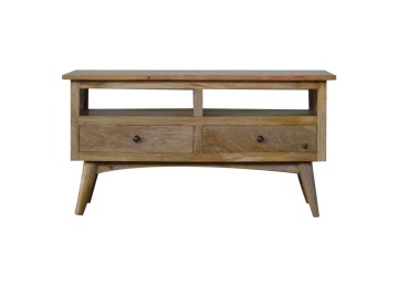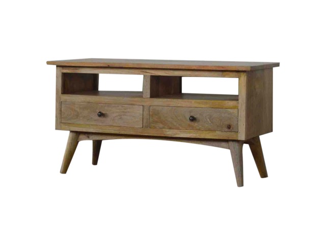 Our solid timber media unit is expertly constructed from 100% solid mango wood, and has a clean and simple design to suit most homes. This piece has a lovely oak-ish finish and features carefully handcrafted joints, wooden runners and brass handles to the two drawers. It is carefully finished in a durable lacquer, to help protect and enhance the look of this solid oak piece of furniture.