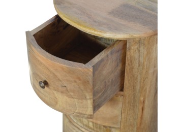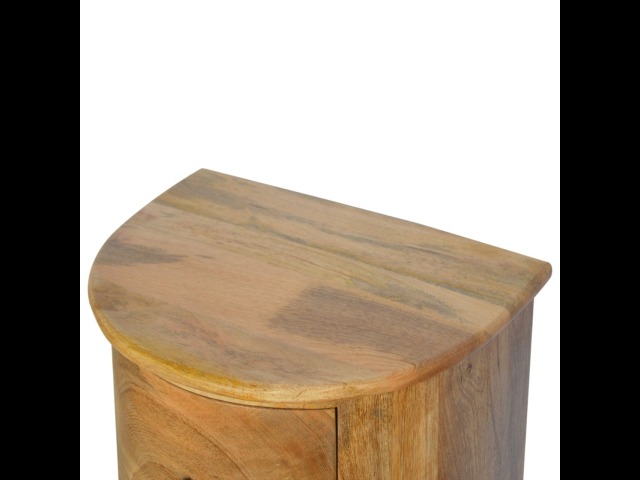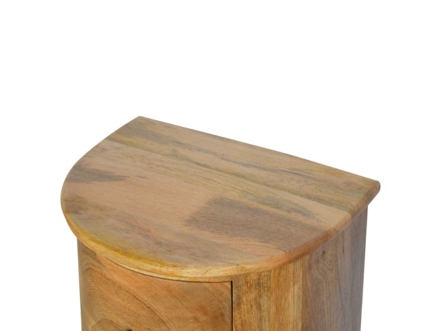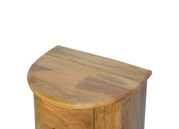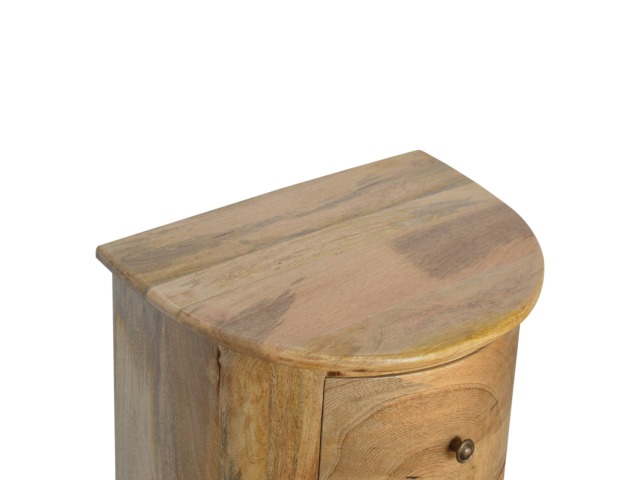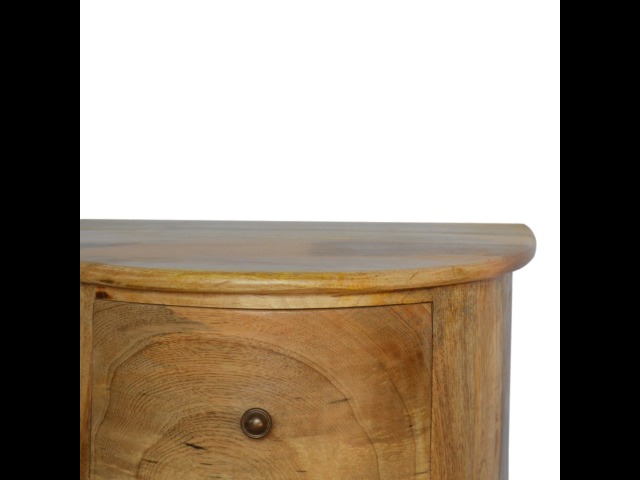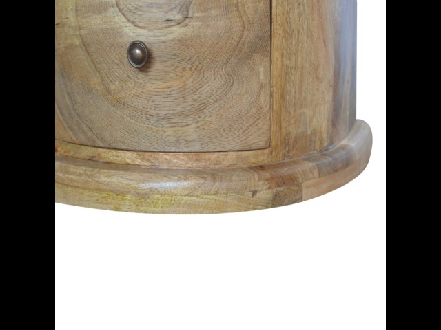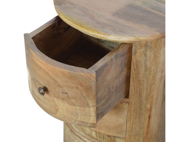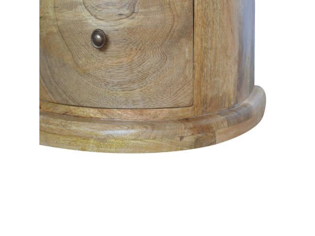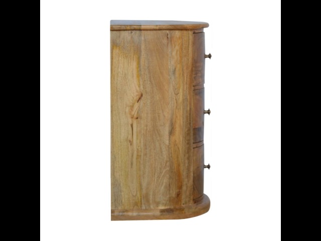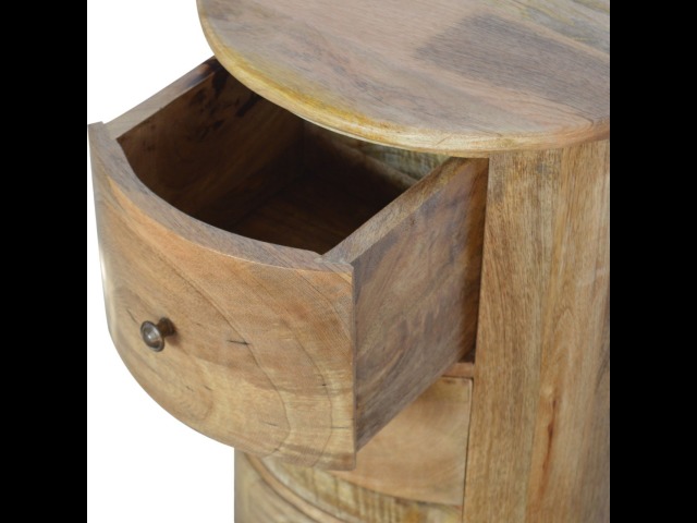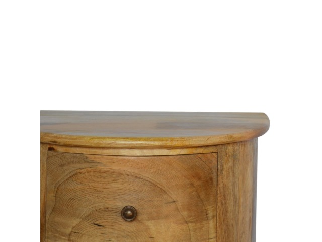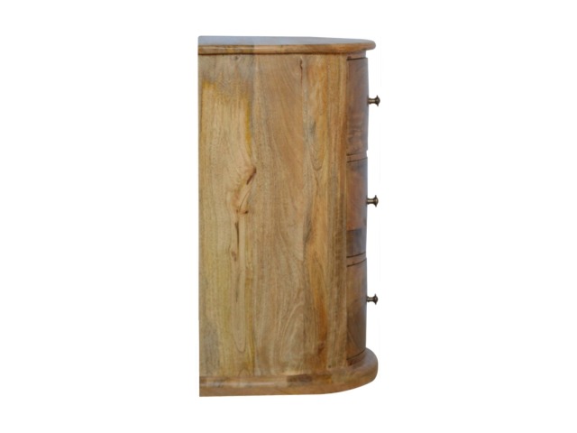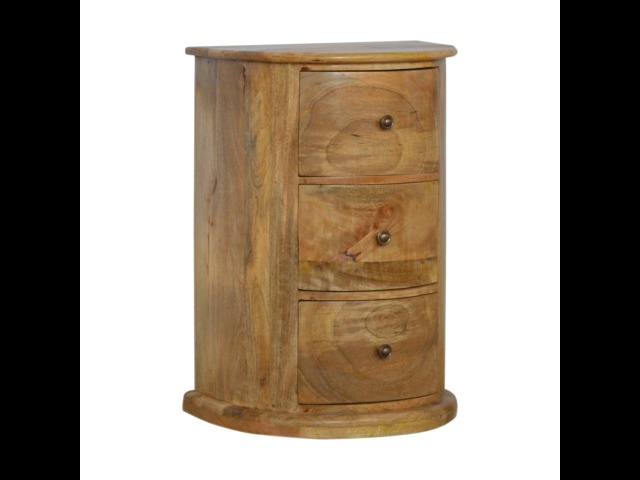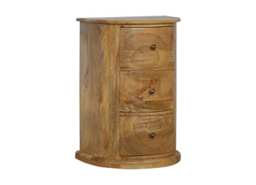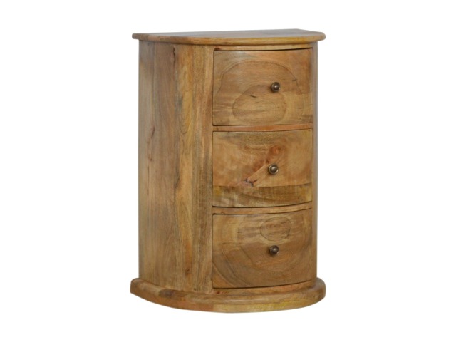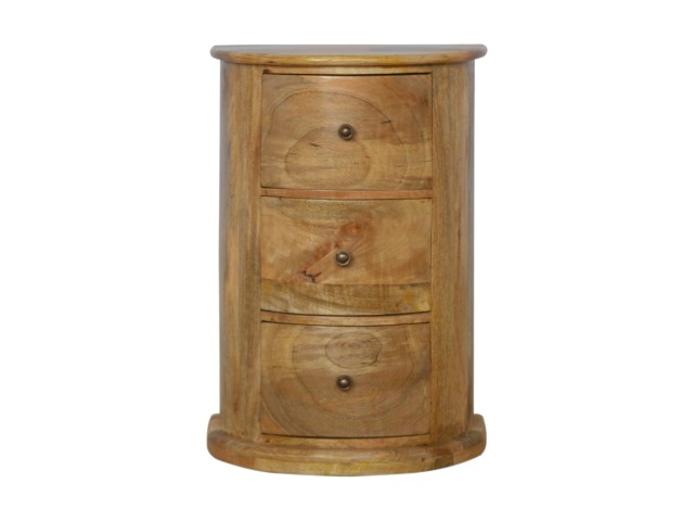 This curved drum chest is the perfect addition to the home, featuring 3 spacious drawers providing sufficient and conveninent storage space for any bits and pieces you wish to keep nearby before bedtime. Constructed from 100% solid mango wood in an oak-ish finish it is the perfect piece for the bedroom allowing it to be incorporated with different colours and styles of furniture.