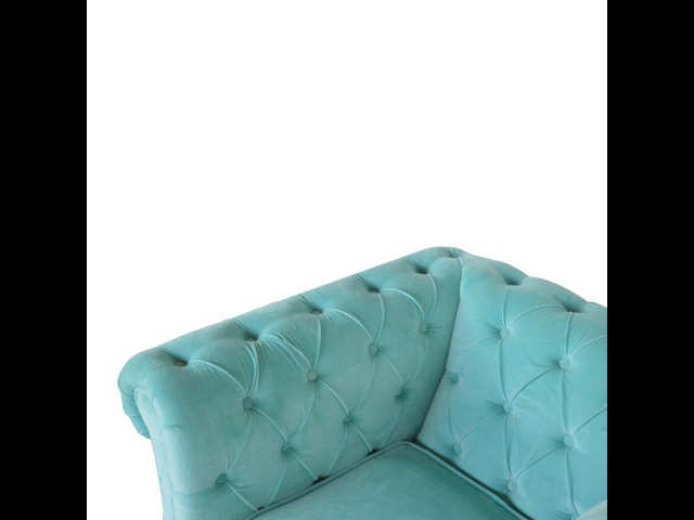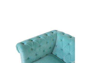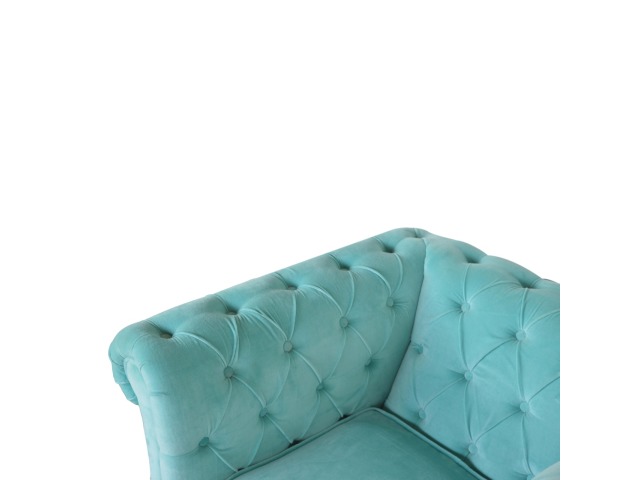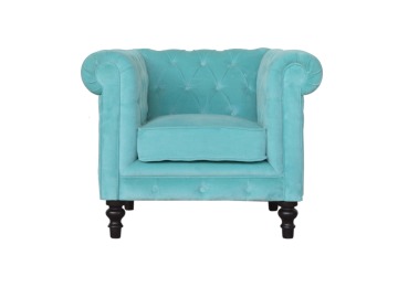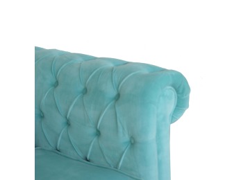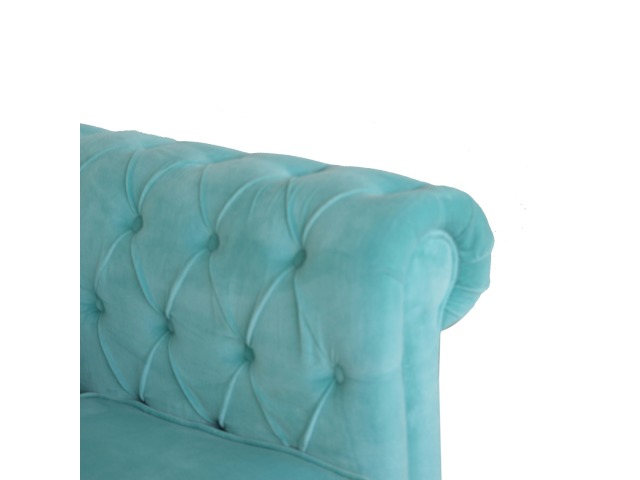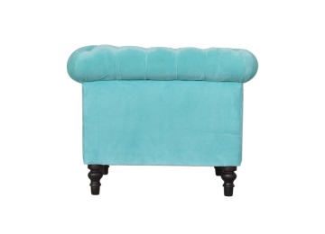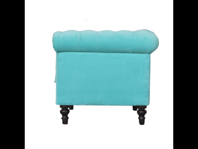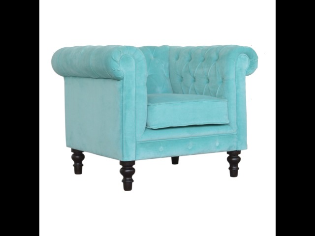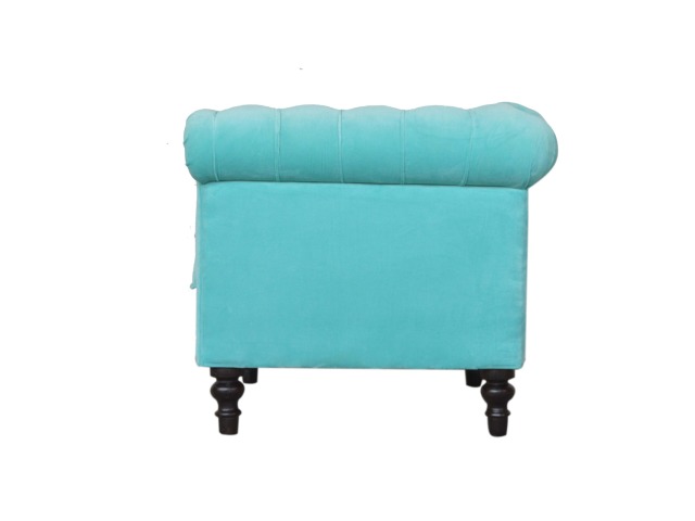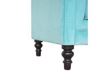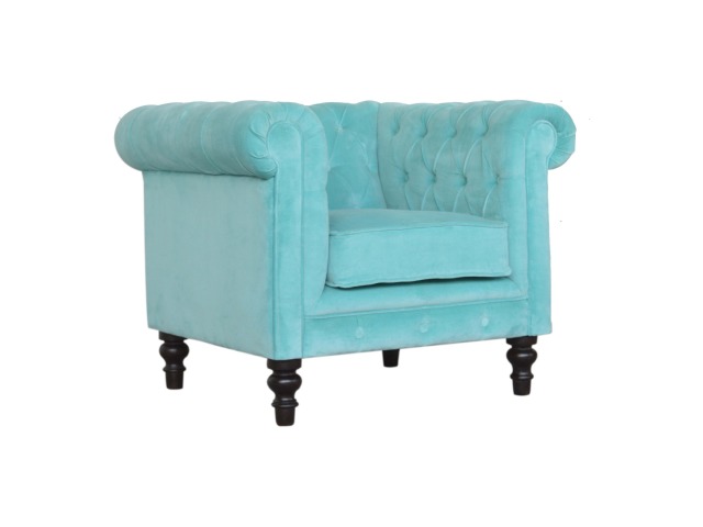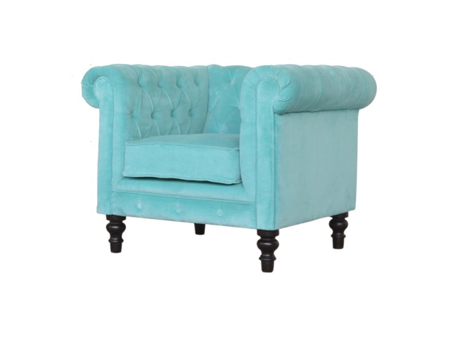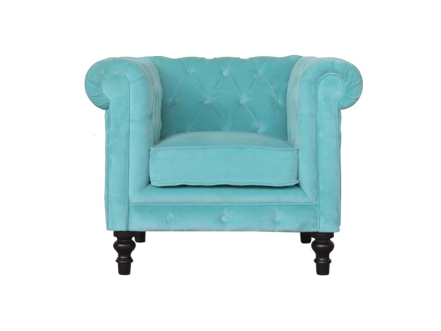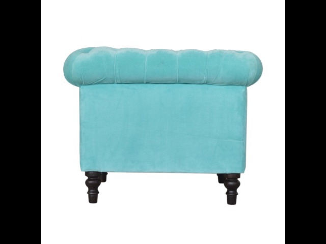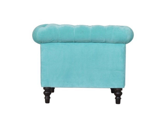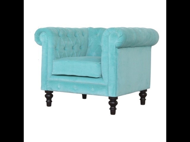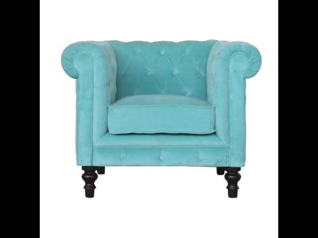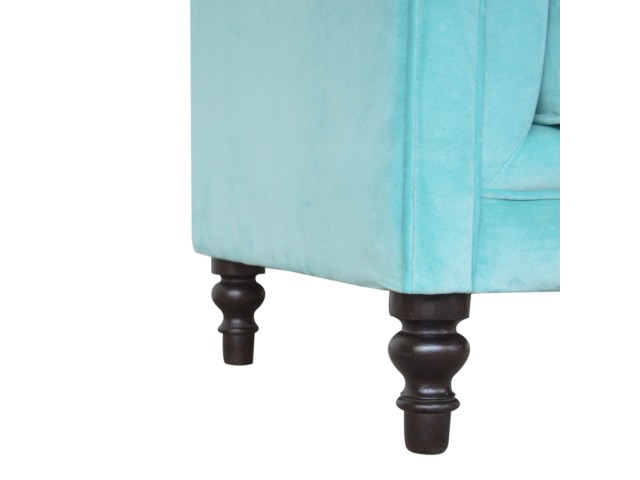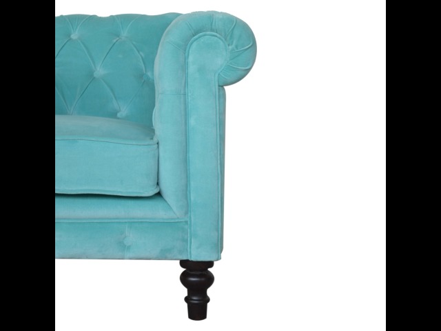 This beautiful Chesterfield armchair has been upholstered in a luxurious turquoise cotton velvet and features 4 turned feet constructed from 100% solid mango wood in a chestnut finish. This sofa is detailed with deep button tufts, piping and sheltering arms. This is a statement piece for the home which can be suited well with many different styles and colours of interiors.
