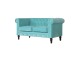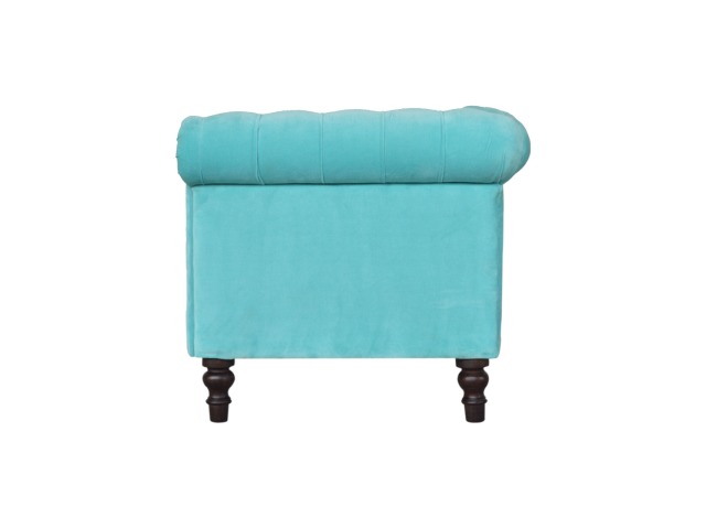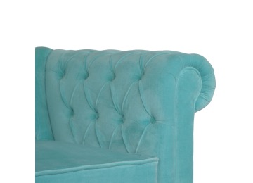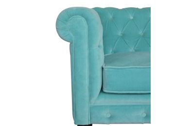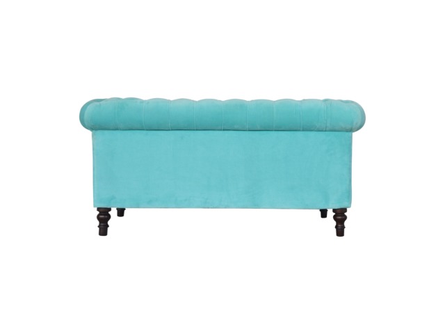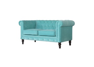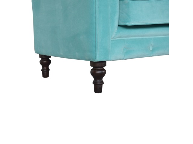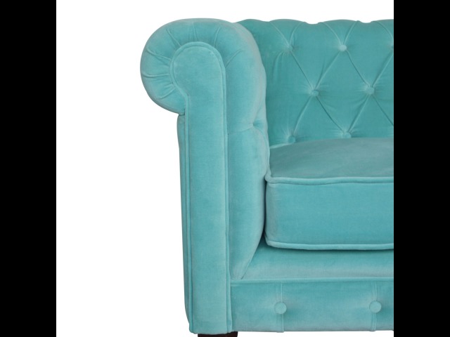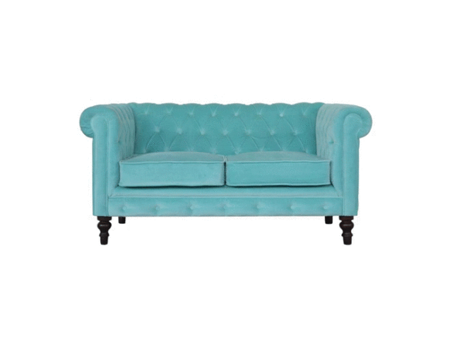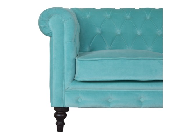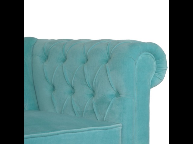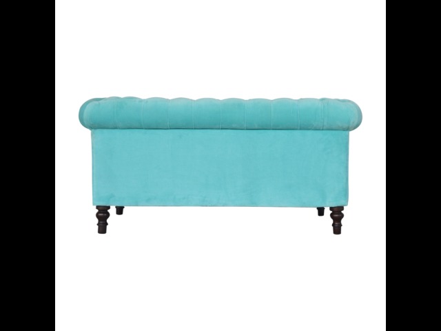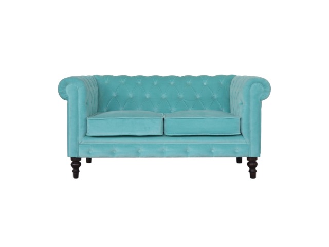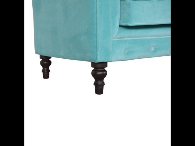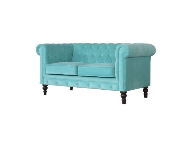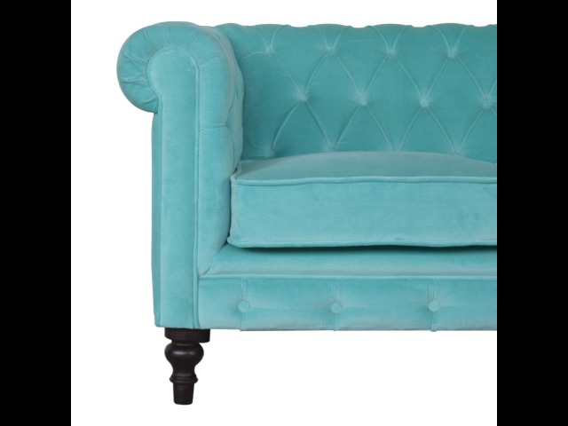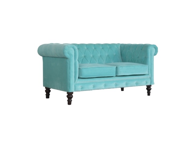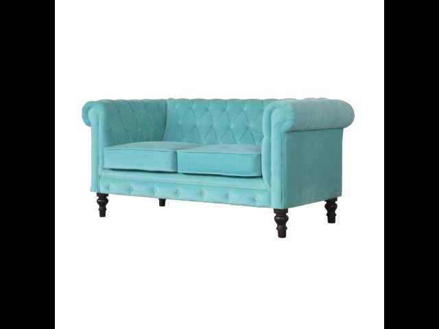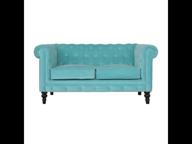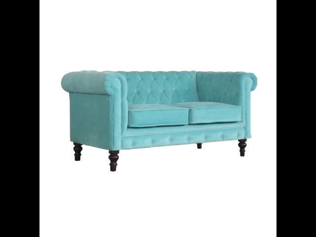 This beautiful 2 Seater Chesterfield Sofa has been upholstered in a luxurious smooth aqua cotton velvet. It features 4 turned feet constructed from 100% solid mango wood in a walnut finish. This sofa is detailed with deep button tufts, piping and sheltering arms. This is a statement piece which can be added as a pop of colour and be suited to different home settings. Product to be delivered on the pallet as a pavement/kerbside delivery. Customer needs to dispose off or use it if they wish to. For possible returns, we would require the original pallet alongside full packaging as part of returns policy.