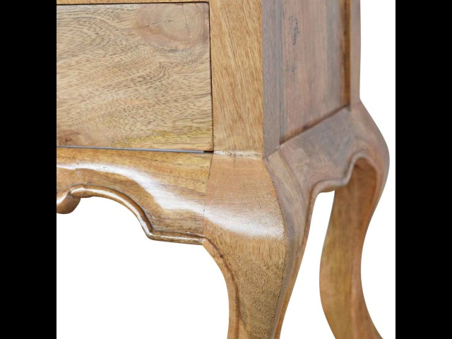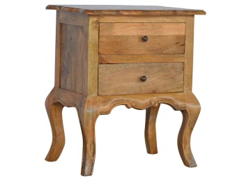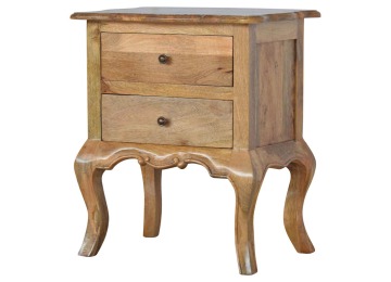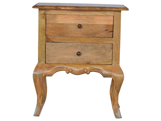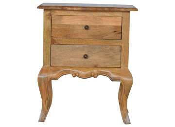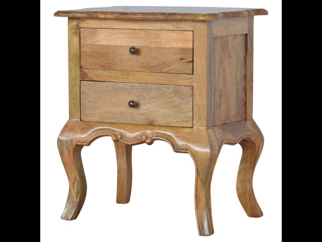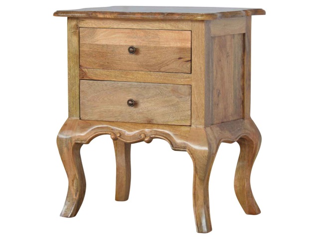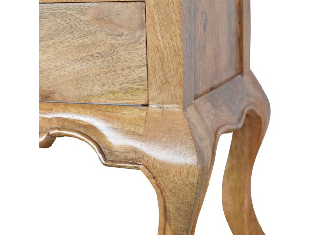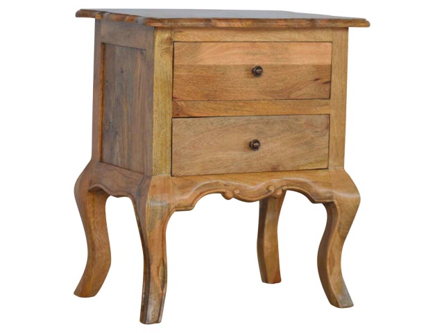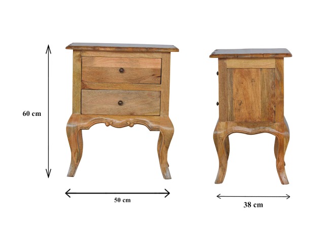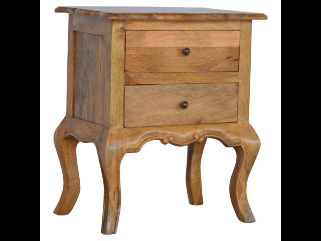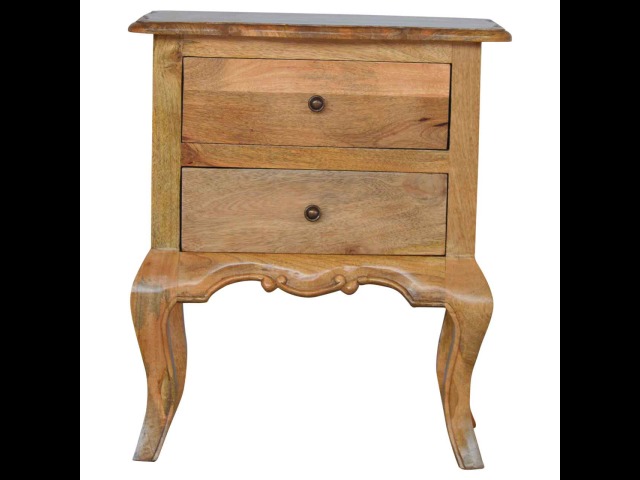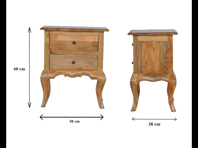 This bedside has been constructed from 100% solid mango wood in an oak-ish finish with 2 shiny knobs and is an elegant addition to any bedroom. It features 2 drawers for storage space and an ample surface area for all your decorative furnishings. Delicate hand carved designs feature scrolls and scallops that flow beautifully with the subtle curves of the chest and cabriolet style legs. Every piece of furniture is individually handcrafted and includes swing care tickets explaining the cautions and aftercare instructions.