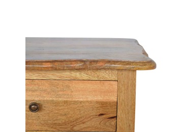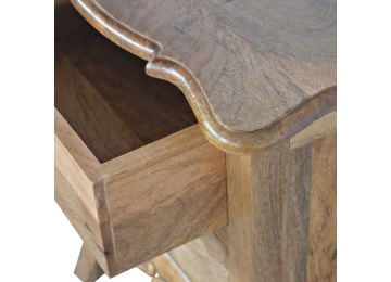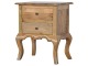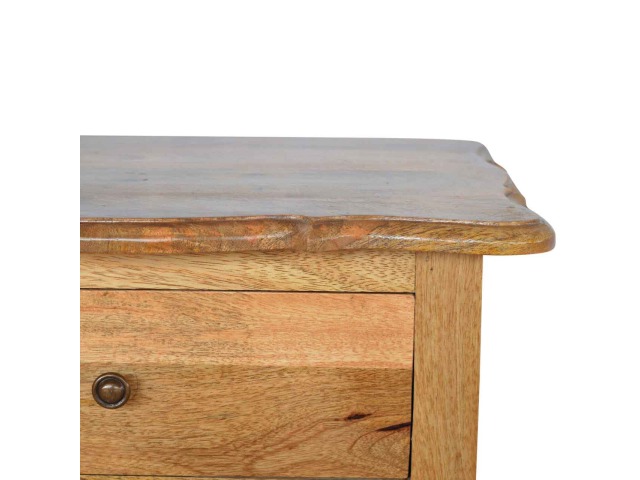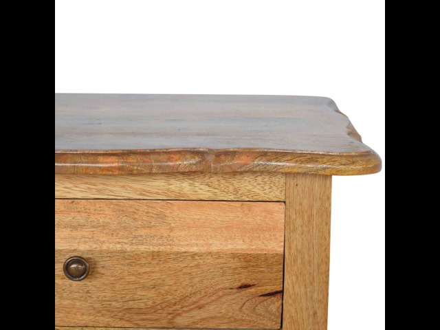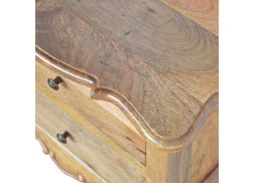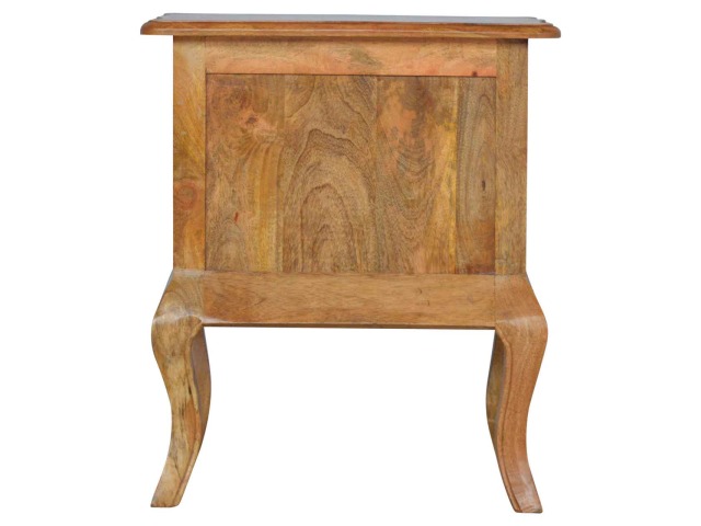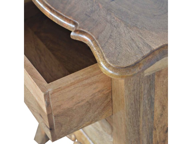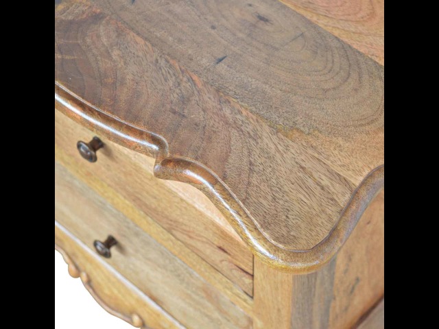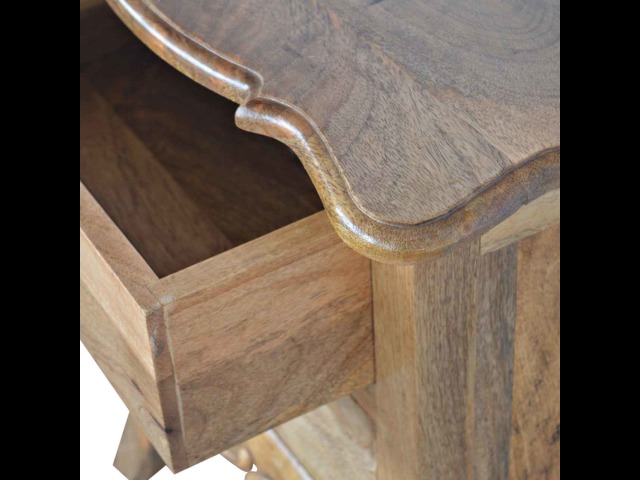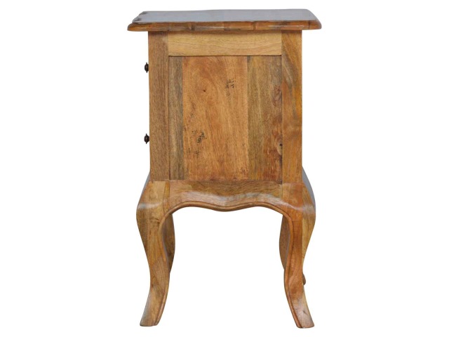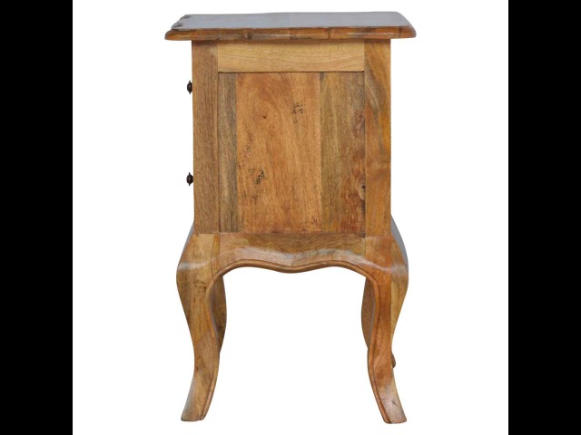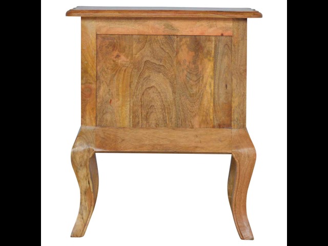 This bedside has been constructed from 100% solid mango wood in an oak-ish finish with 2 shiny knobs and is an elegant addition to any bedroom. It features 2 drawers for storage space and an ample surface area for all your decorative furnishings. Delicate hand carved designs feature scrolls and scallops that flow beautifully with the subtle curves of the chest and cabriolet style legs. Every piece of furniture is individually handcrafted and includes swing care tickets explaining the cautions and aftercare instructions.