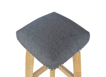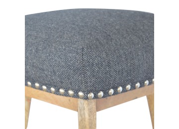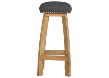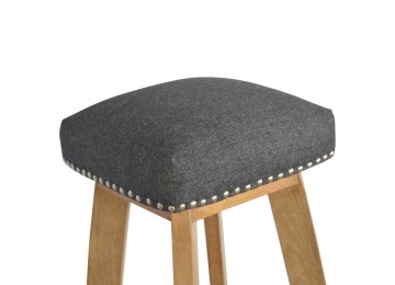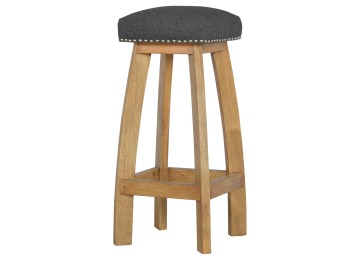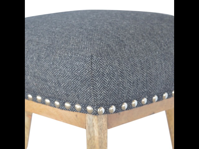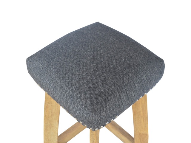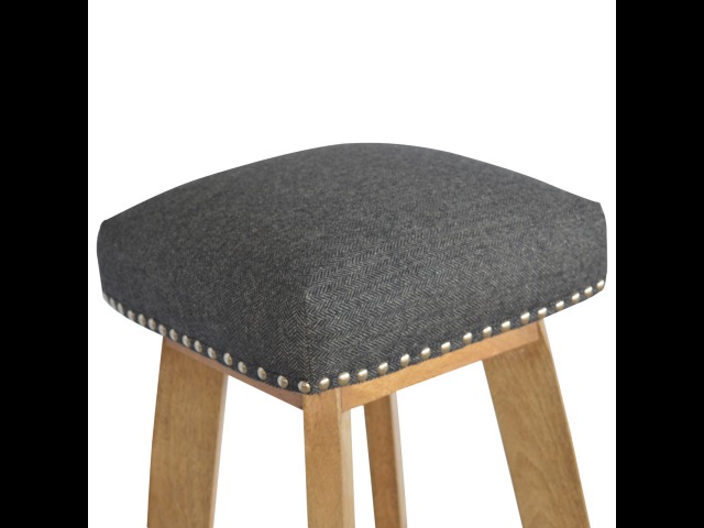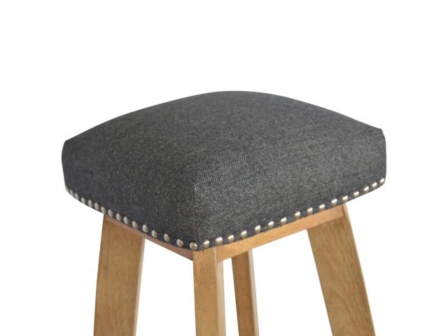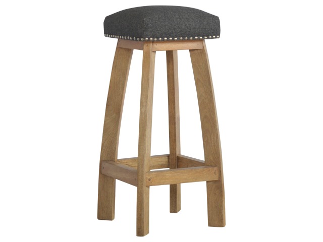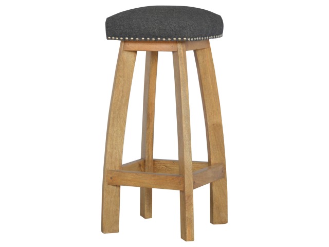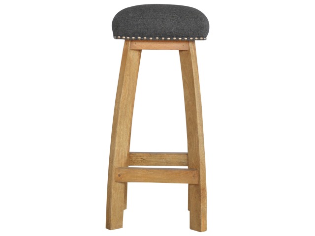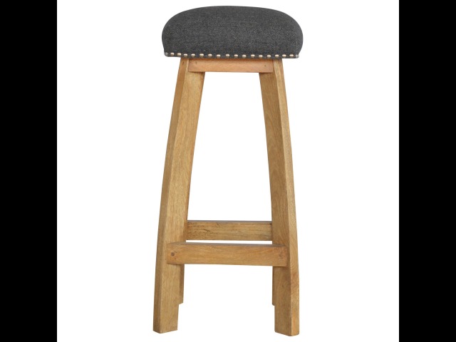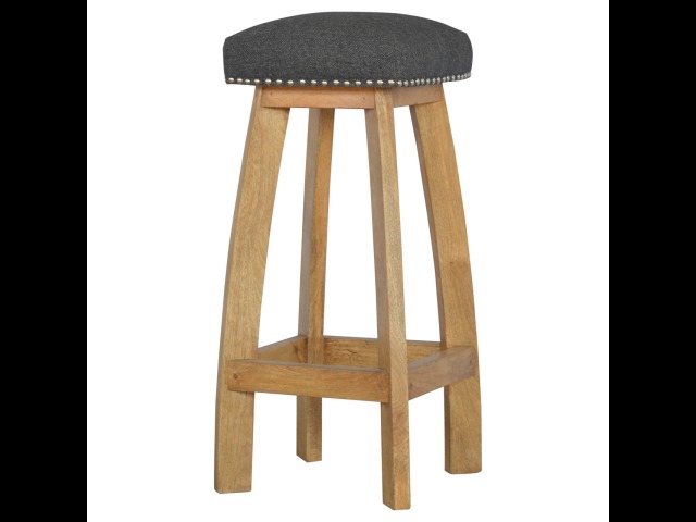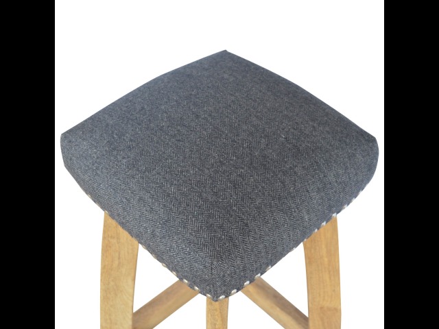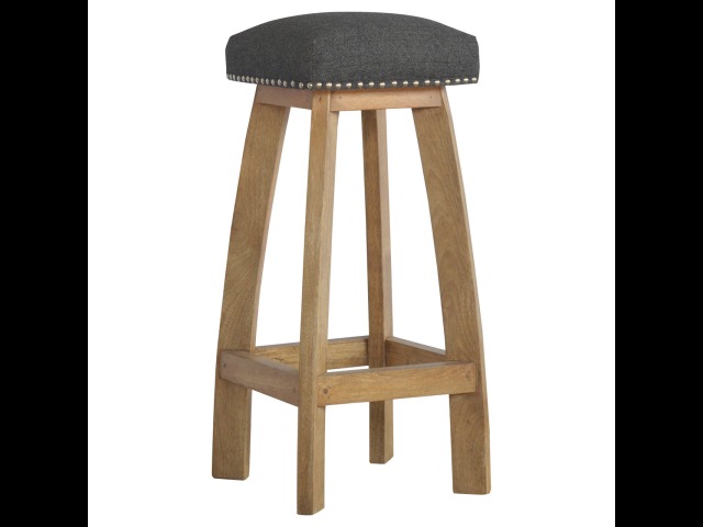 This Nordic style bar stool is constructed from 100% solid mango wood with a black tweed upholstered seat. It is a strong and compact stool; great for kitchens, bars and cafes. It is light enough to pick up and move around easily and features antique studs around the seat and tapered legs which have a smooth oak-ish finish. Every piece of furniture is individually handcrafted and includes swing care tickets explaining the cautions and aftercare instructions.