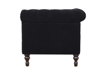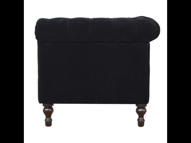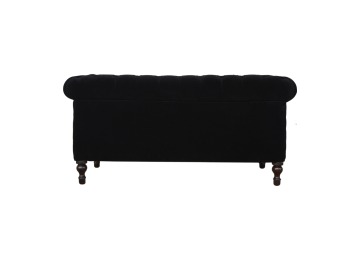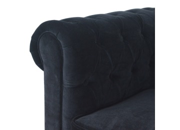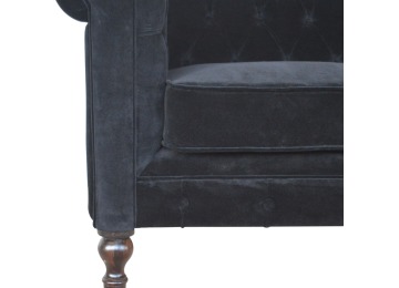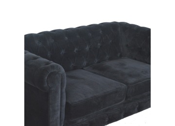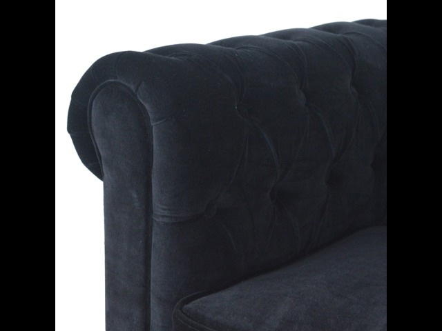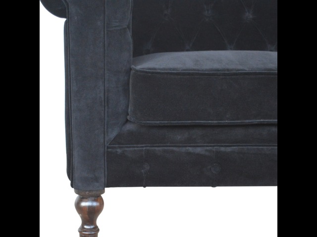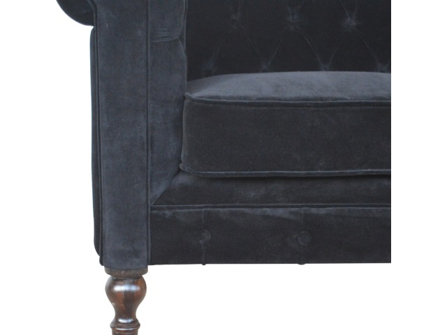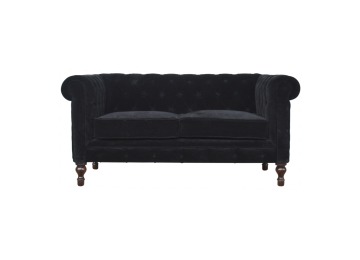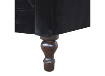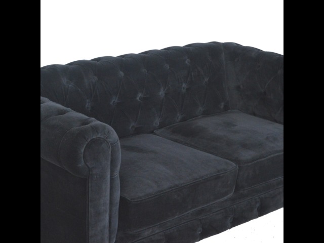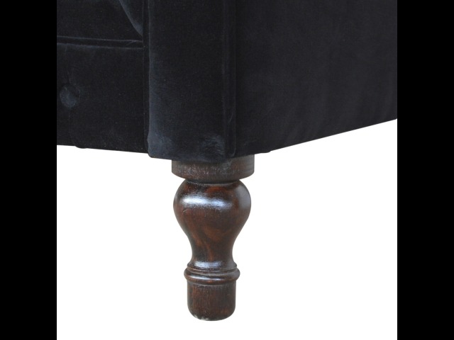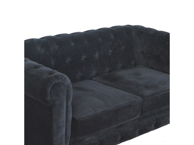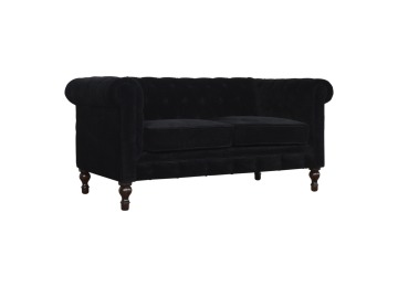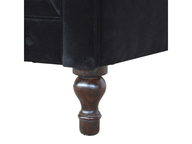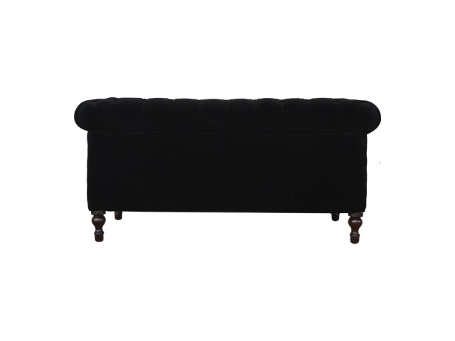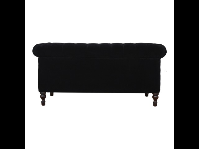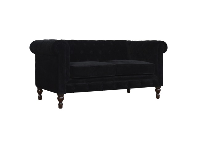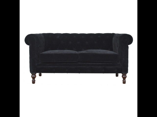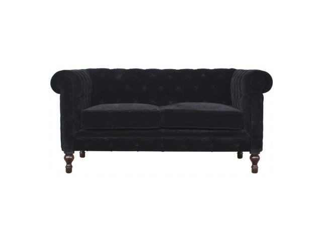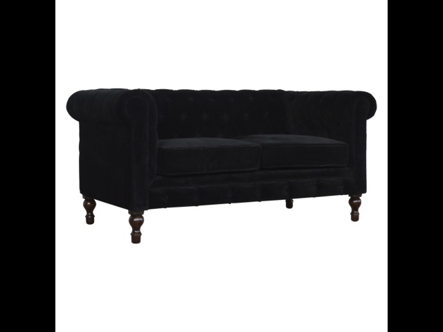 This beautiful 2 Seater Chesterfield Sofa has been upholstered in luxurious black cotton velvet and features 4 turned feet constructed from 100% solid mango wood in a walnut finish. This sofa is detailed with deep button tufts, piping, and sheltering arms. This is a statement piece for the home which can be added as a pop of colour to any room in the home or can be suited well with many different styles and colours of interiors being modern or classic. Product to be delivered on the pallet as a pavement/kerbside delivery. Customer needs to dispose off or use it if they wish to. For possible returns, we would require the original pallet alongside full packaging as part of returns policy.