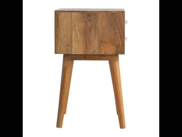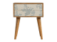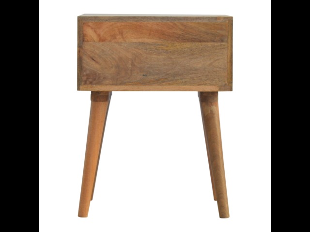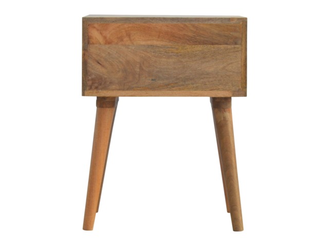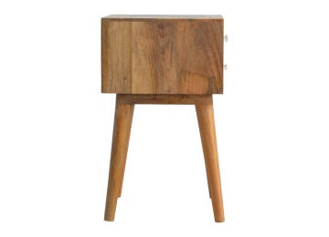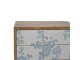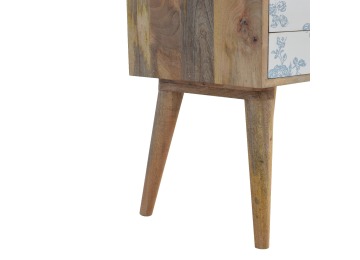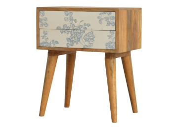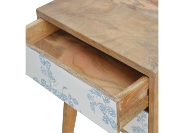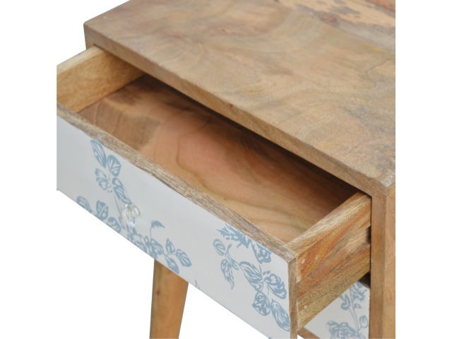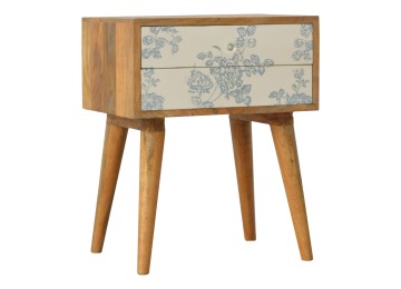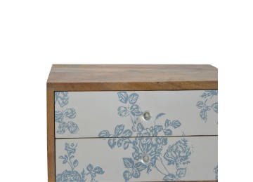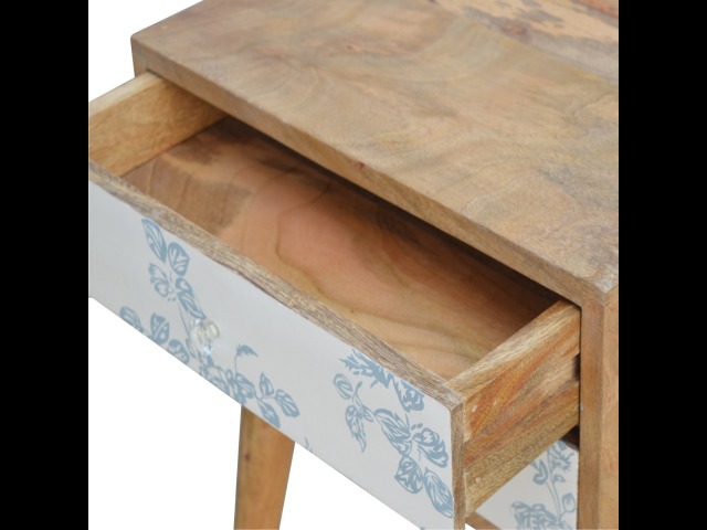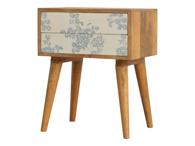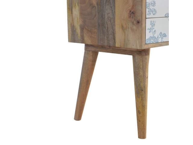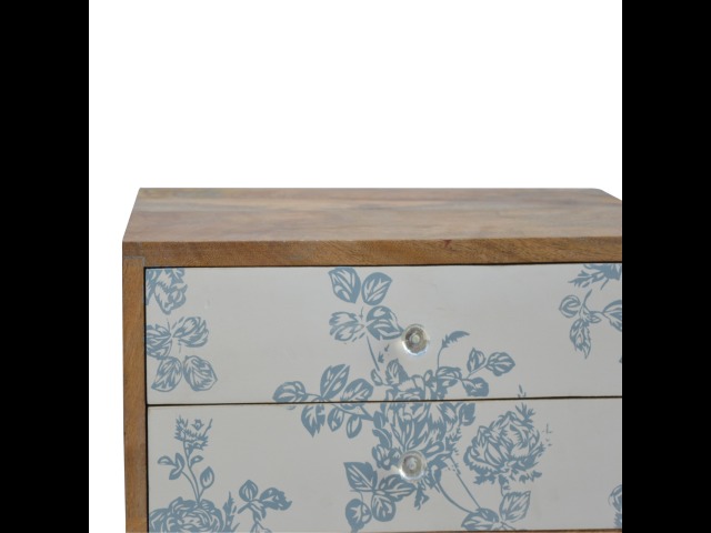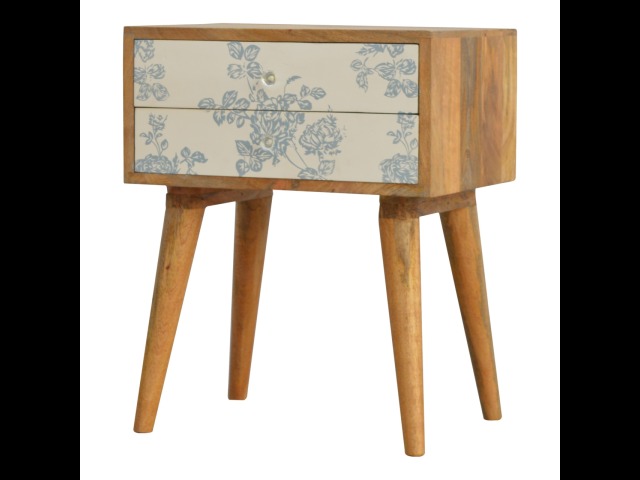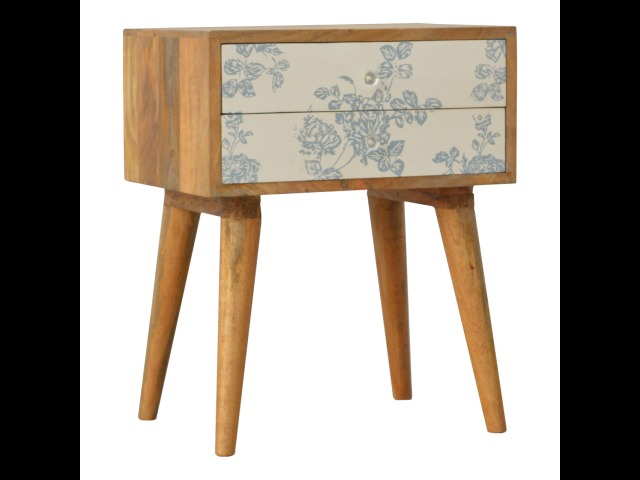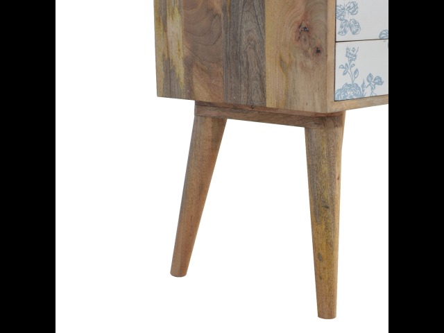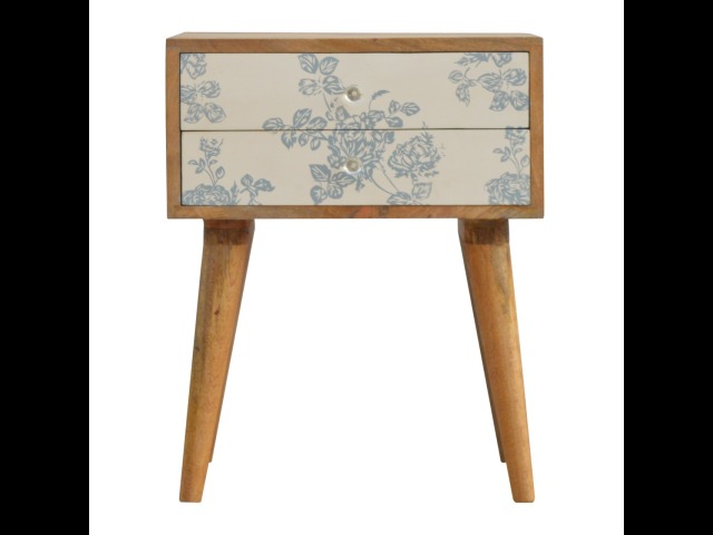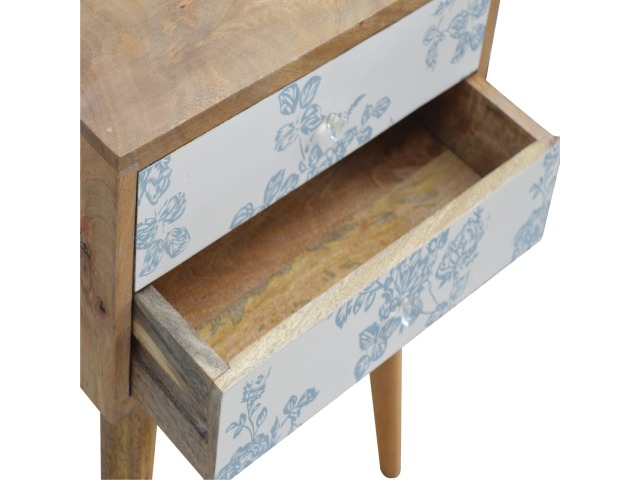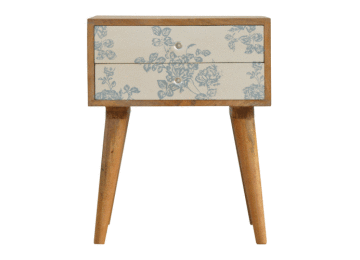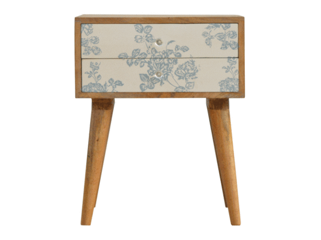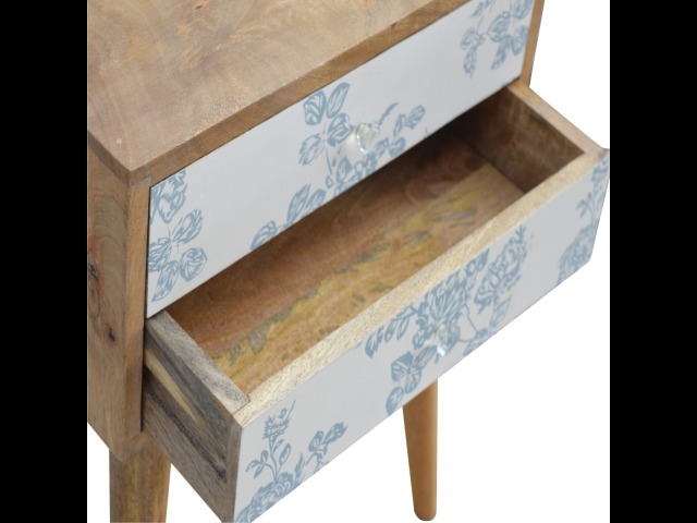 This bedside table is a versatile piece that will prove handy all over your home and provide storage for any bits and pieces before bed. It has been made from 100% solid mango wood with has a fine oak-ish finish. It also comes with 2 blue floral screen printed drawers that have glass knobs and 4 Nordic style legs.
