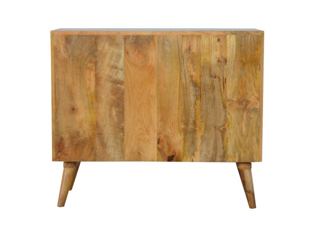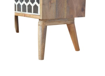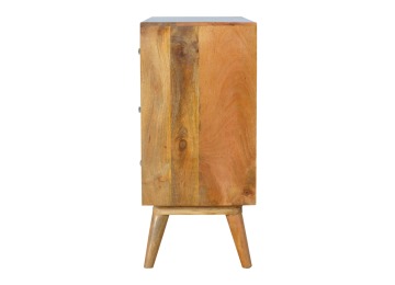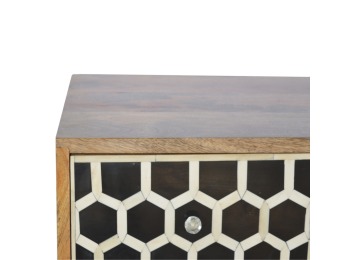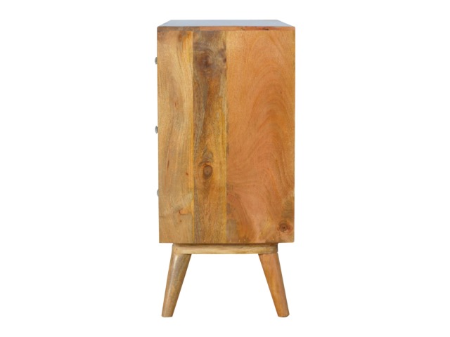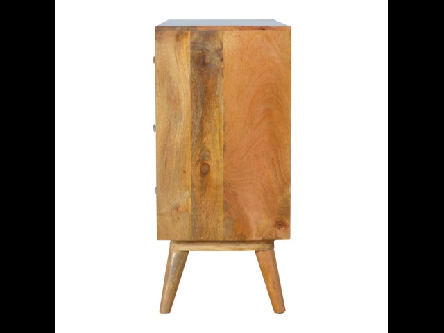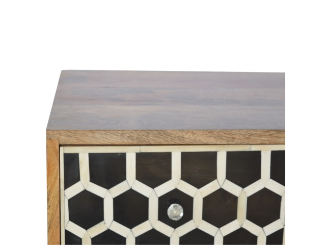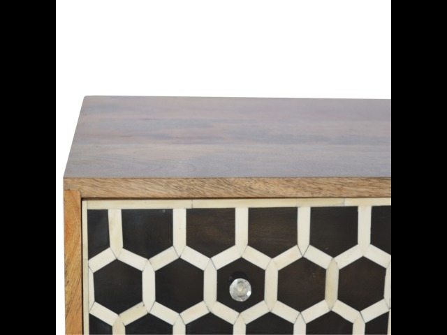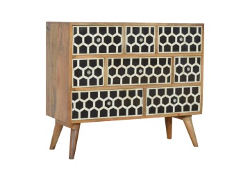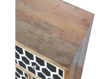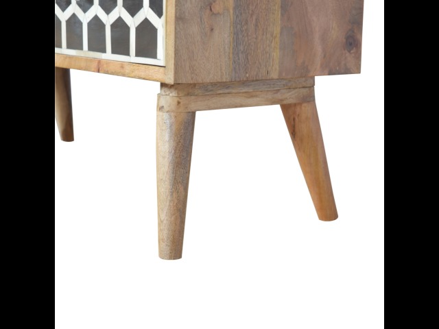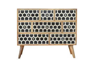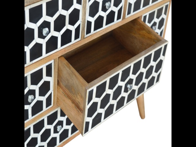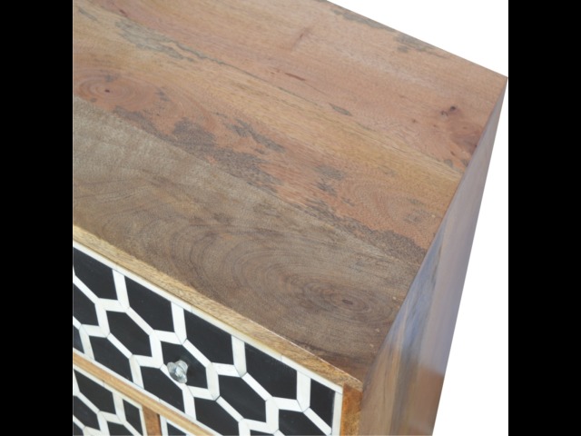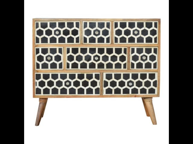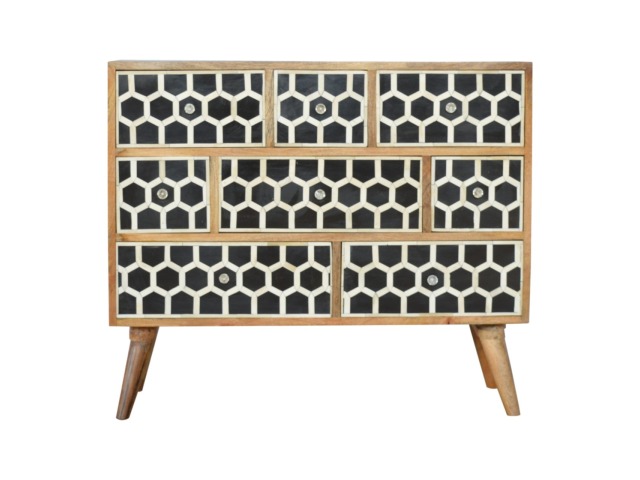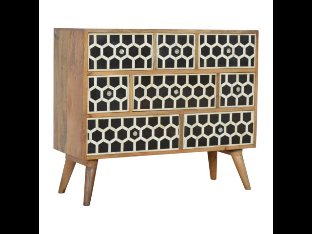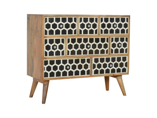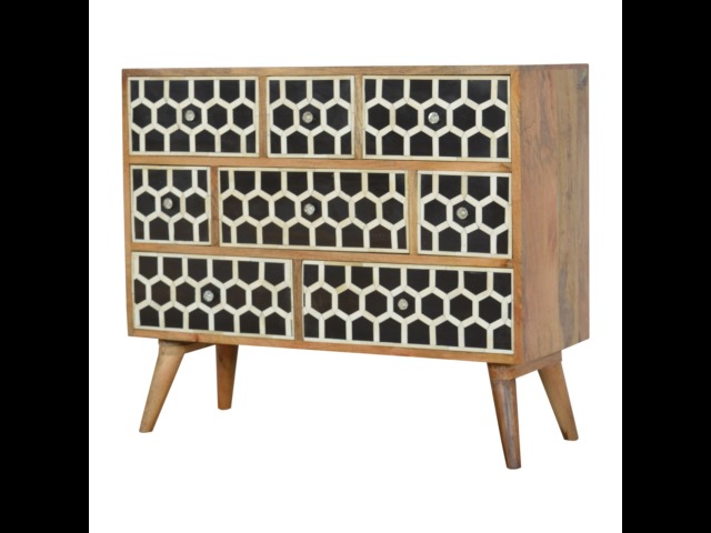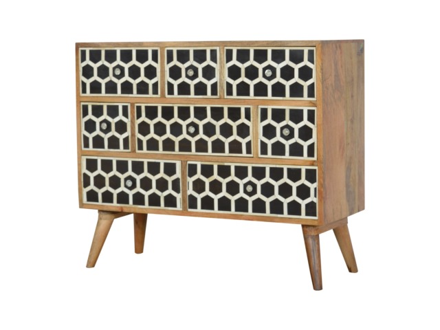This 8 drawer chest is the perfect piece for any bedroom. It is an essential piece of everyday household furniture giving you space to store clothing as well as providing a surface for all your bits and pieces. It features bone inlay drawer fronts with glass knobs and is made from 100% solid mango wood in a fine oak-ish finish with Nordic style legs. The bone inlay is sourced responsibly from deceased animals such as camels, goats, and buffaloes.
