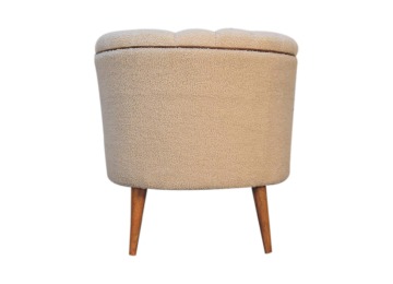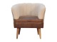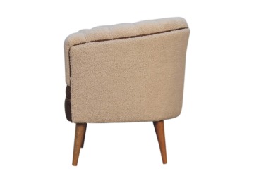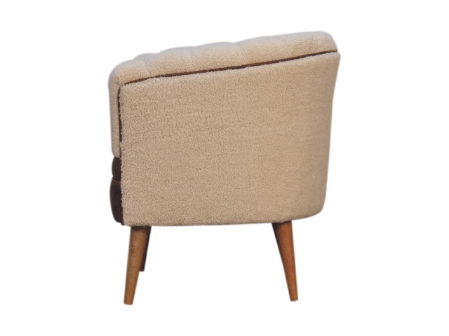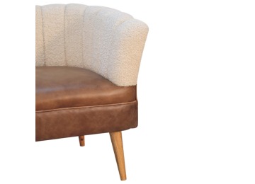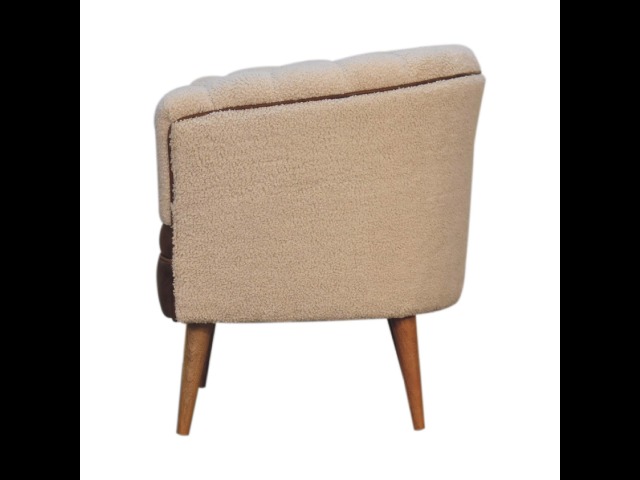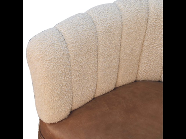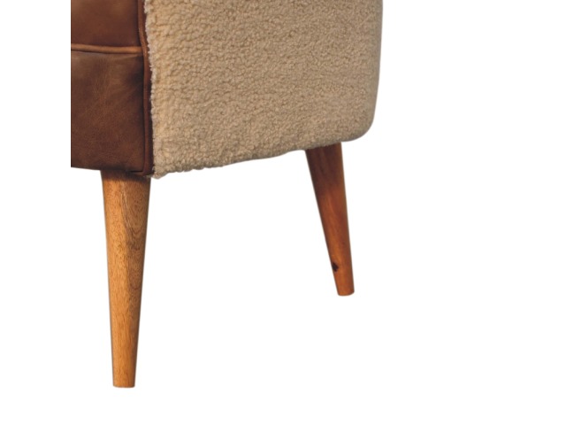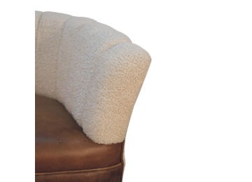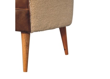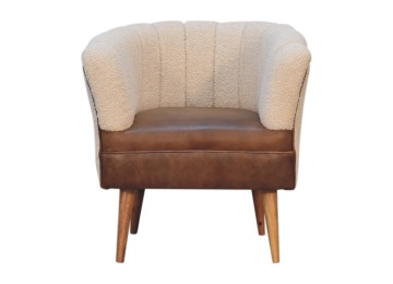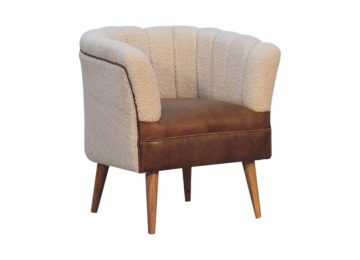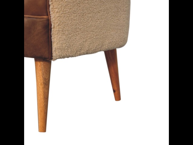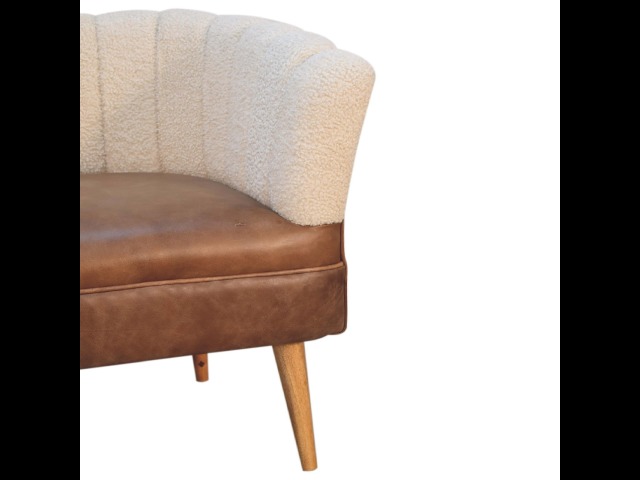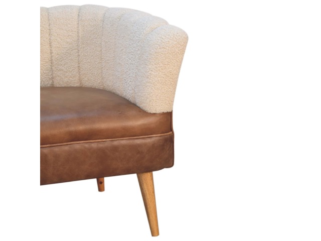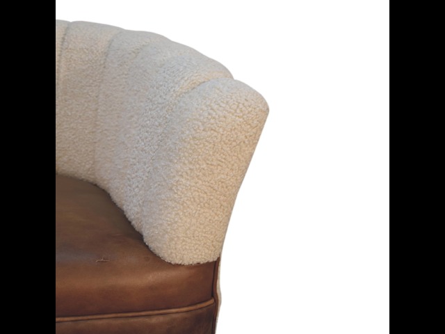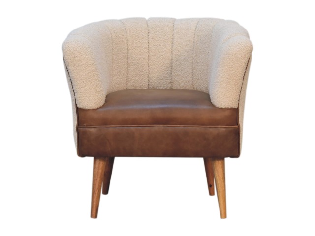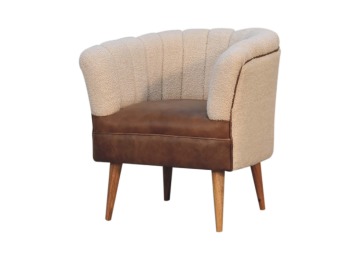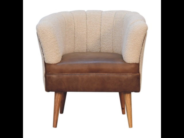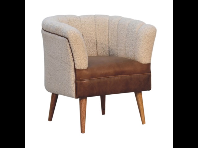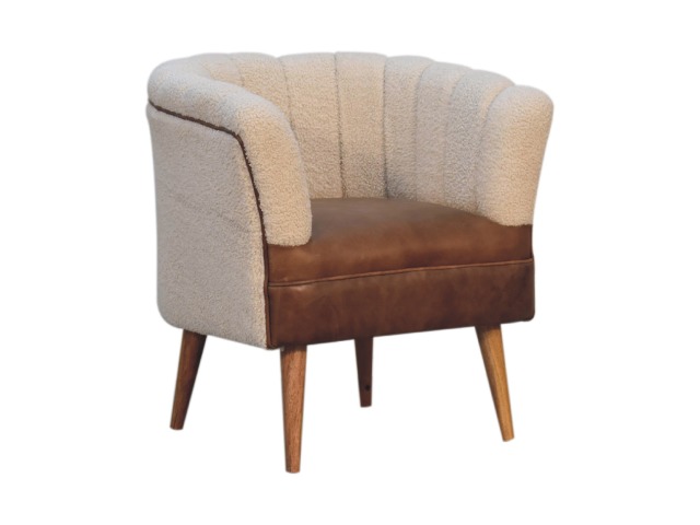 Derived from the French word for 'curled' or 'ringed' yarn or fabric. This handwoven upholstered armchair is made of 100% cotton and natural yarn, combining a buffalo hide leather seat and noridc style legs constructed from 100% solid mango wood in a oak-ish finish, for added contrast.