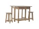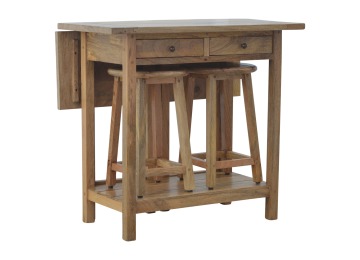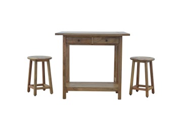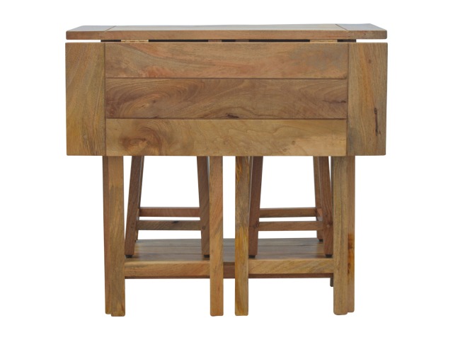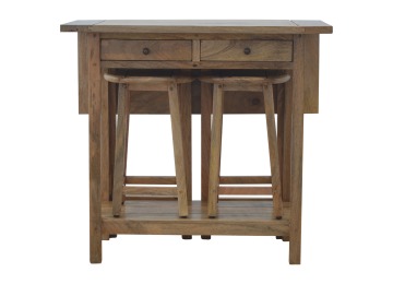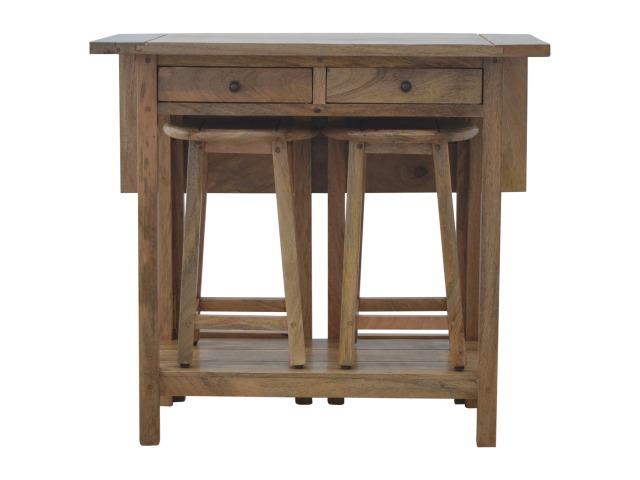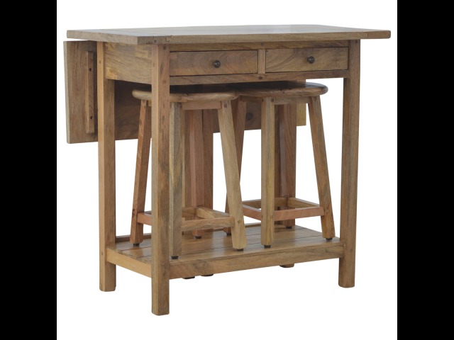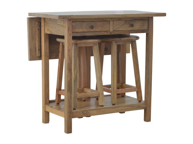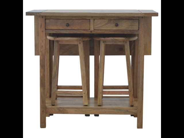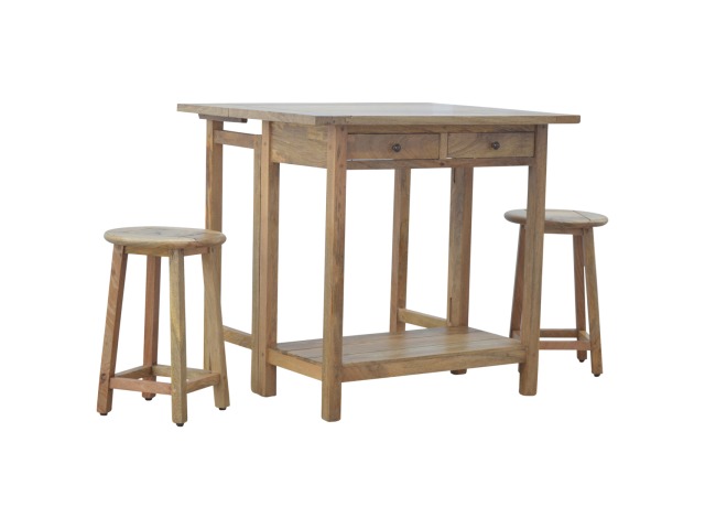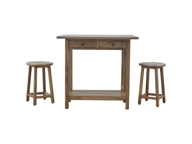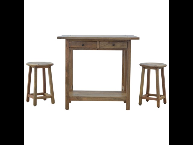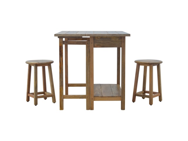 This breakfast table set is fully constructed from 100% solid mango wood and has a fine oak-ish finish. It comes with 2 strong and compact little wooden stools, which are very sturdy yet light enough to move around easily, and can be tucked away on the shelf under the table when not in use. It is ideal for small kitchens but can also be extended when needed. The perfect addition to any kitchen.
