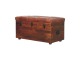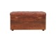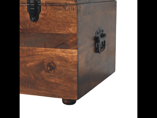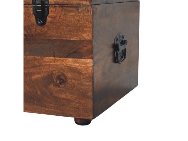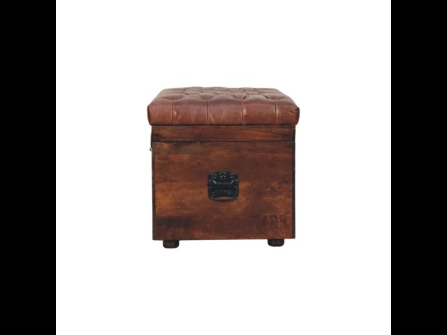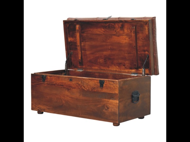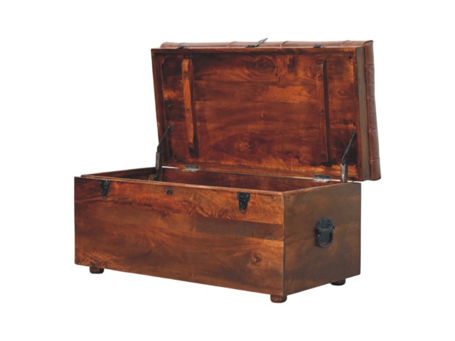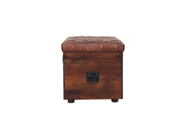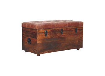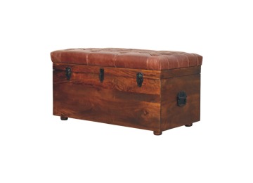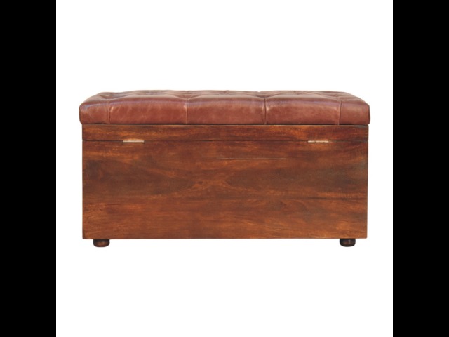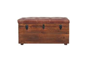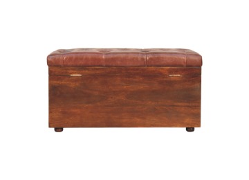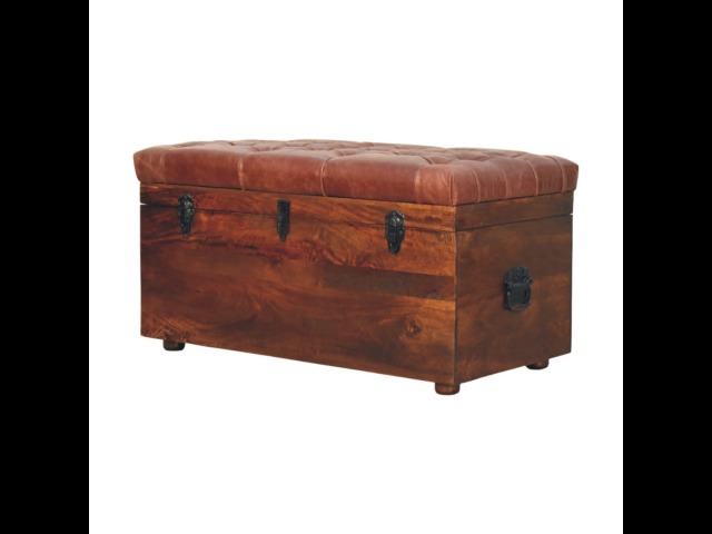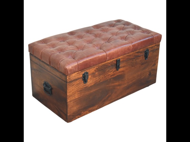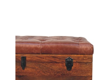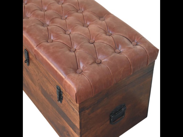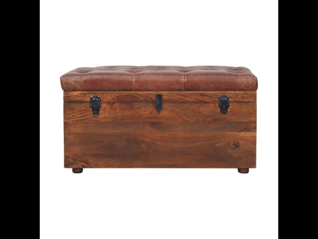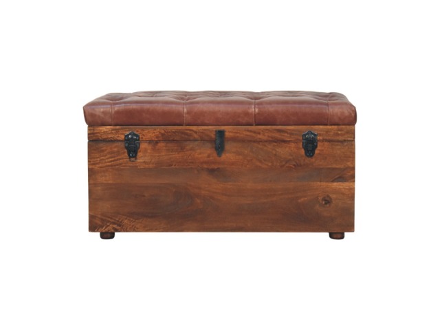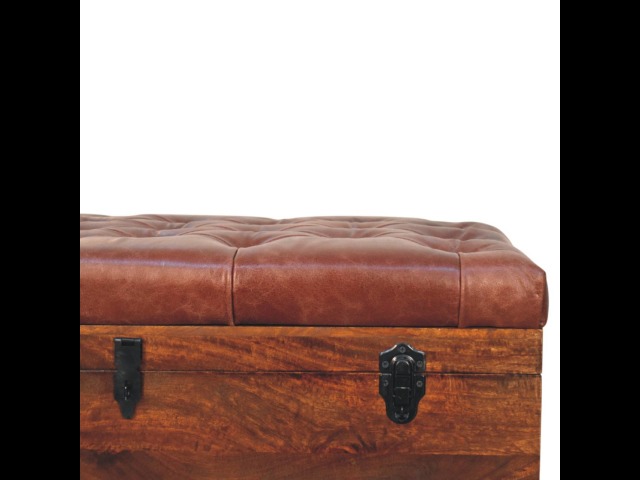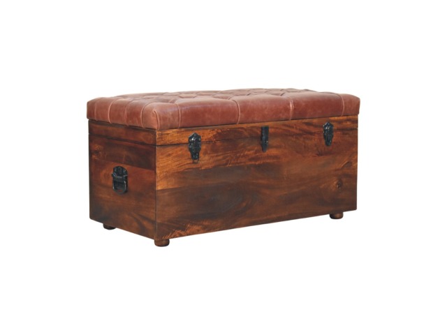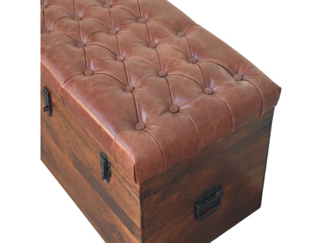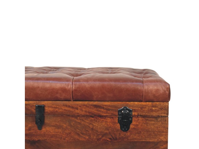 Combining rustic charm with practical functionality, this storage trunk is handcrafted from 100% Solid Mango Wood in a warm California Walnut finish. The hand-tufted design on the plush seat, upholstered in Buffalo hide leather, adds a classic touch of sophistication and comfort. Featuring sturdy metal latches and ample storage space, it keeps your belongings organized and out of sight while enhancing your decor. Perfect for entryways, living rooms, or bedrooms, this versatile piece brings timeless style and sustainable craftsmanship to your home. Its natural wood grain, durable construction, and elegant detailing make it a unique and lasting addition to any space.
