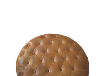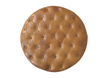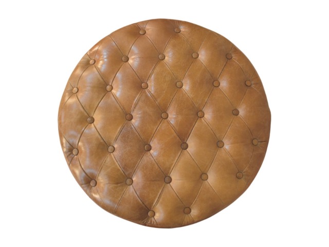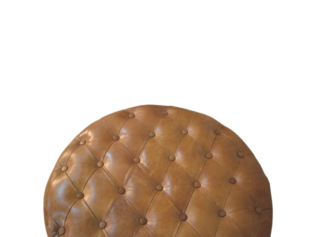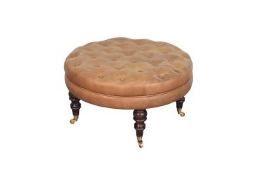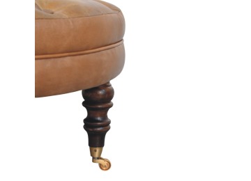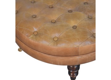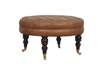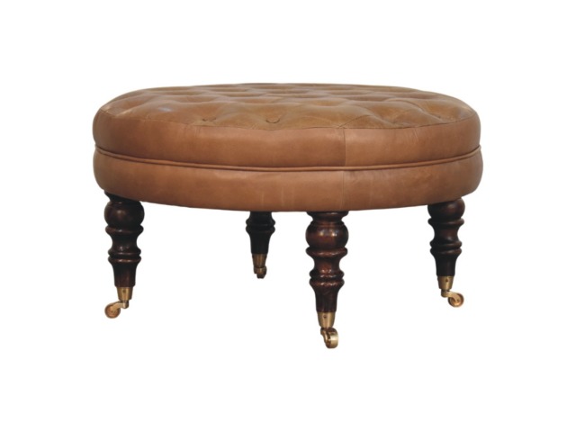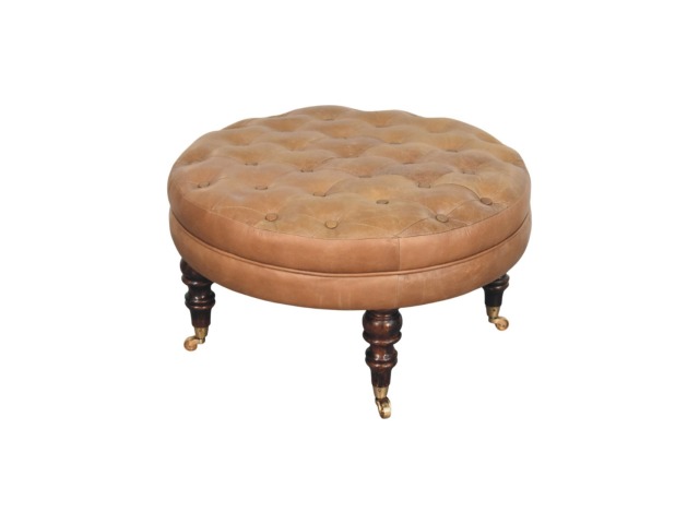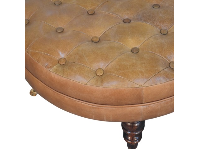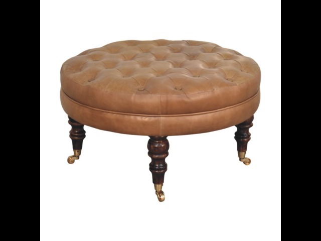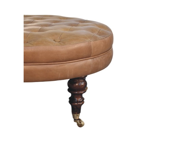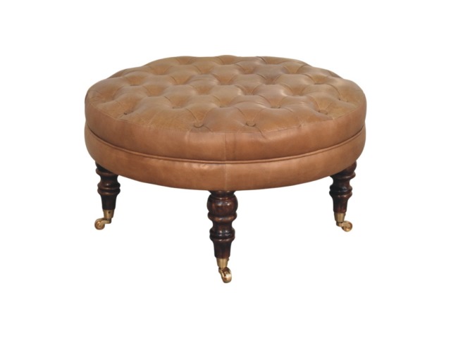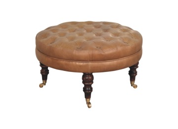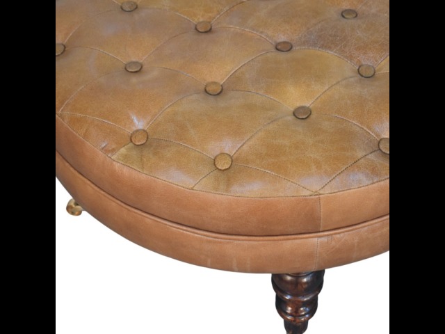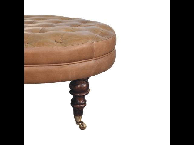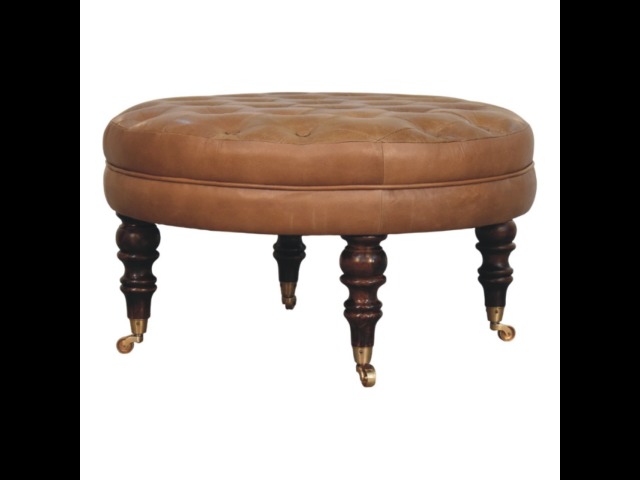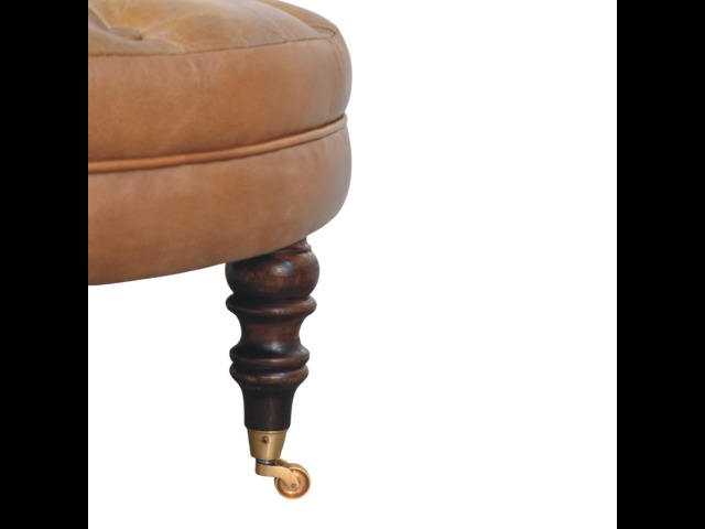 Bringing a touch of heritage charm to your home, this round ottoman is upholstered in 100% Buffalo hide leather with a luxurious hand-tufted design. The deep button detailing adds timeless elegance, while the handcrafted turned legs made from 100% Solid Mango Wood in rich walnut finish enhance its classic appeal. Fitted with brass castor wheels, it offers effortless mobility, making it a versatile addition to living rooms, bedrooms, or entryways. Whether used as a footrest, accent piece, or extra seating, this ottoman combines sophisticated craftsmanship with practical functionality for a refined and inviting space.