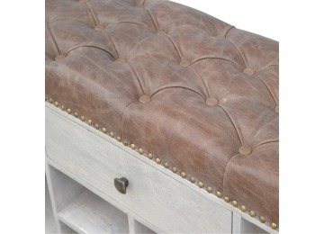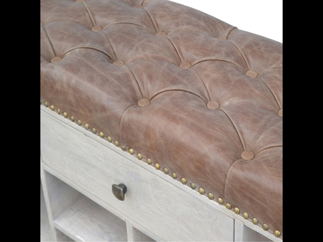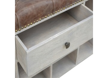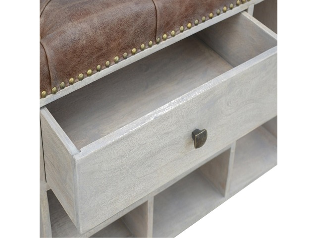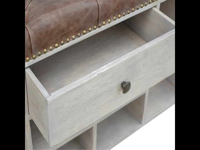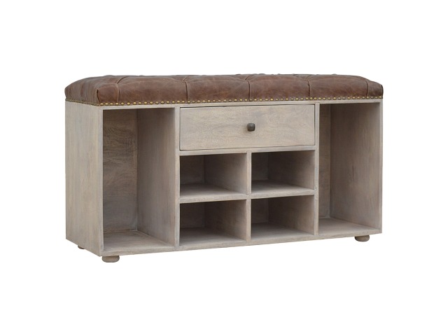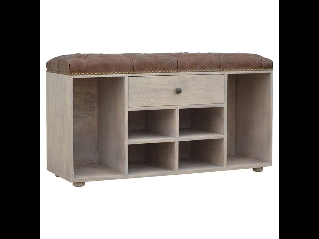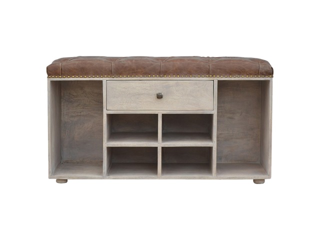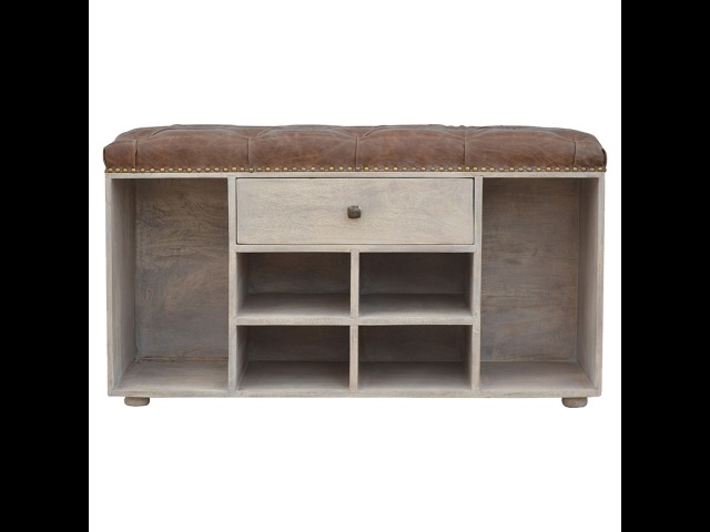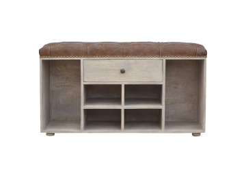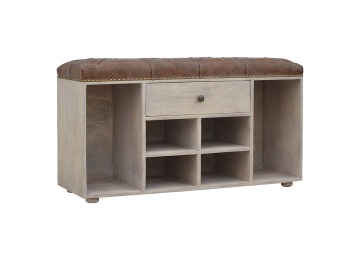Petite, practical and extremely useful. You’ll love this open shoe storage unit as you walk past your hallway. This shoe cabinet is an amazing piece of furniture with slots for shoes as well as boots. The upholstered buttoned top seat gives it a comfy feel to sit & relax on the move. It is constructed from 100% solid mango wood and the top is upholstered in multi tweed. Other features include 4 bun feet which have a fine oak-ish finish and 1 drawer that comes with a shiny knob handle. A must have for every home.