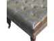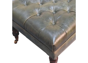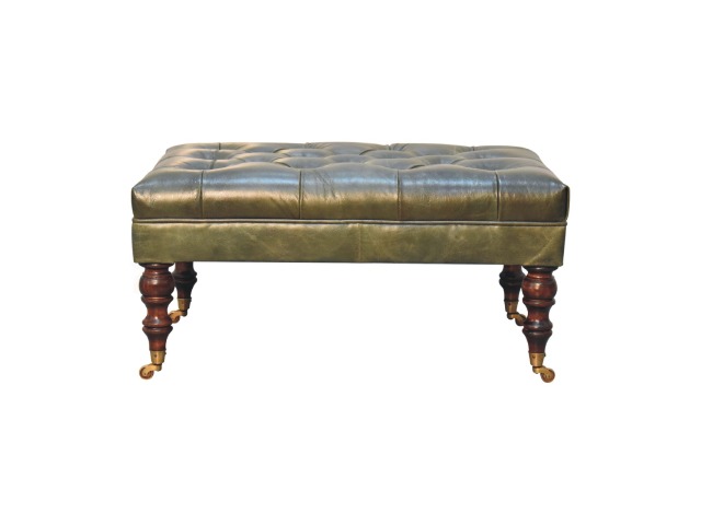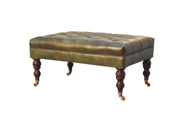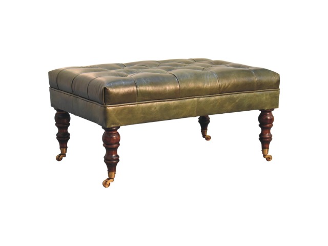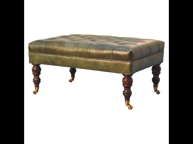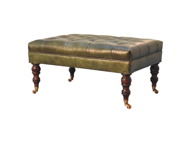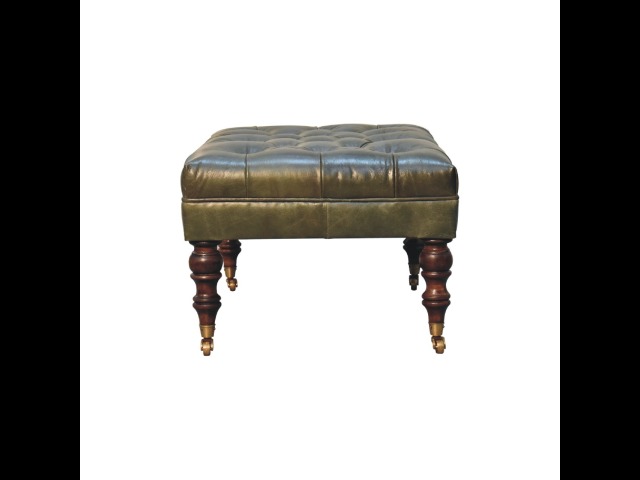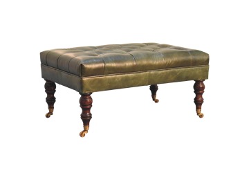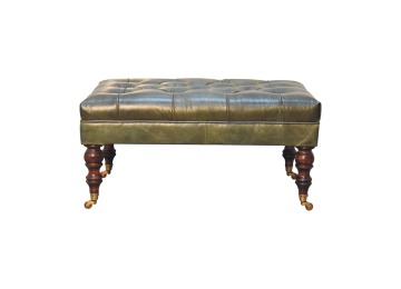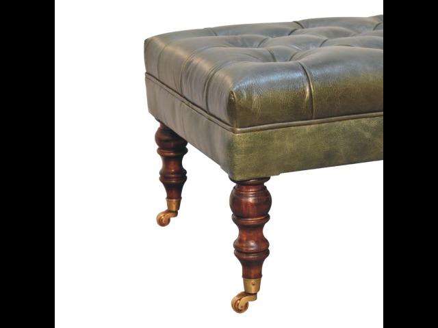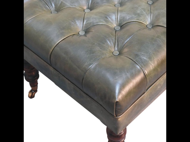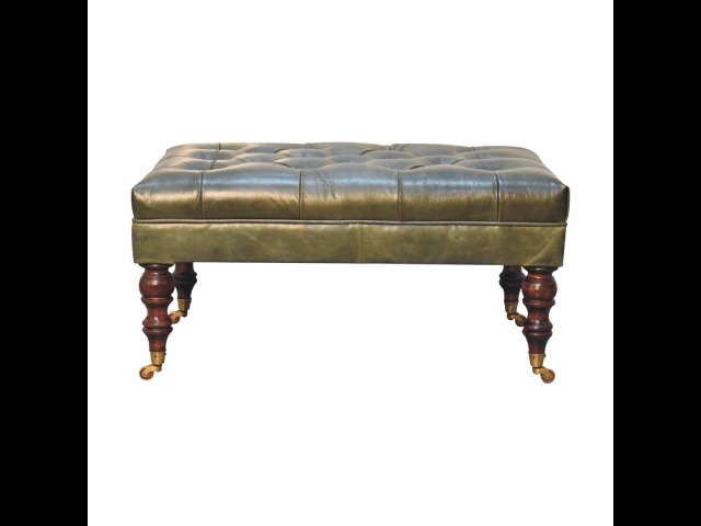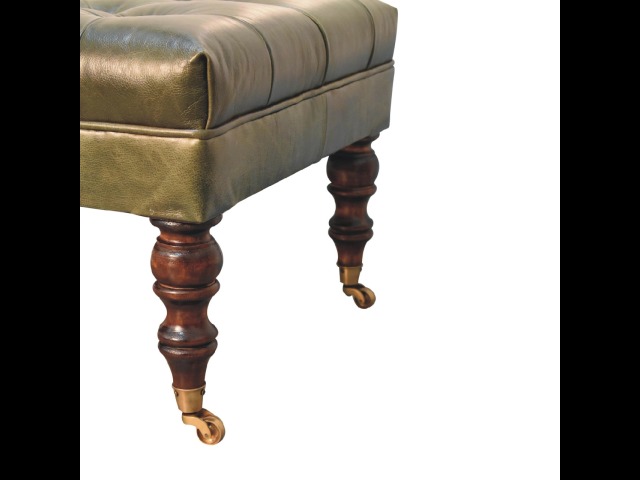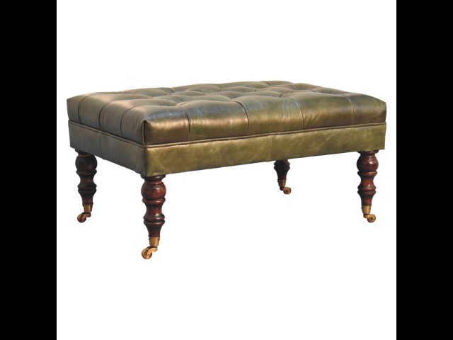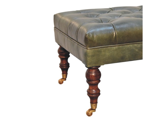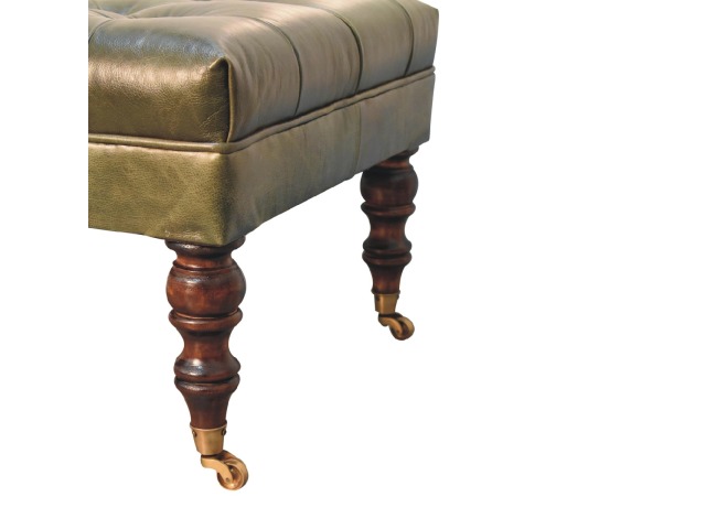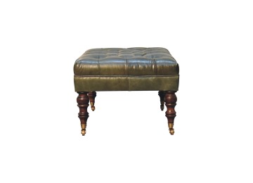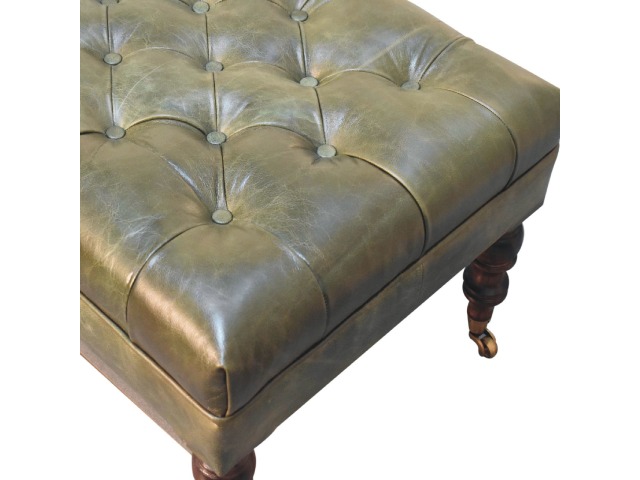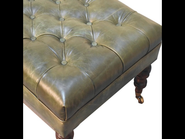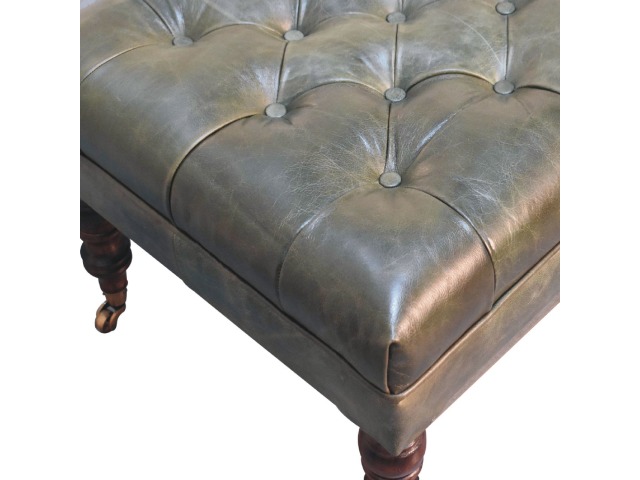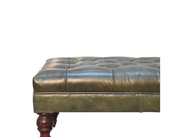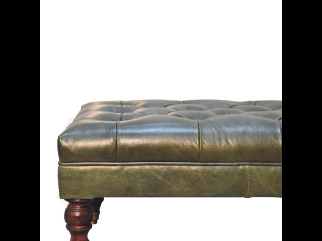 Combining comfort and practicality, this ottoman is upholstered in 100% buffalo hide green leather, radiating luxury and durability. Crafted from 100% solid mango wood, its sturdy construction harmonizes strength with elegant grains. Hand-turned feet, finished in light walnut, add stability and artisanal charm. With a deep-buttoned top, it?s both a statement of sophistication and a functional addition to your home.