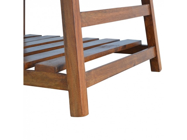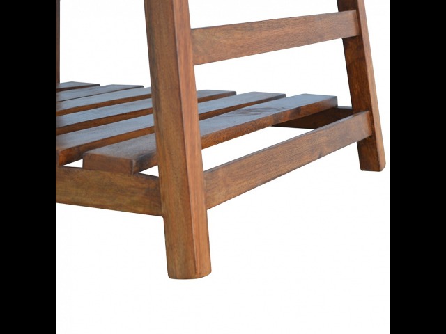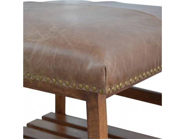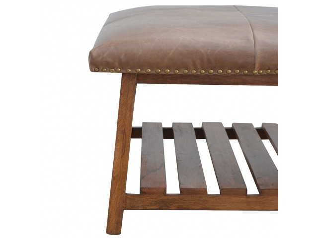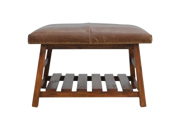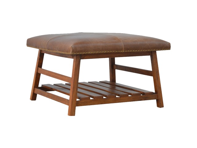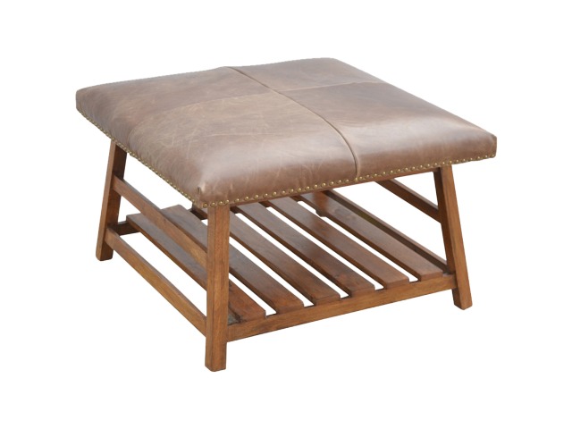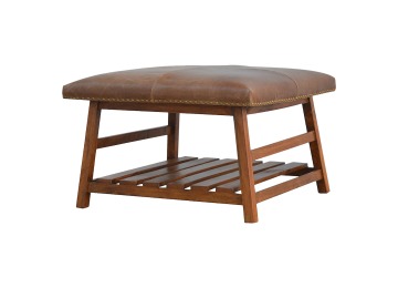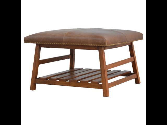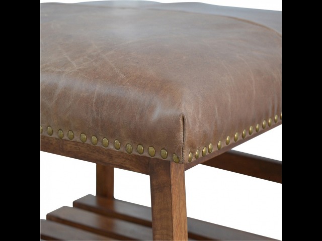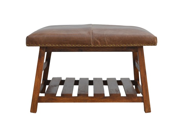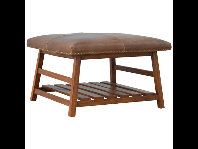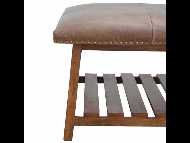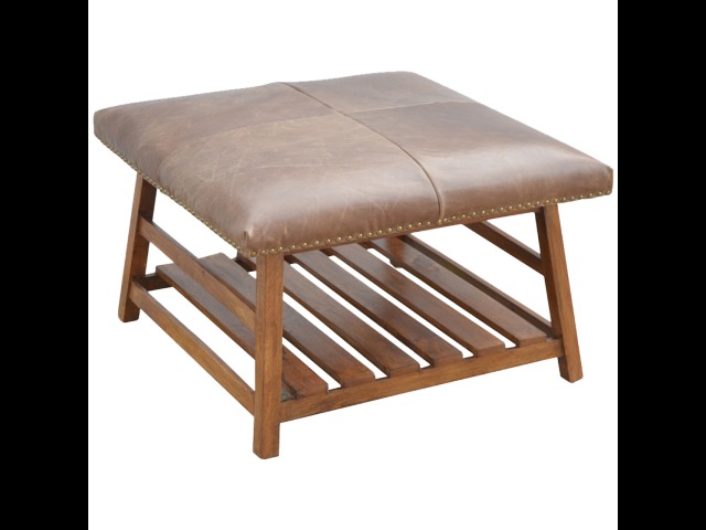 This foot stool has been constructed from 100% solid mango wood and finished in a beautiful brown buffallo hide leather. It's a stylish addition to any living space in the home with its modern and luxurious design, it features a shelf which can be used to store any books, magazine, baskets or any bits you wish to disreetly store away.