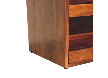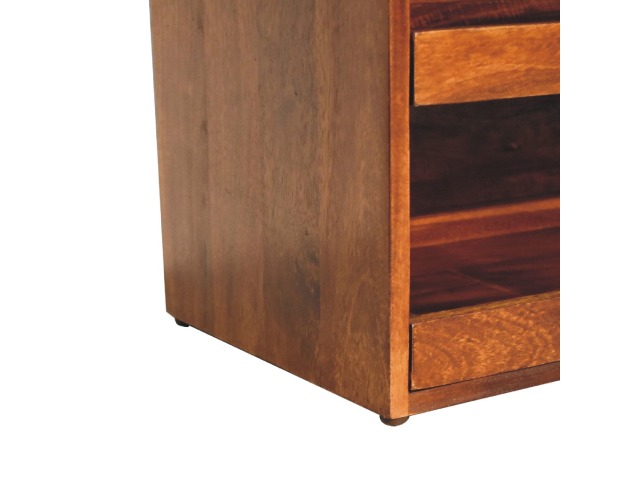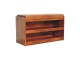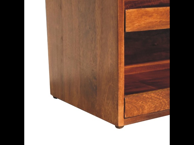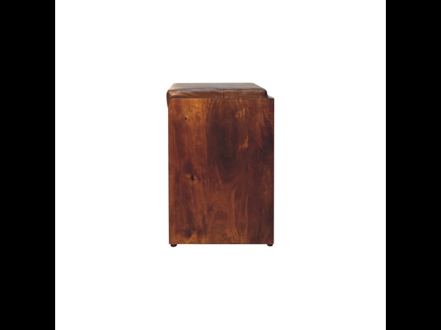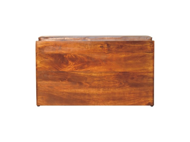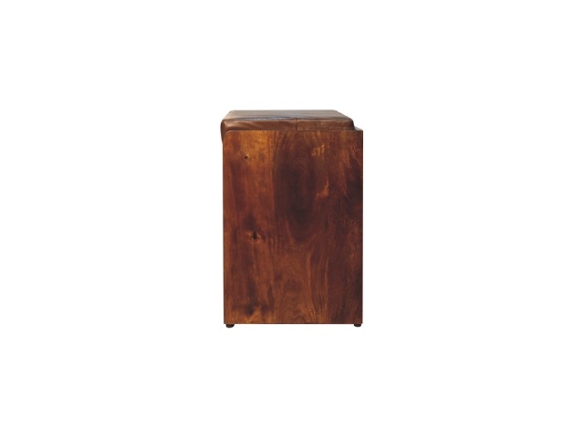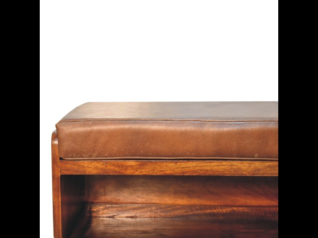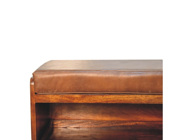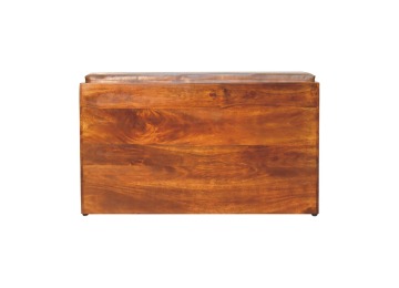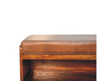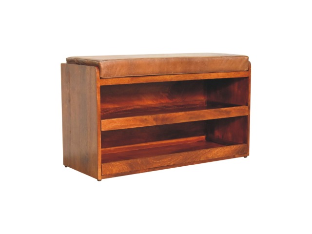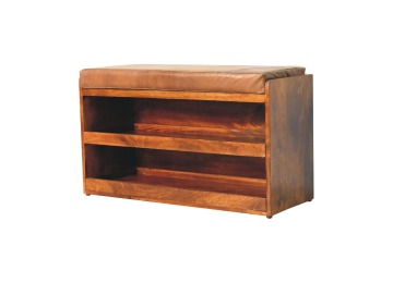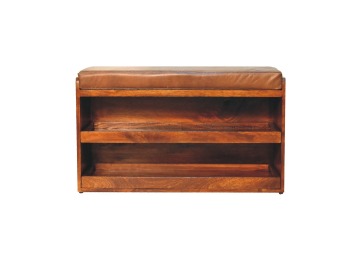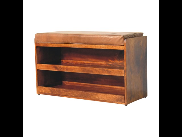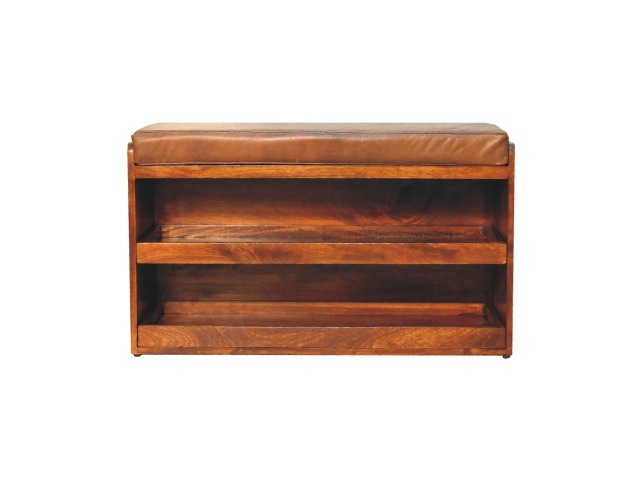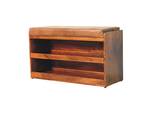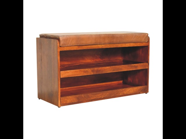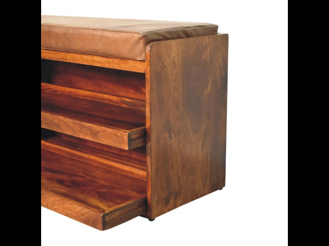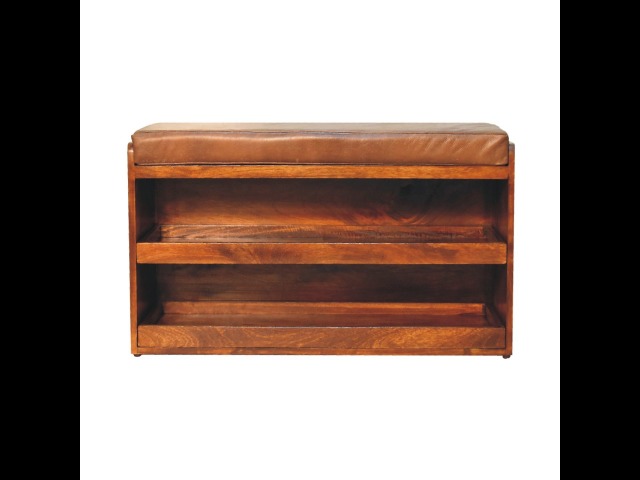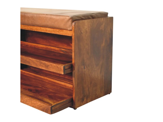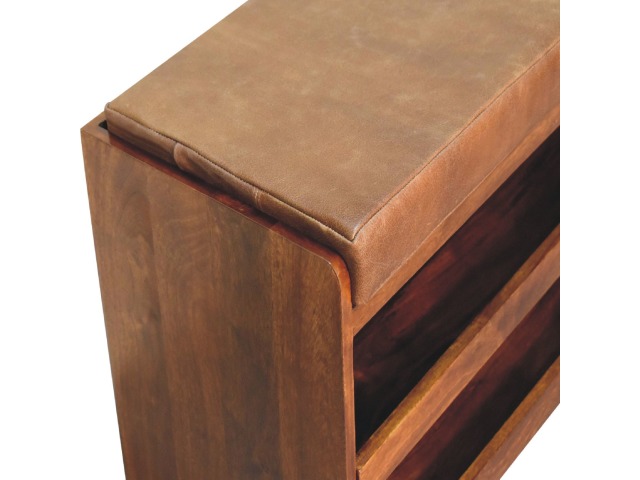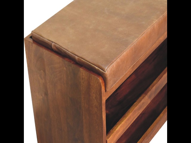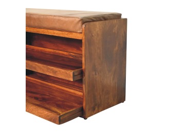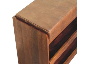 Experience the epitome of space-saving functionality with our solid mango wood shoe storage cabinet. With a luxurious buffalo brown leather top, this exquisite cabinet boasts two pull-out drawers, accommodating 6-8 pairs of shoes or boots. Elevate your hallway's allure while keeping footwear organized and easily accessible.