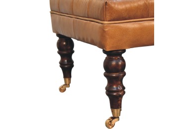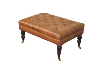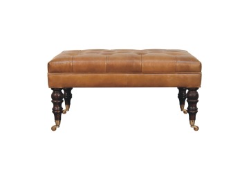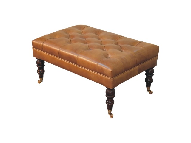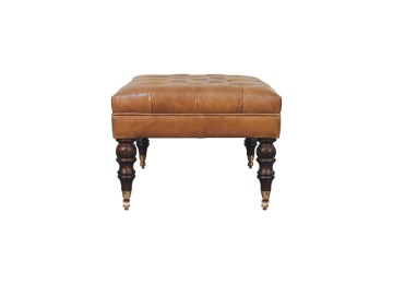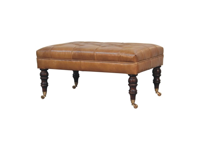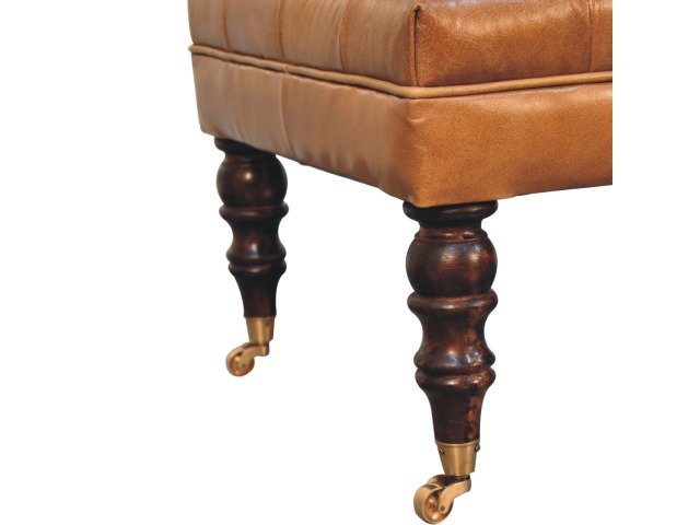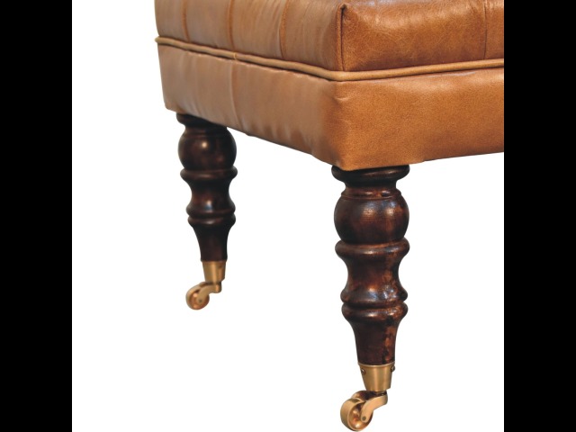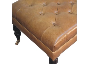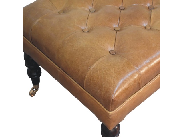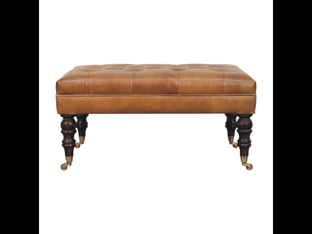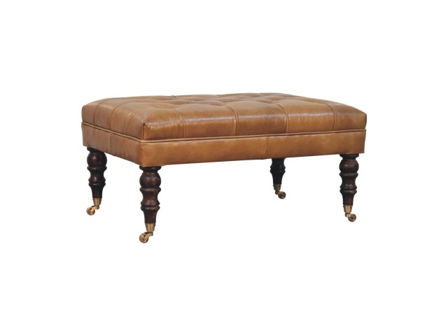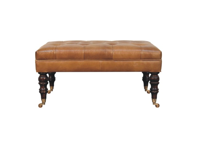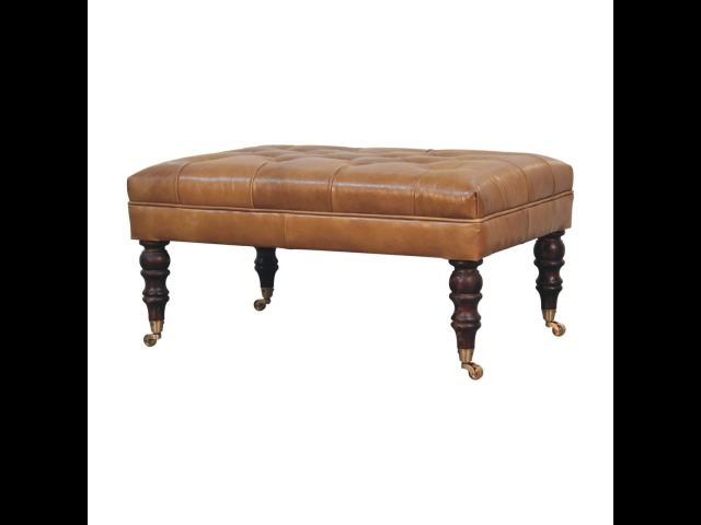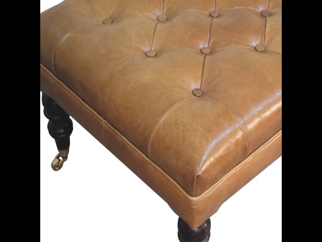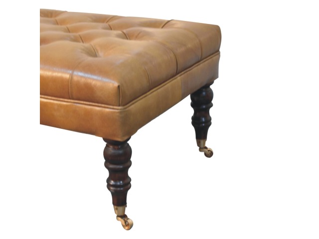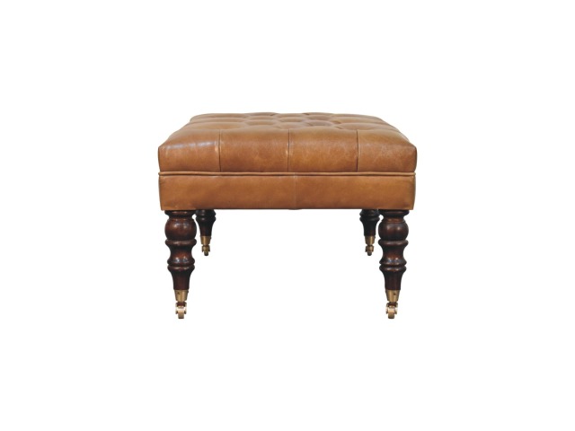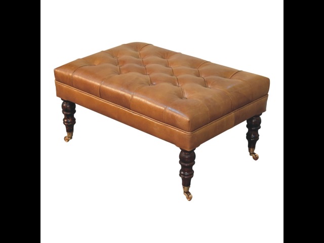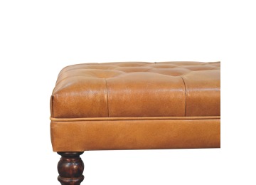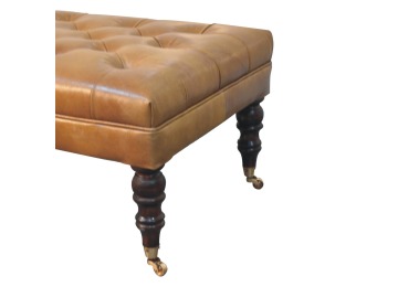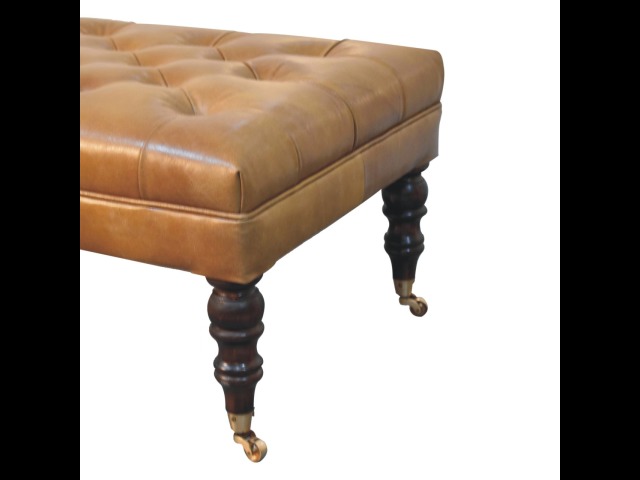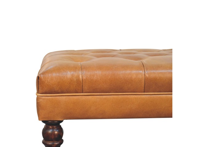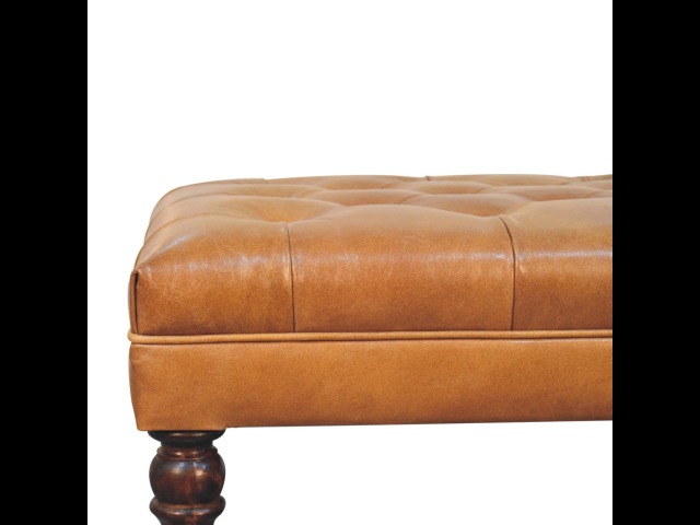 Combining comfort and practicality, this ottoman is upholstered in 100% buffalo hide brown leather, radiating luxury and durability. Crafted from 100% solid mango wood, its sturdy construction harmonizes strength with elegant grains. Hand-turned feet, finished in california walnut, add stability and artisanal charm. With a deep-buttoned top, it?s both a statement of sophistication and a functional addition to your home.