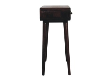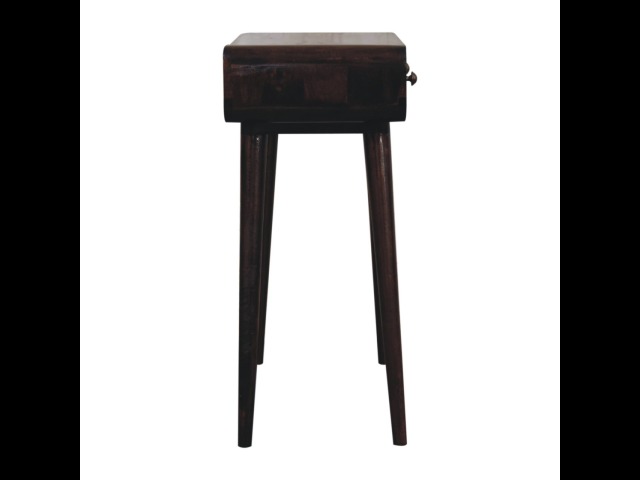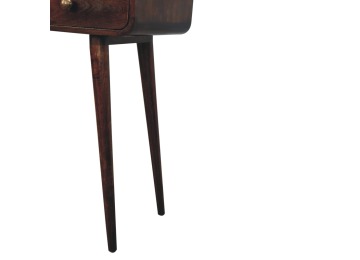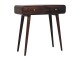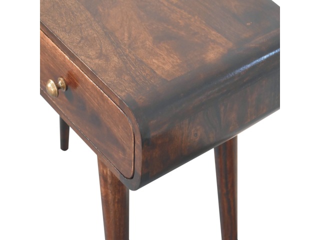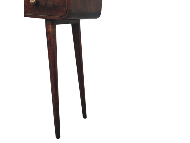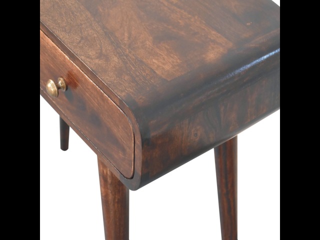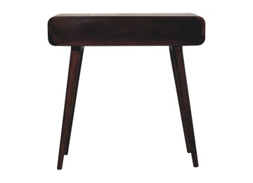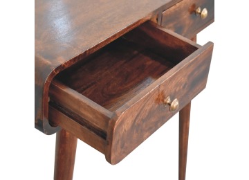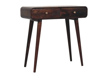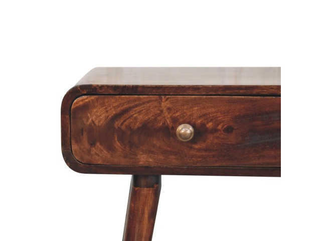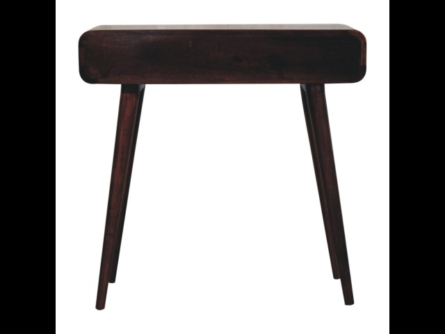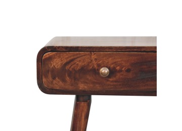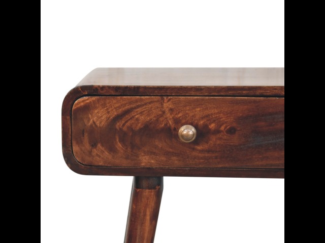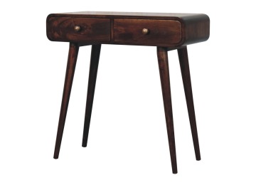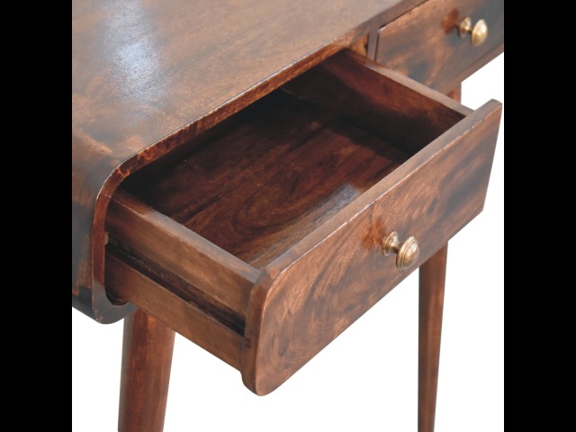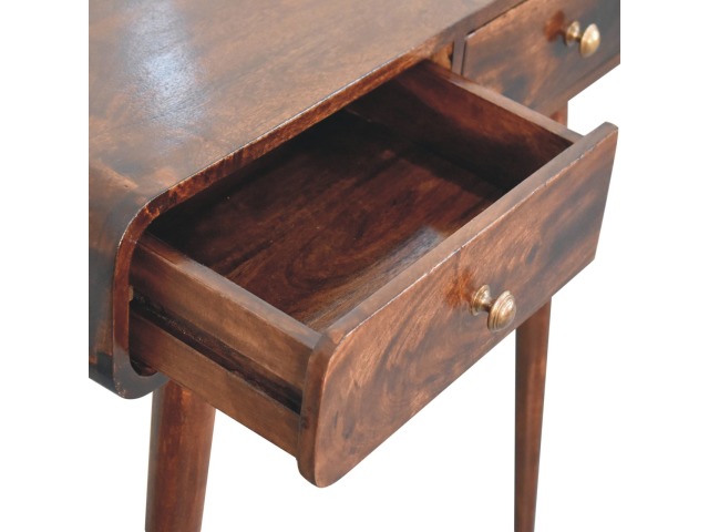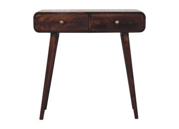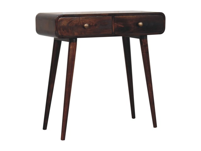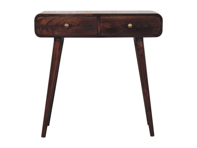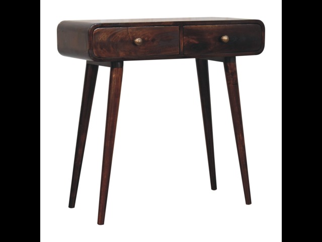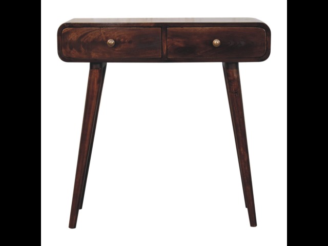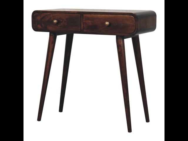 This simple, elegant console table has beautifully curved edges to fit perfectly in any living space, this 100% solid mango wood unit has been built with sustainably sourced timbers and has two drawers to help you keep your home organized by storing away any little household objects. It has shiny knobs and has a light walnut finish with 4 Nordic style legs.