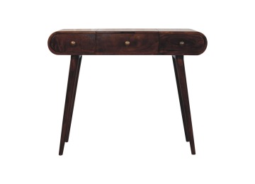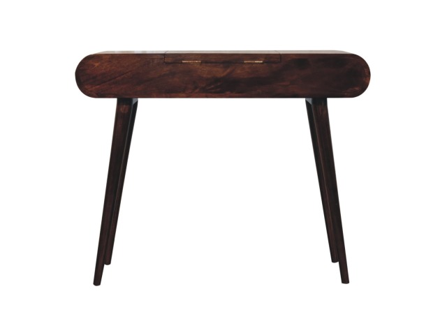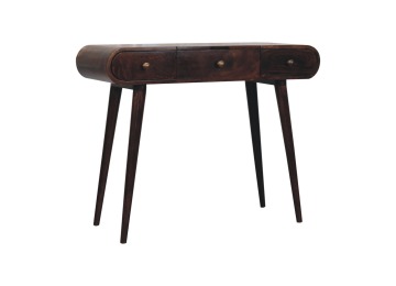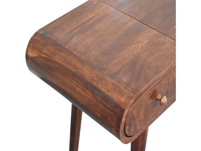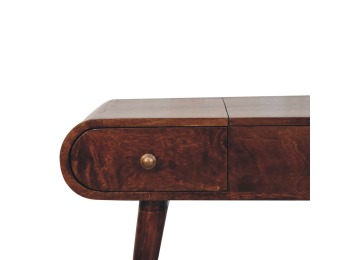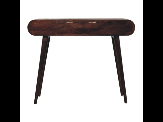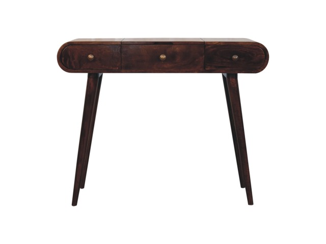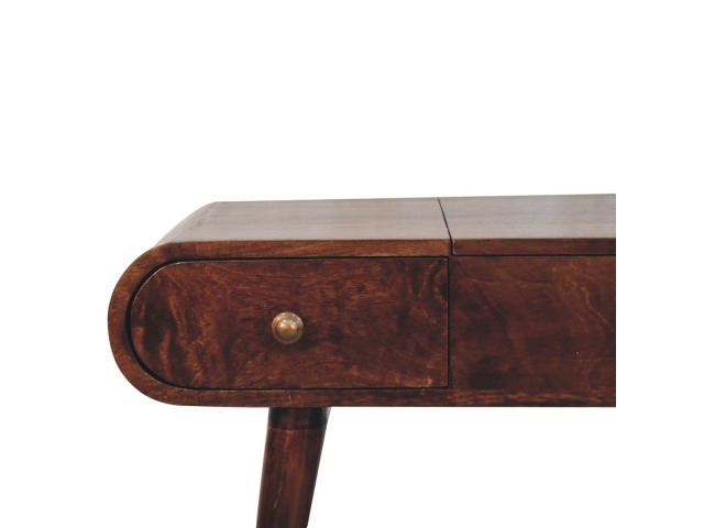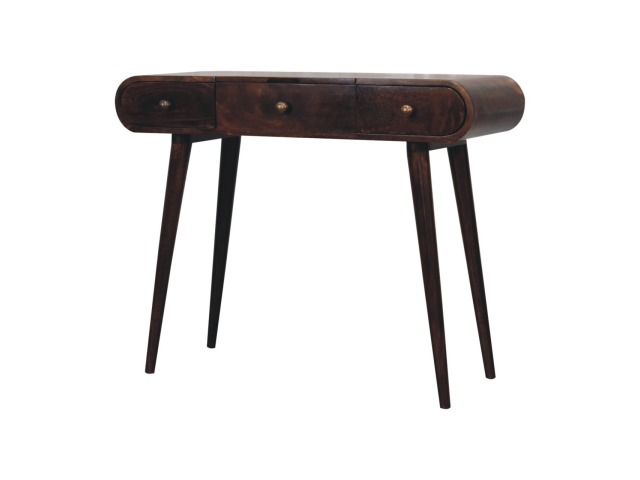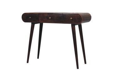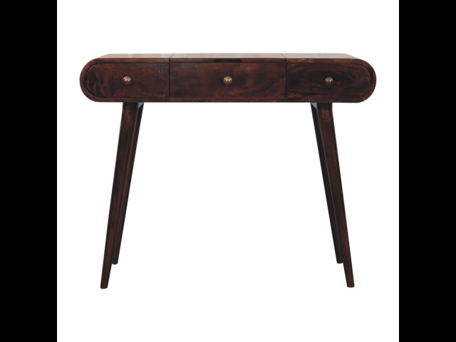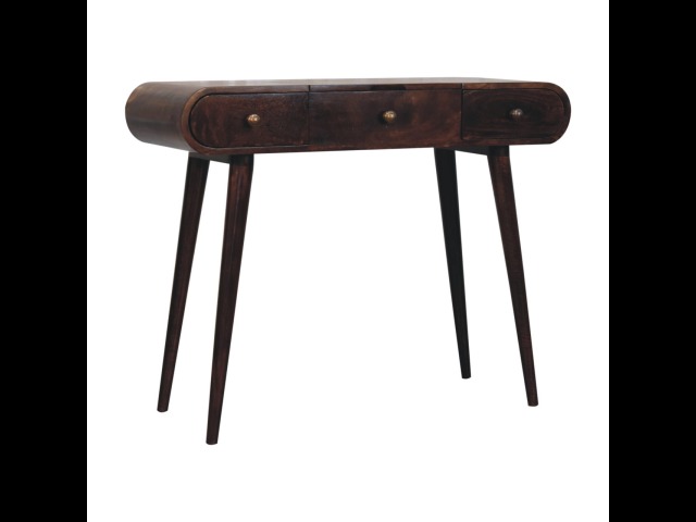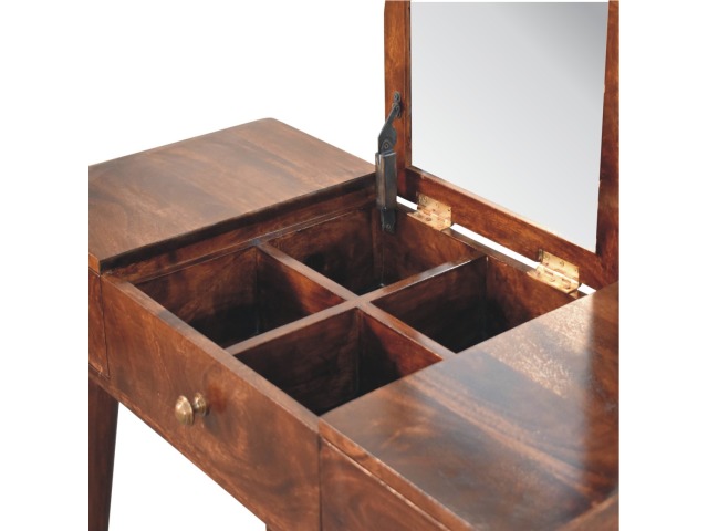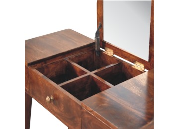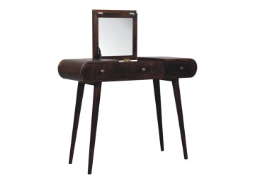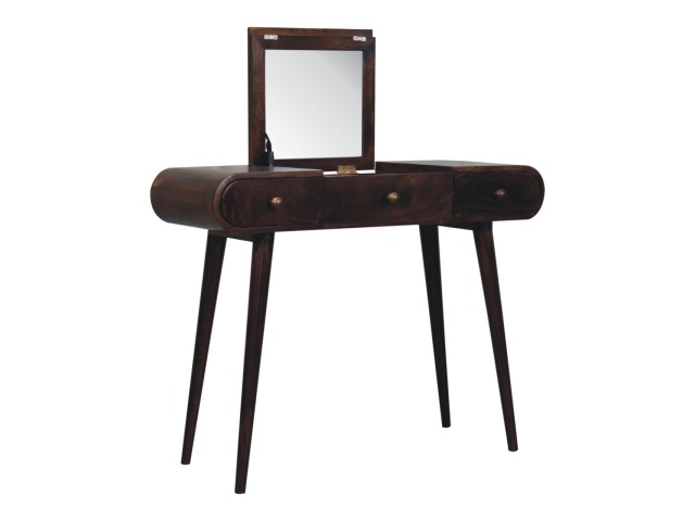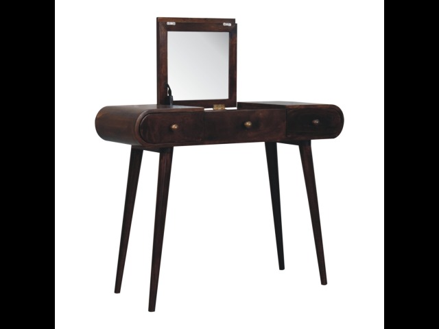 Add this beautiful yet simple dressing table to your home. Constructed from 100% solid mango wood in a california walnut finish with 3 drawers, it features Nordic style legs, a foldable mirror, and storage compartments for storing any bits and pieces such as jewellery and makeup. This is a lovely and versatile piece that will complement any room beautifully.