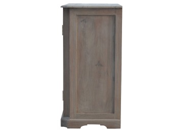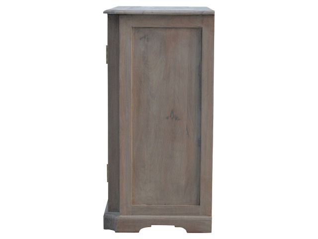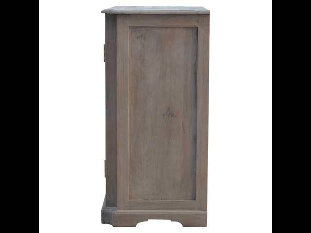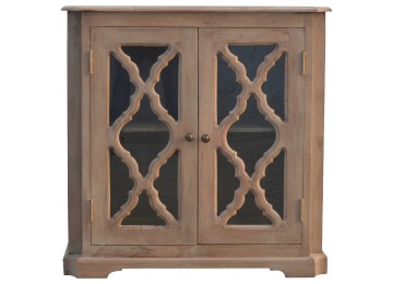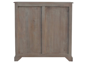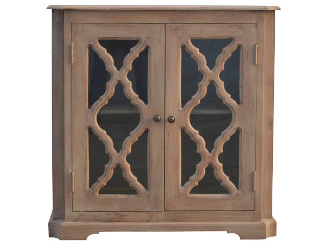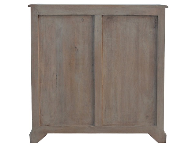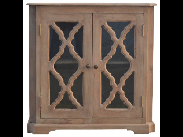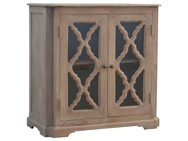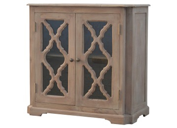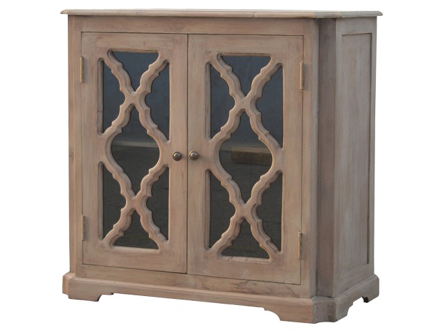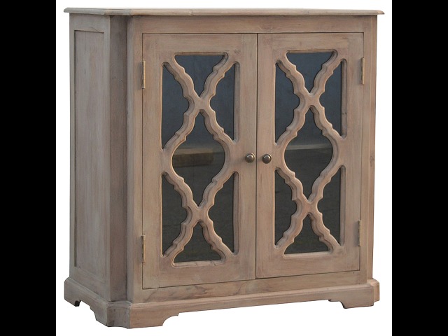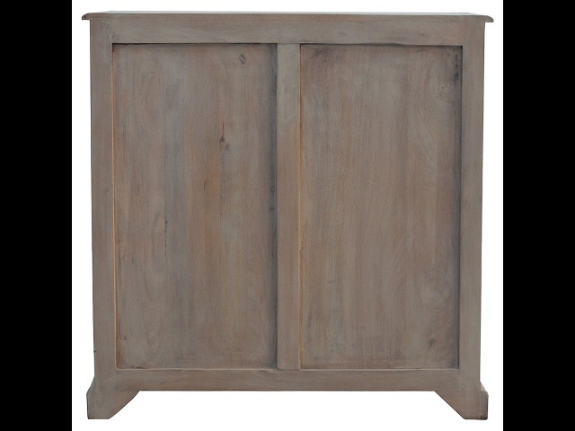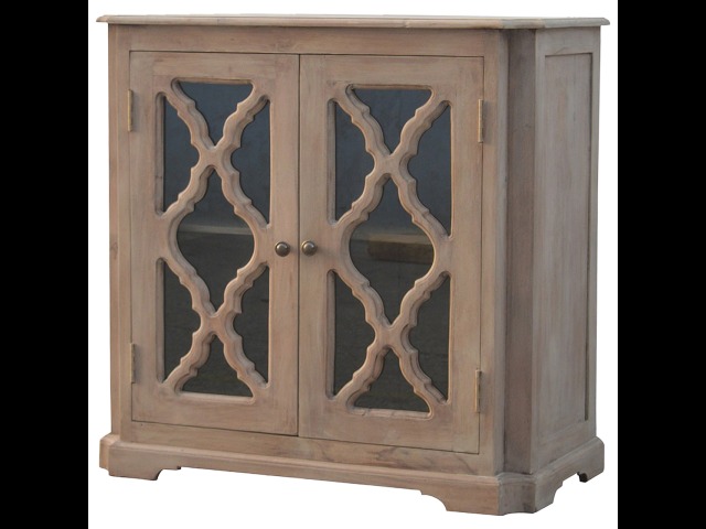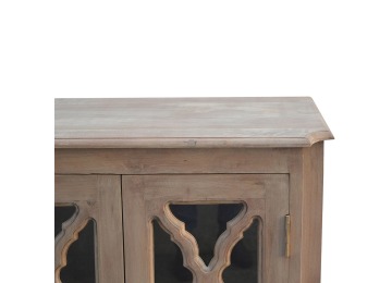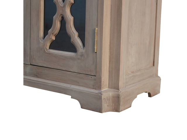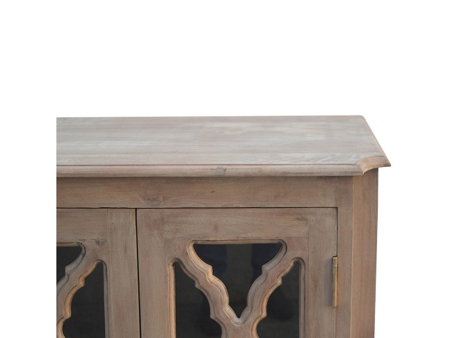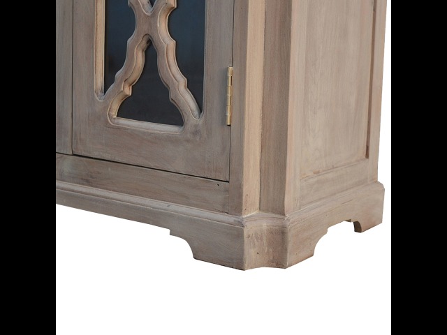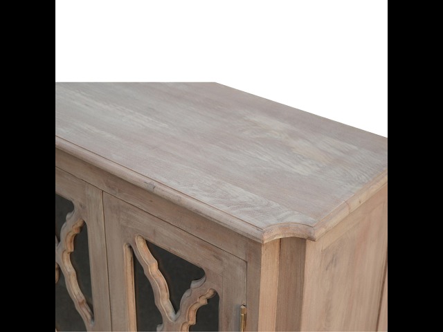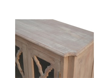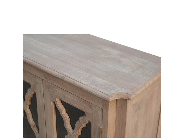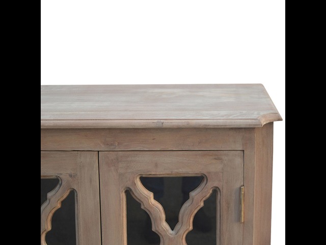 This sideboard is made from 100% solid mango wood and has smooth sun-bleached bleached finish. Product offers excellent storage space with 2 glazed door cabinets which have a solid wood pattern, and a decent size top to place your pictures and special ornaments etc. Other features include a plinth bottom, 2 round metal knob handles and a thick top. Add this stunning sideboard to your home.