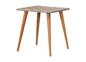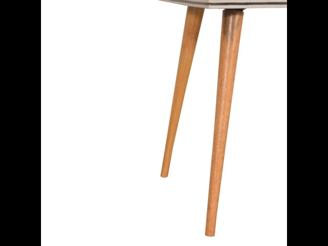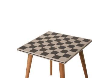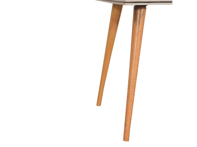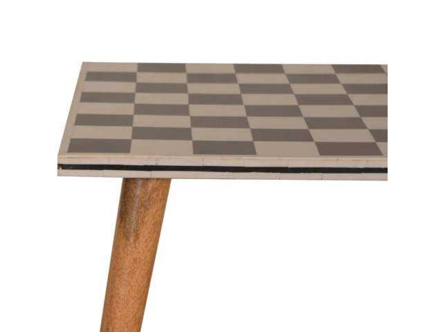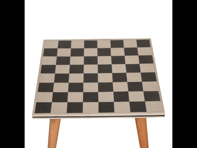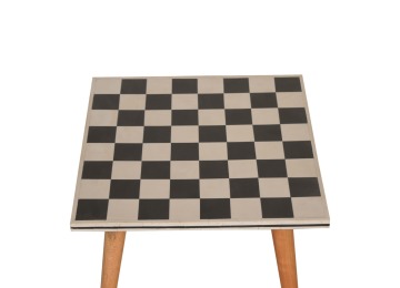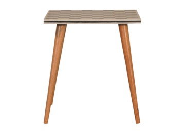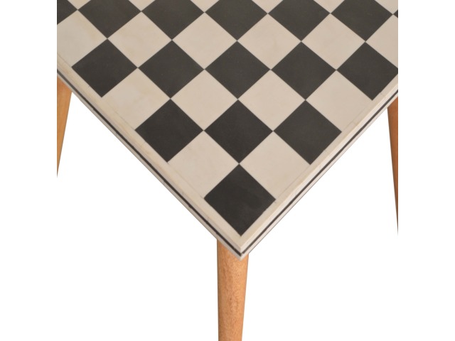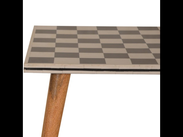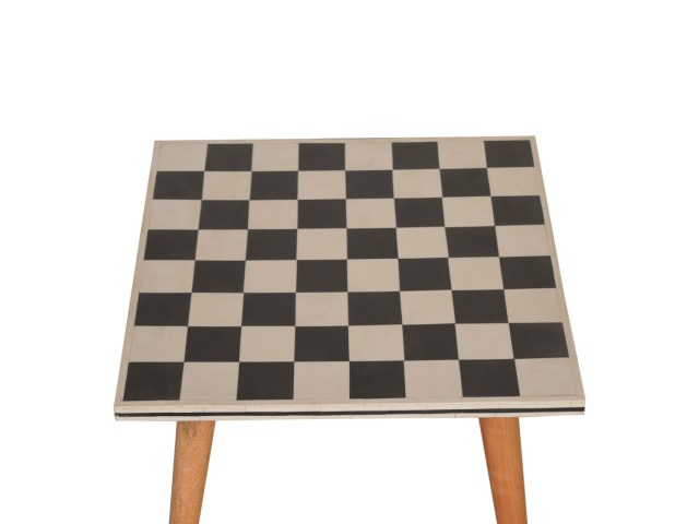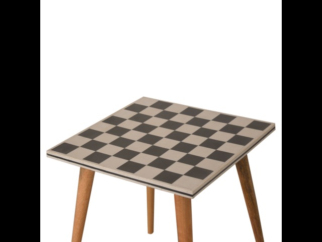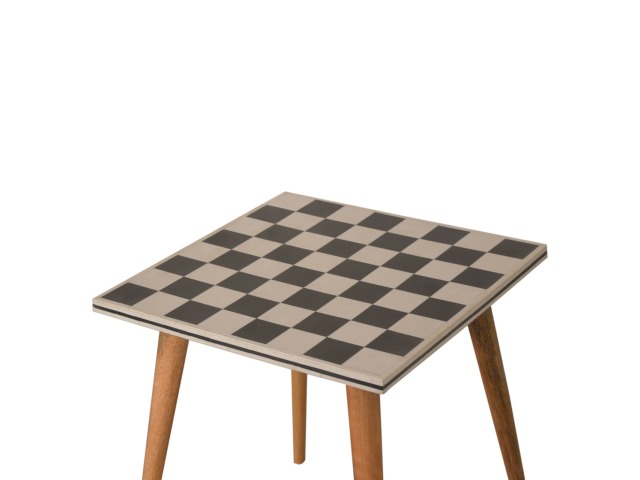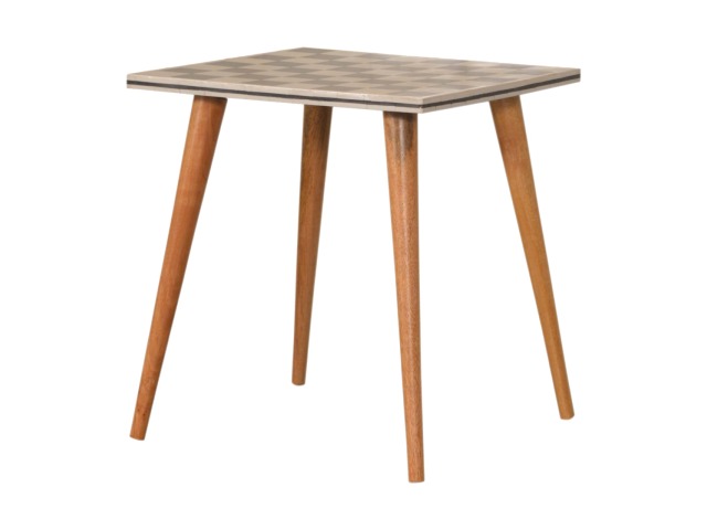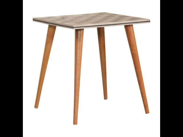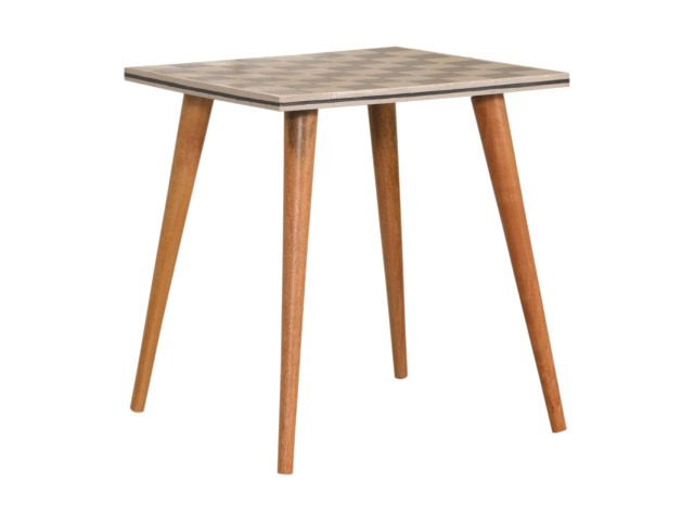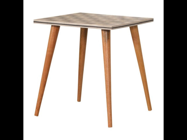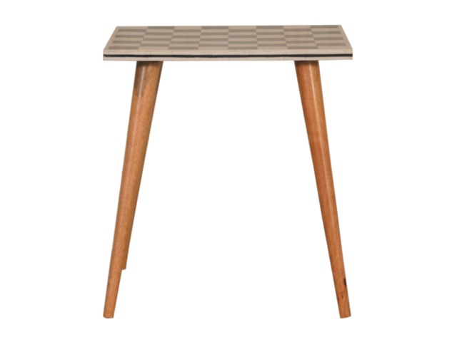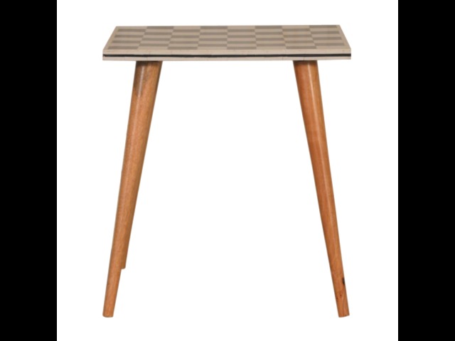 This solid wood end table has been constructed from 100% mango wood with an oak-ish finish. The no fuss finish reveals the beautiful grain of the fruit wood mango wood which this piece of furniture is made of. The main feature of this piece is the beautiful checkered design which has been made from ?