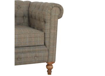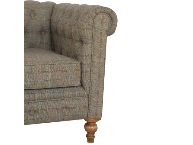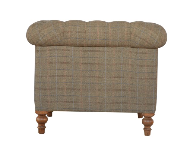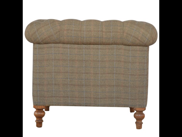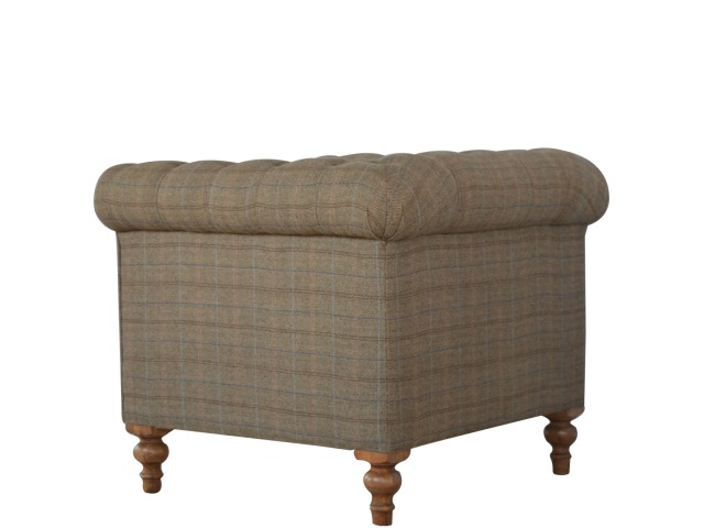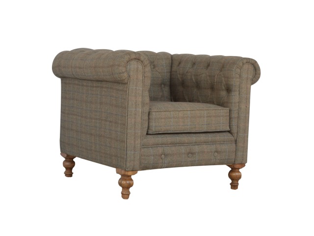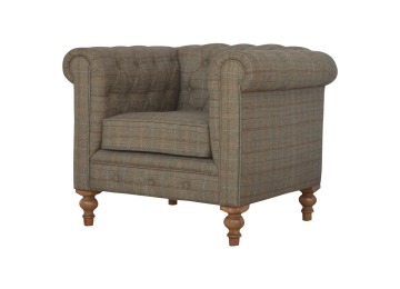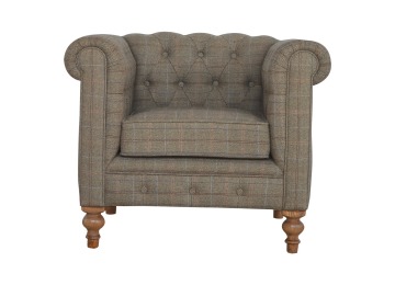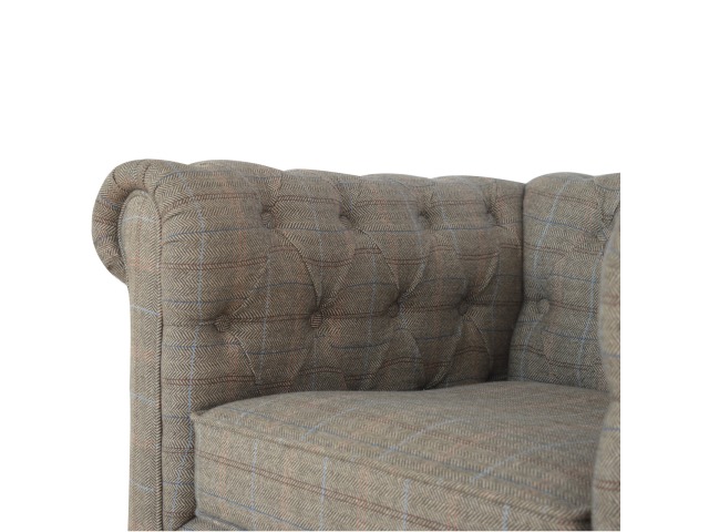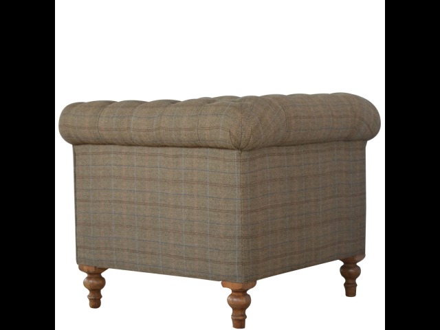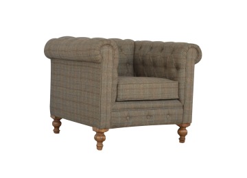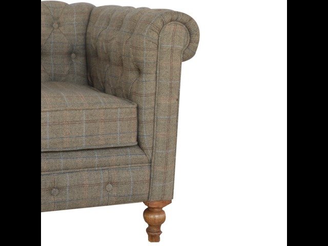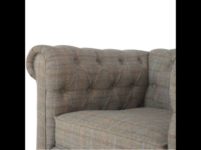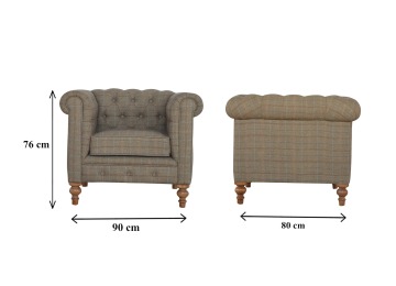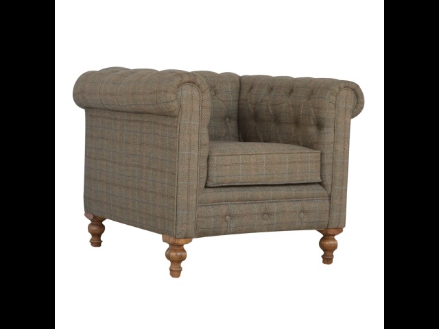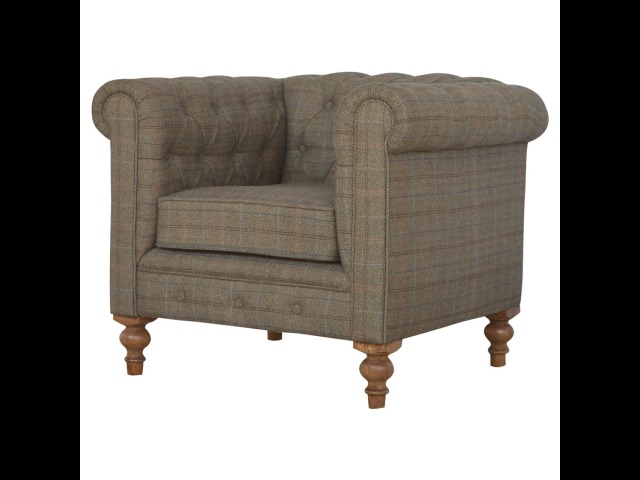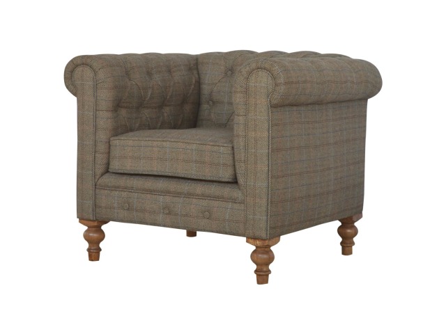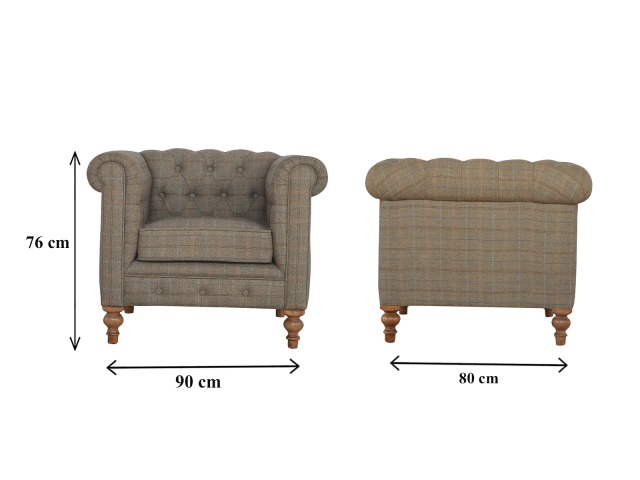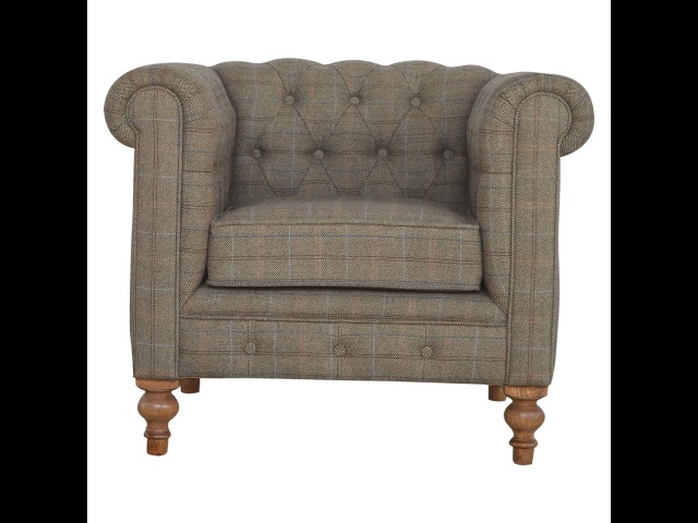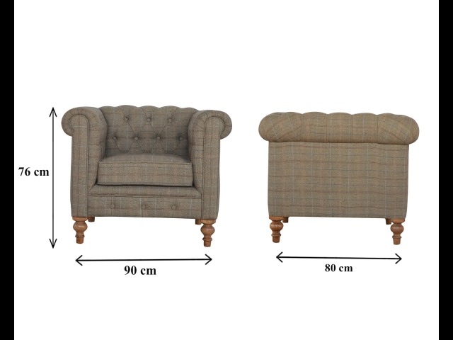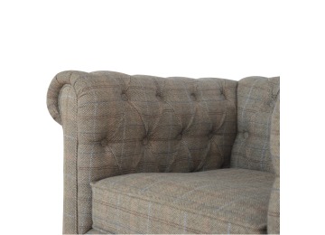 This Chesterfield single seater arm chair has been generously upholstered in multi tweed fabric and is constructed from a 100% solid mango wood, with 4 hand turned feet that have a natural bleached finish. Other features include piping and deep buttons. Perfect for any living space in your home, with simple design to suit any decor.