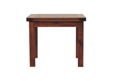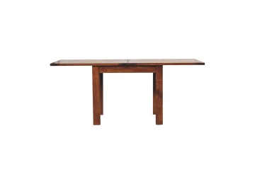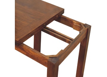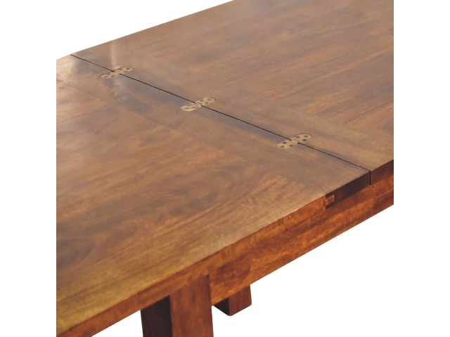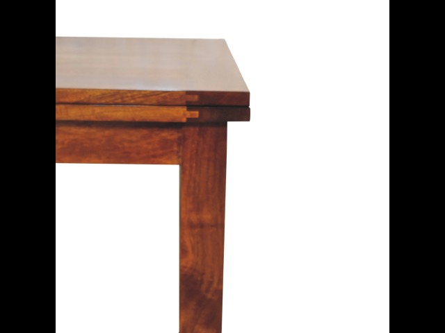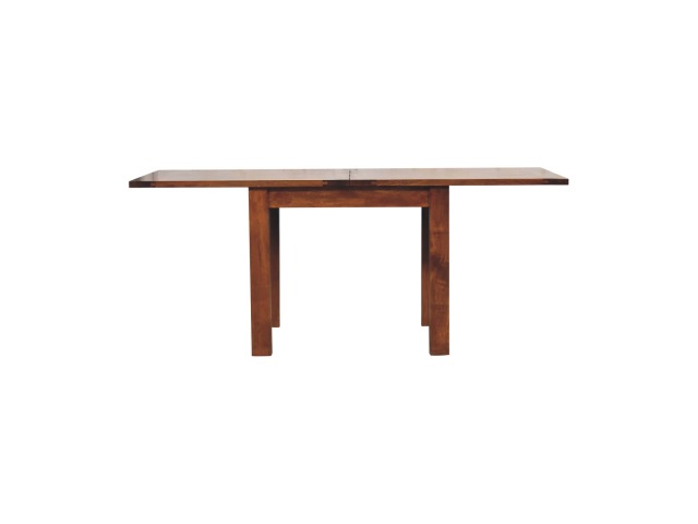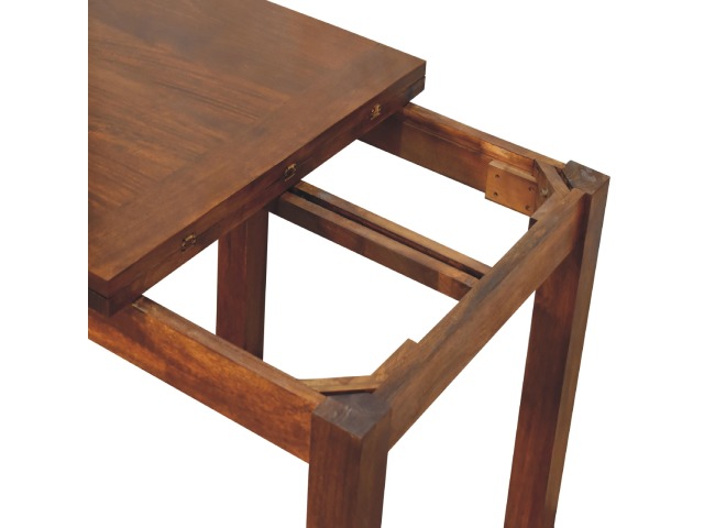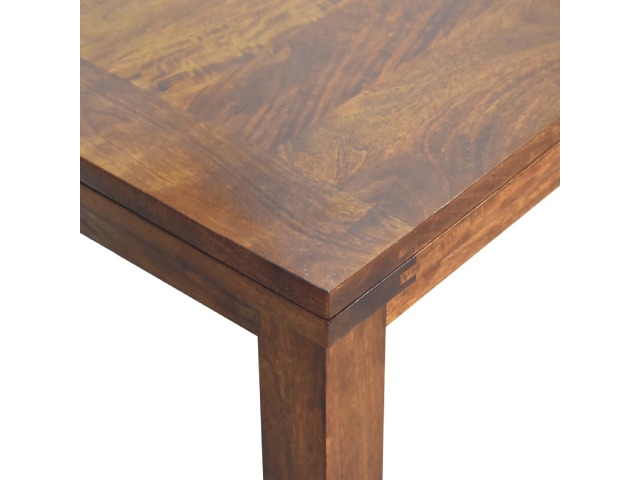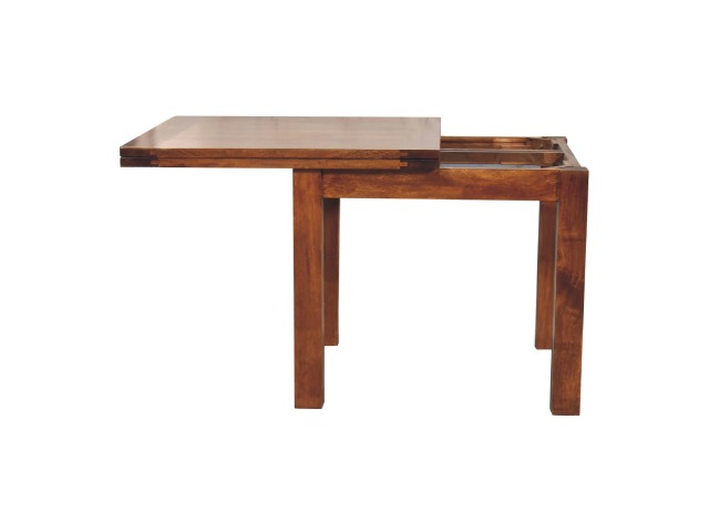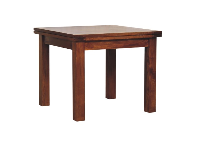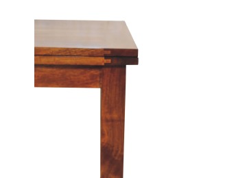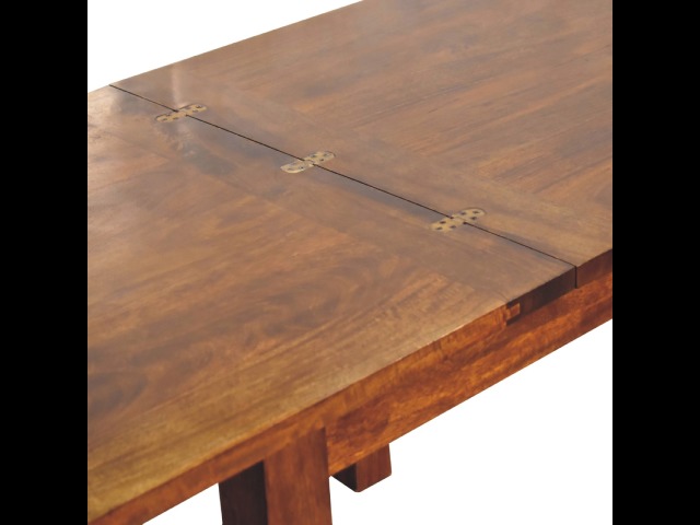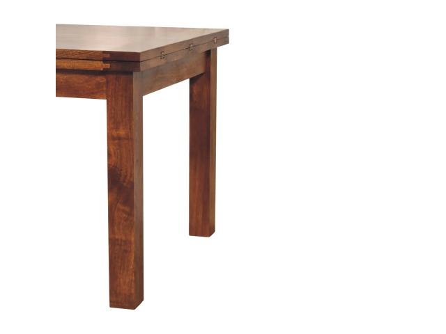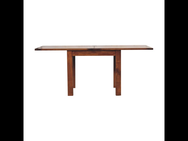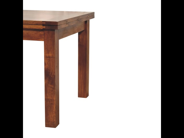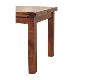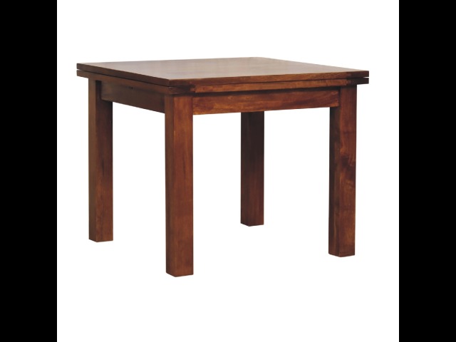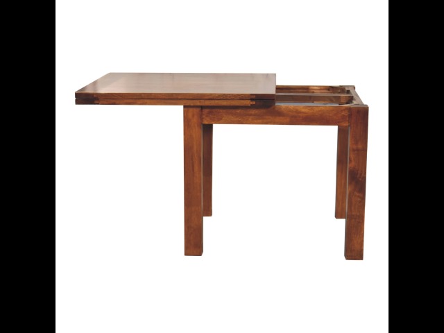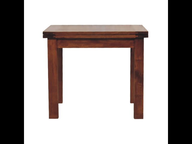 This butterfly table is a charming piece excellent for intimate dinners for two, it has a butterfly extension that stores beneath the tabletop and is easy to use. This piece has been built to last in solid mango wood with a oak-ish finish and simple functional design.