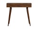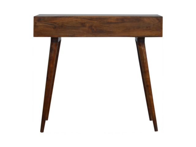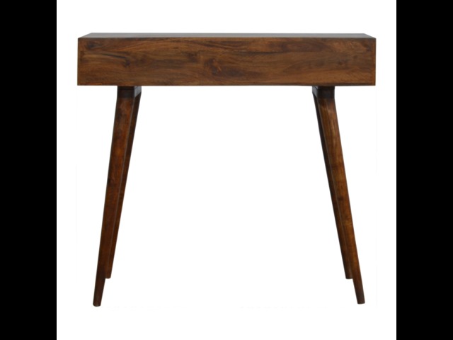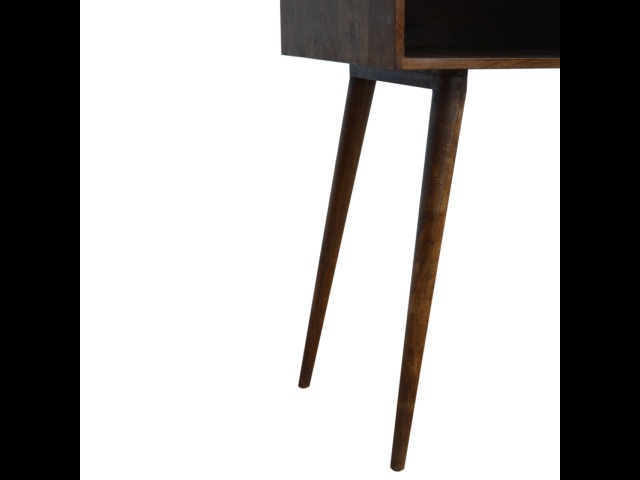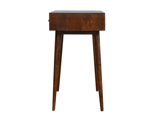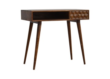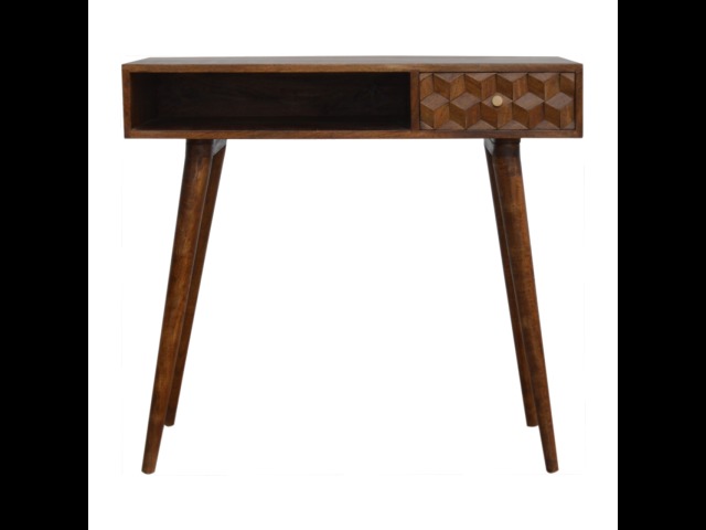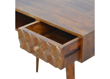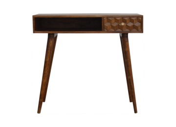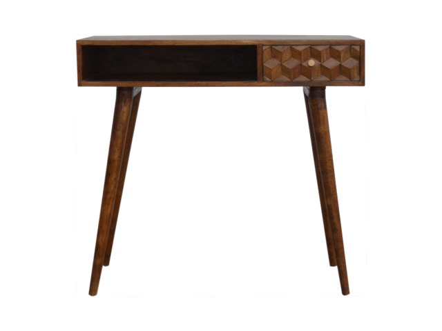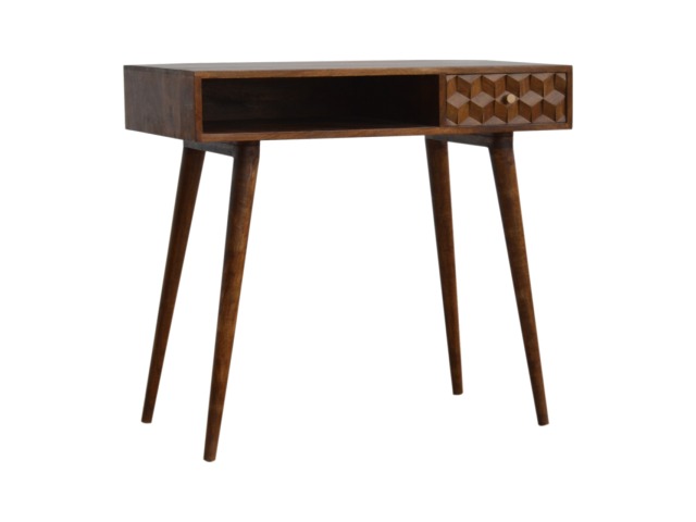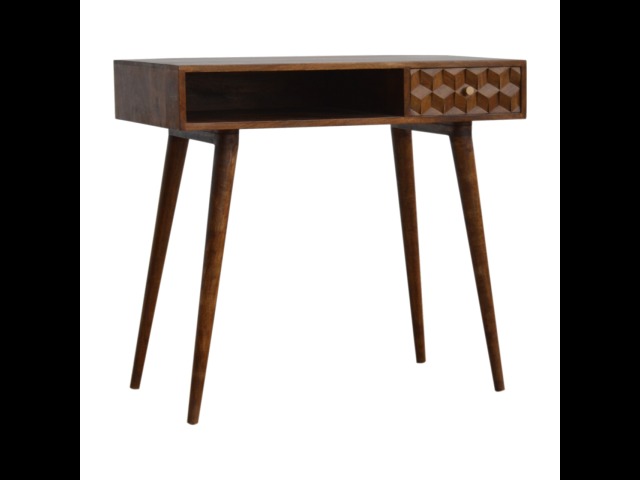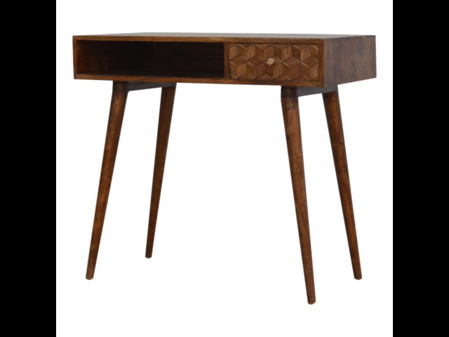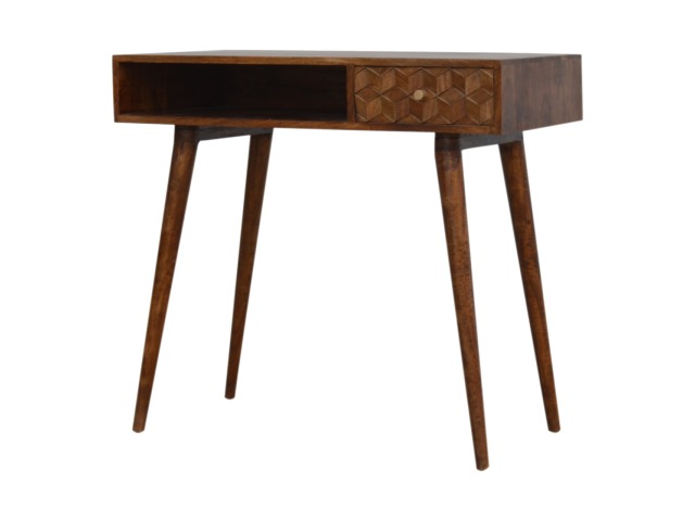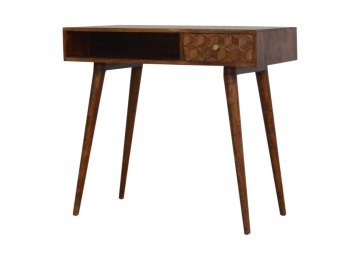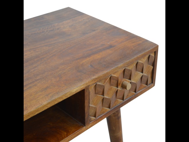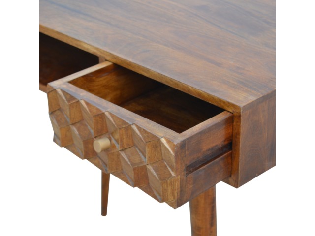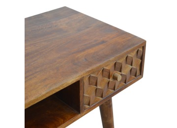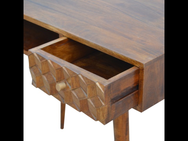The main feature of this writing desk is the carved diamond drawer front which make the pieces from this collection stand out. It has been constructed from 100% solid mango wood in a chestnut finish, features 1 open slot for extra storage and stands on 4 Nordic style legs. It can be partnered with the other pieces from the range or stand individually as its style is versatile and can fit into different types of interiors.