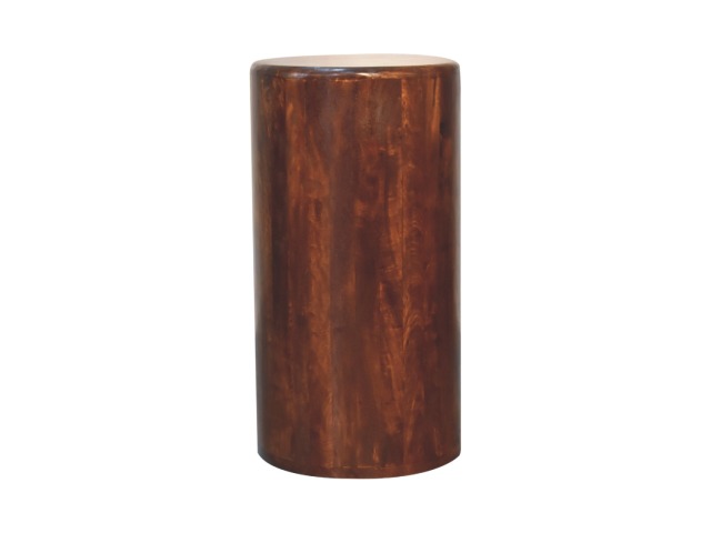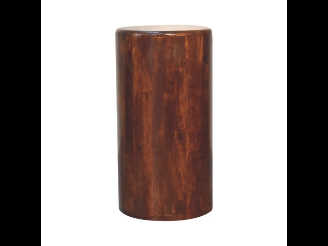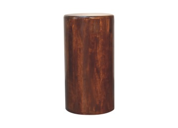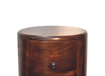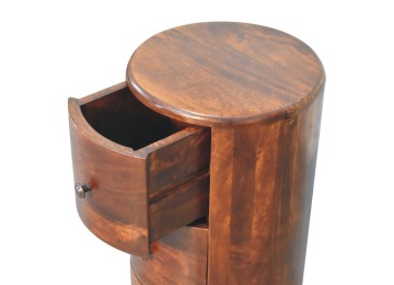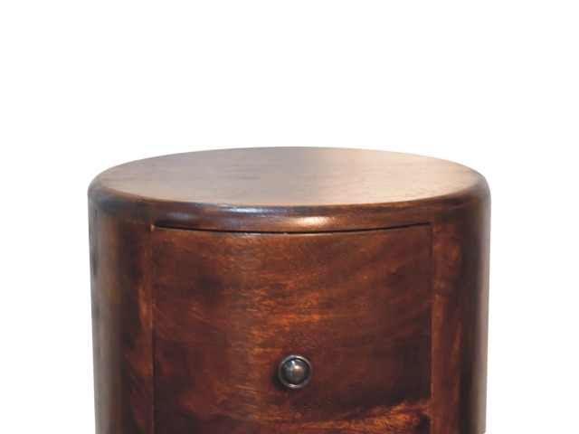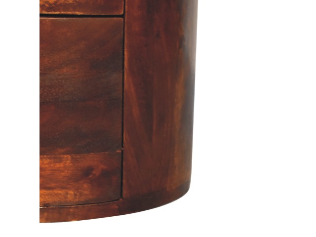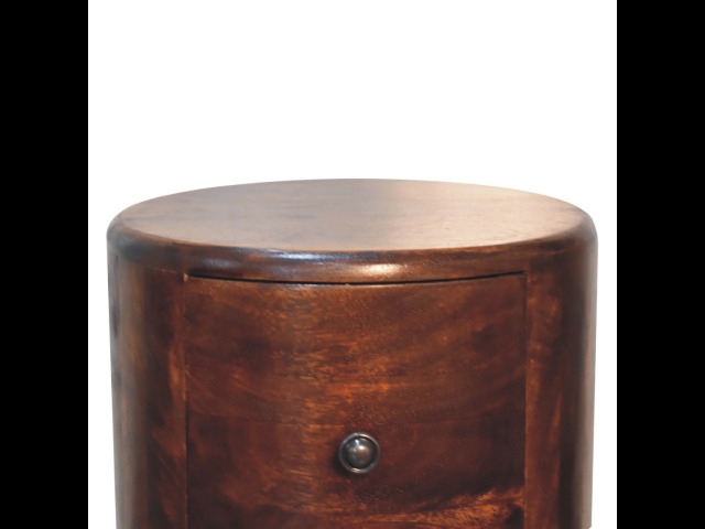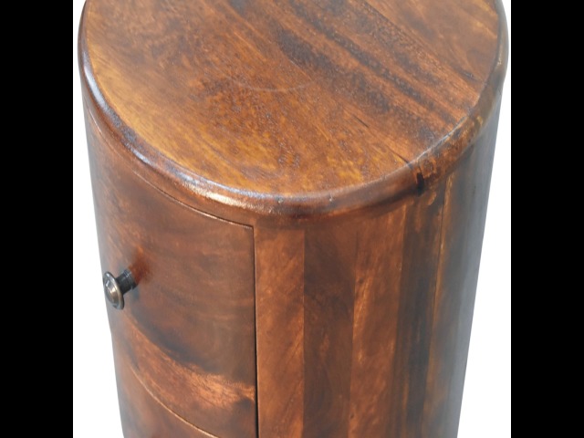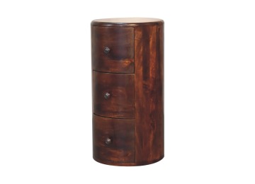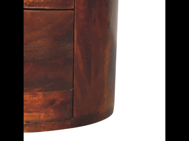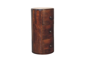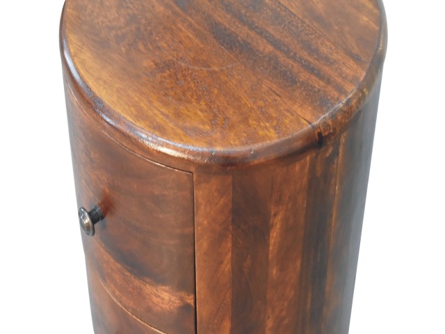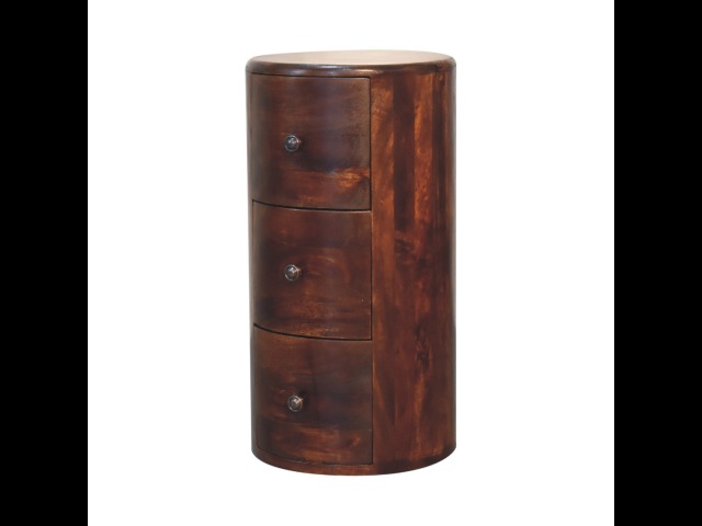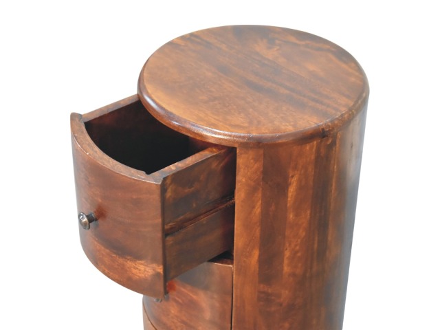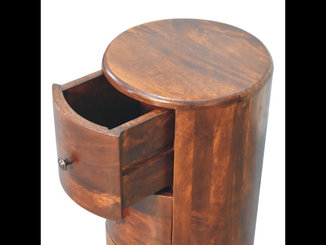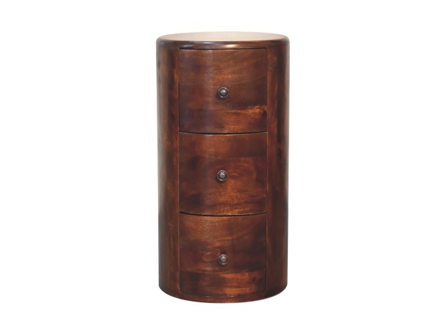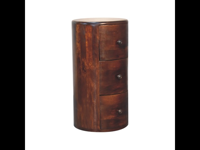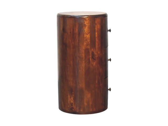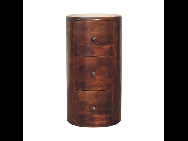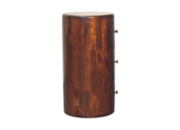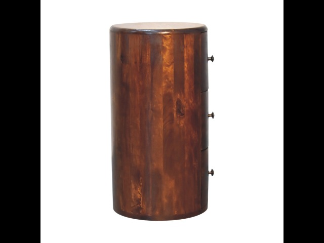 This beautiful round three-drawer drum chest is made from 100% solid mango wood and has a fine chestnut with shiny knobs on the drawers. The three spacious drawers are perfect for storing small items and the space on top is perfect for displaying plants, candles, or photos. This product can be used as either a chest, end table, or an occasional table in the home