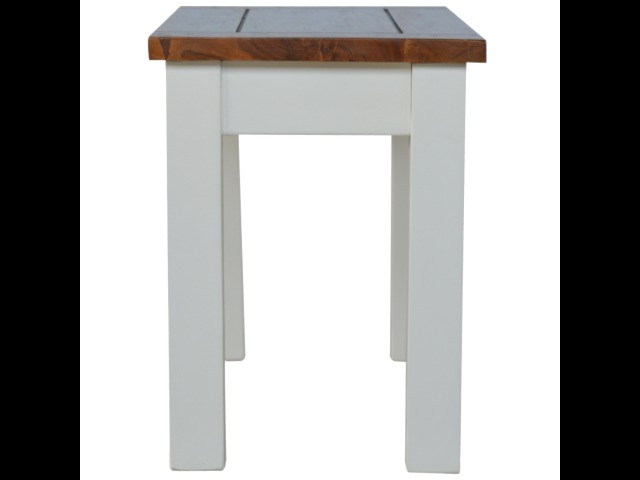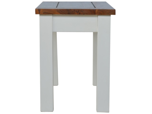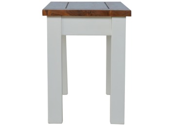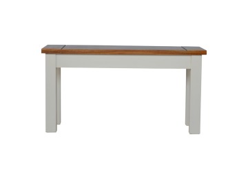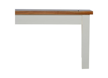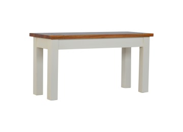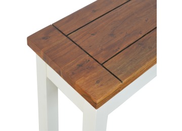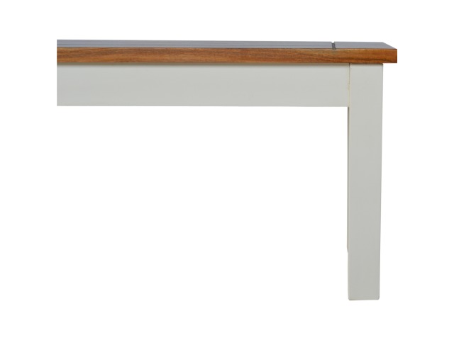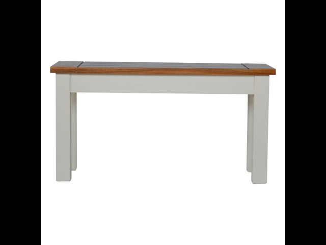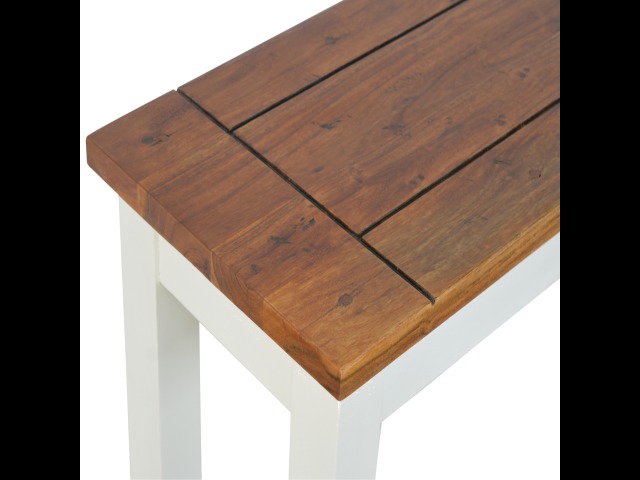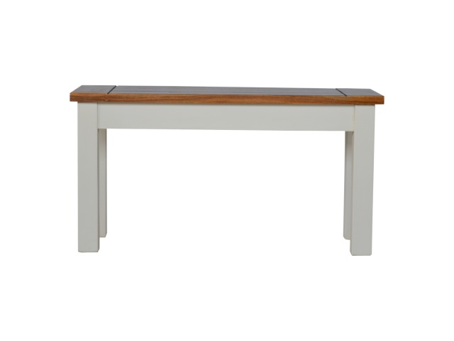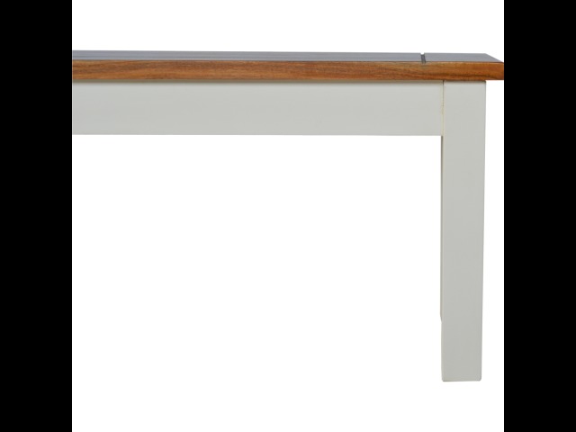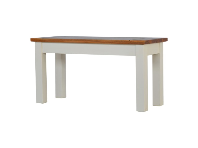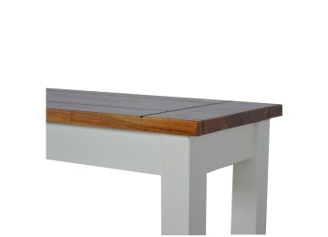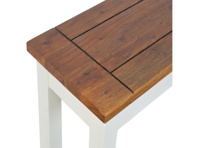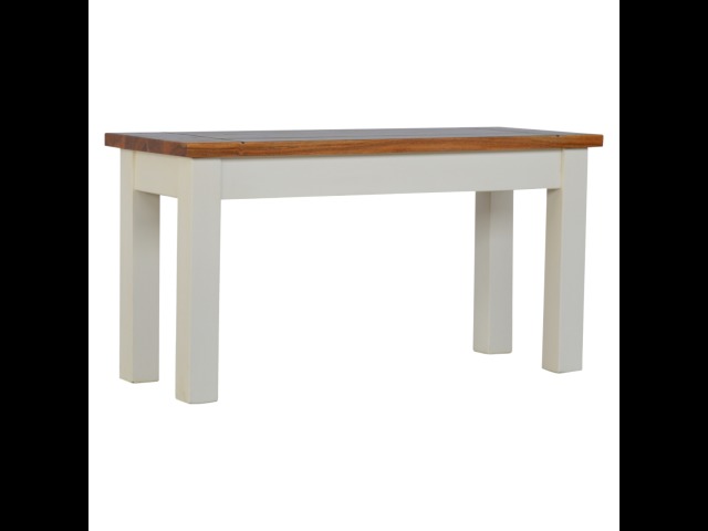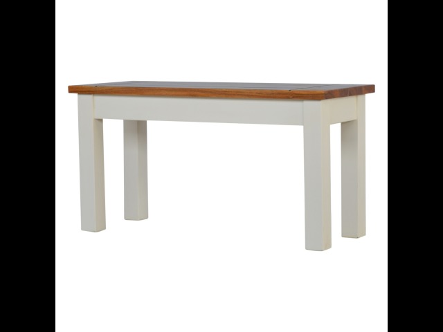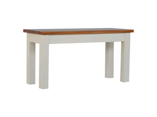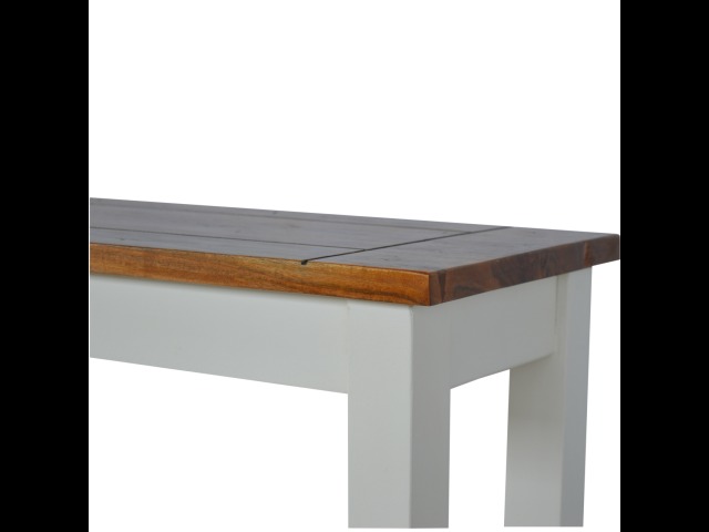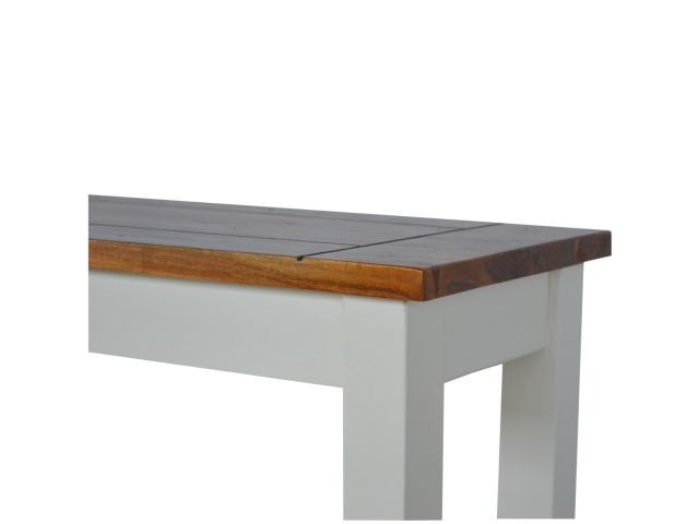 This hallway bench has a white hand spray painted base which is constructed from solid mango wood and a rich honey finish top which is constructed from solid acacia wood. Other features include 4 straight farm house legs.