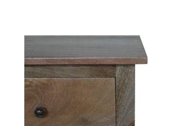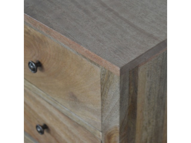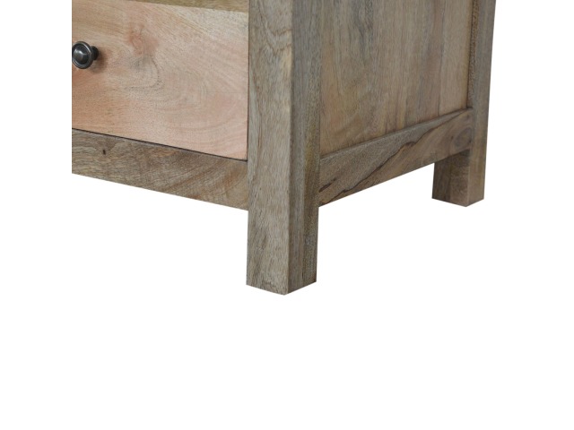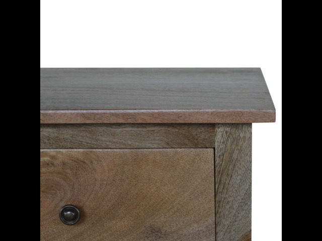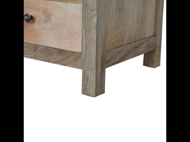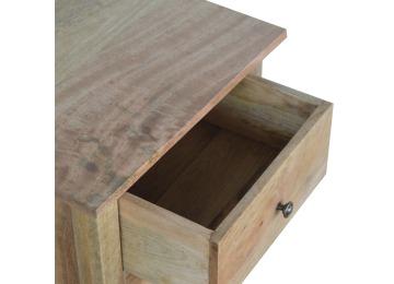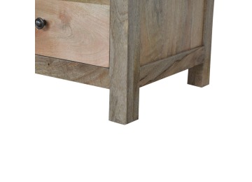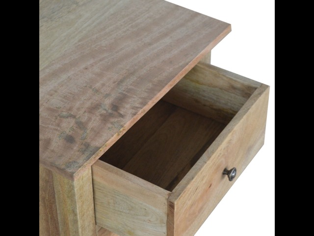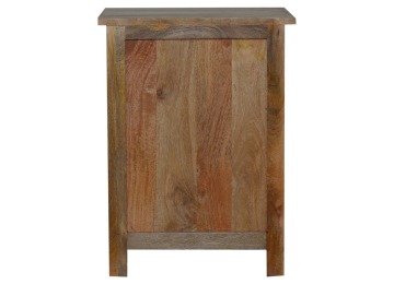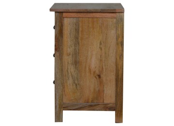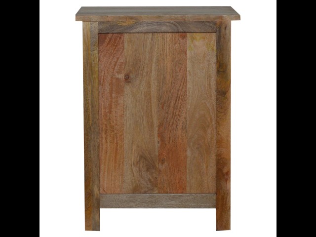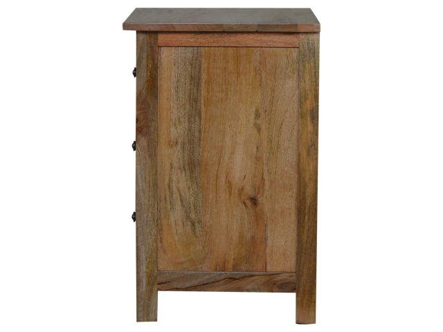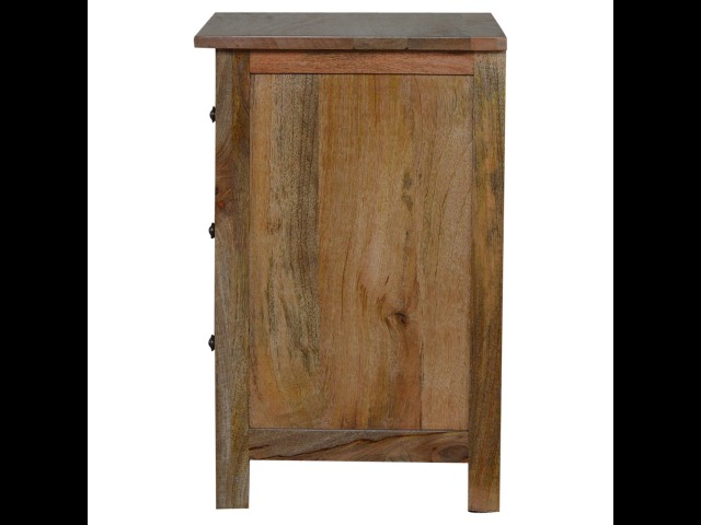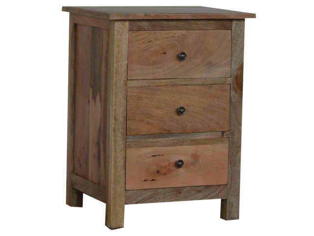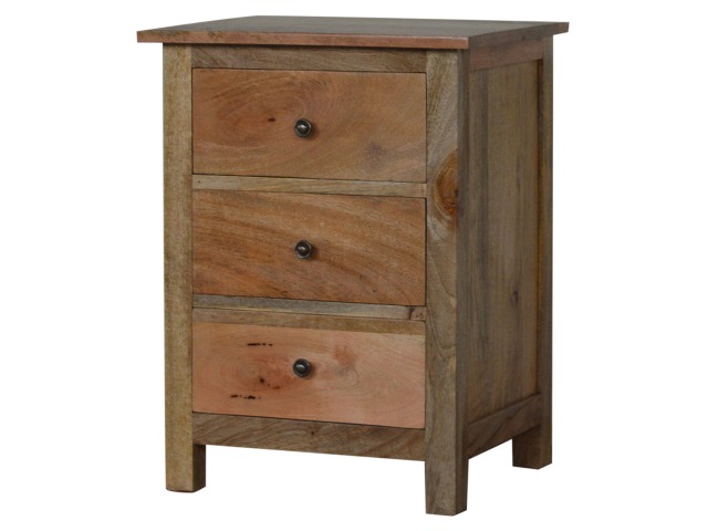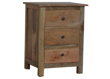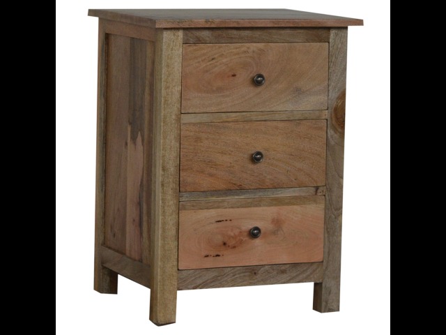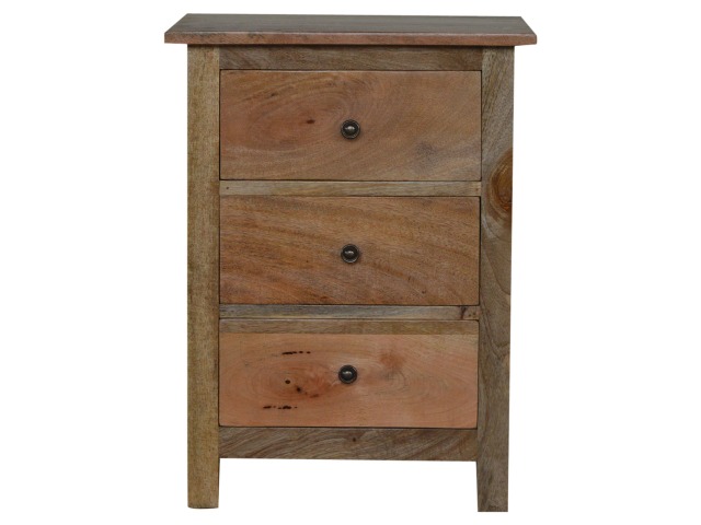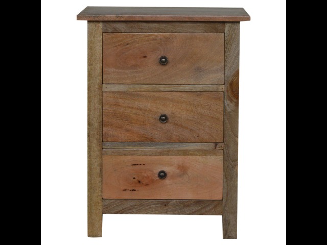 Standing by your bed and taking care of those things you need close by at bedtime this three drawer cabinet will add warmth and storage space to your room. Constructed from 100% solid mango wood with a fine oak-ish finish its clean elegant lines give it a timeless appearance while its clear lacquered finish allows its natural rustic beauty to shine through. Every piece of furniture is individually handcrafted and includes swing care tickets explaining the cautions and aftercare instructions.