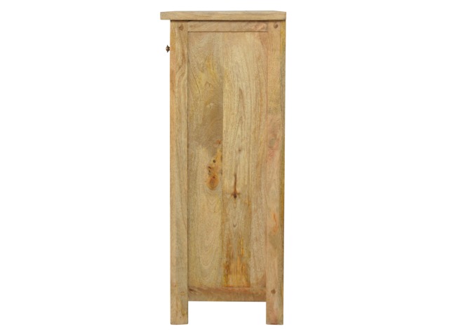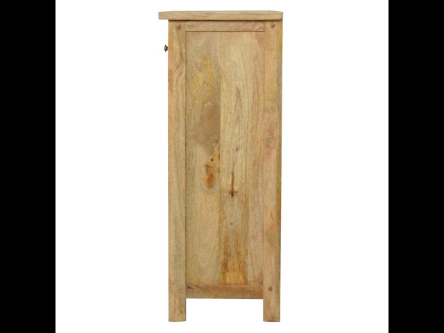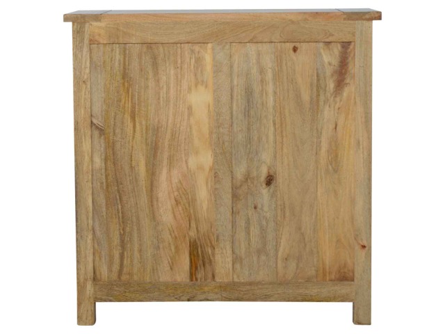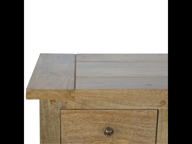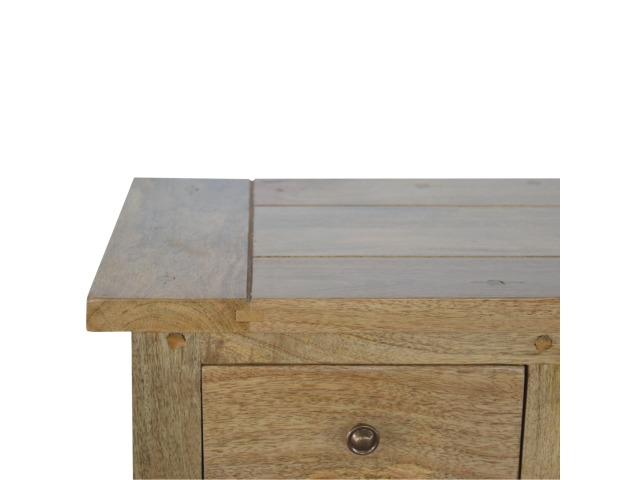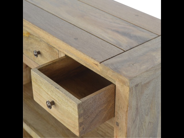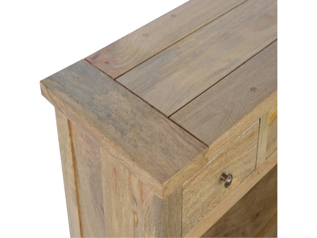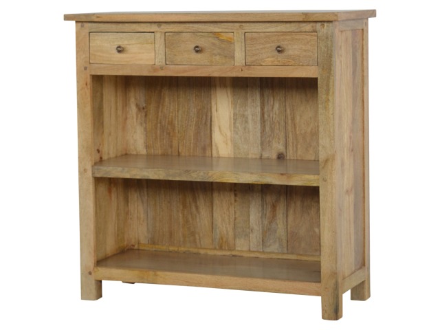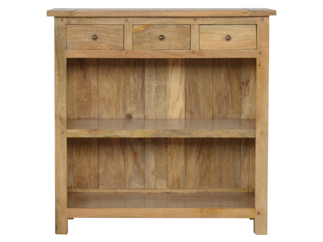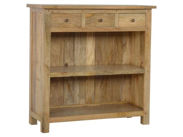 This low bookcase is the ideal piece of furniture for hallways and any living space. It is constructed from 100% solid mango wood and has an oak-ishfinish to give it that country charm look. This product is artistically handcrafted in a country style using wooden pegs, grooves and bread board joints. Useful storage is available with the four drawers that come with shiny knobs and also the bookcase comes with two shelves to place books, ornaments etc.
