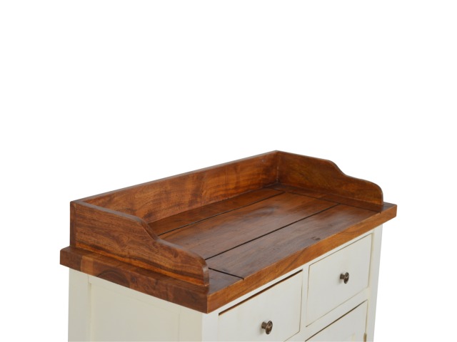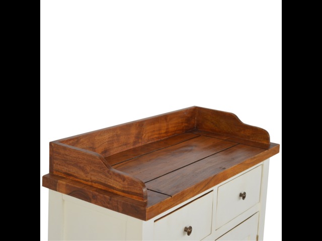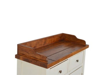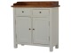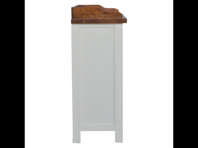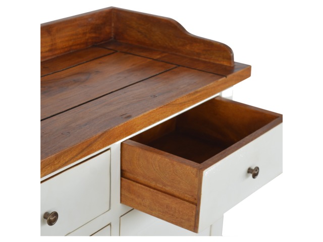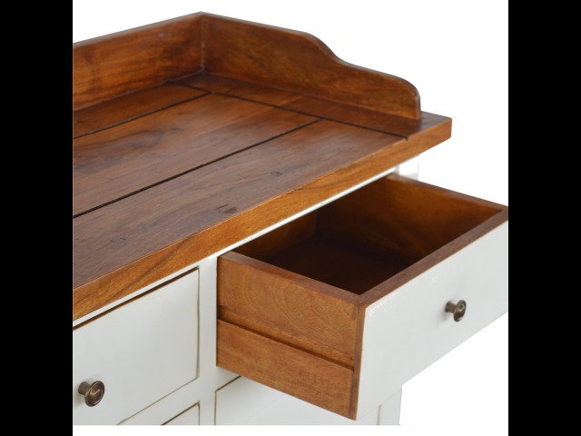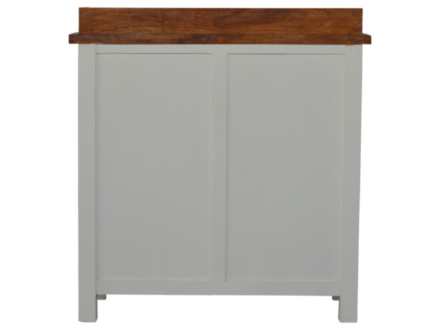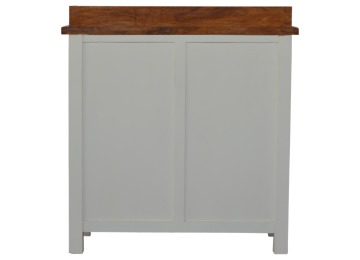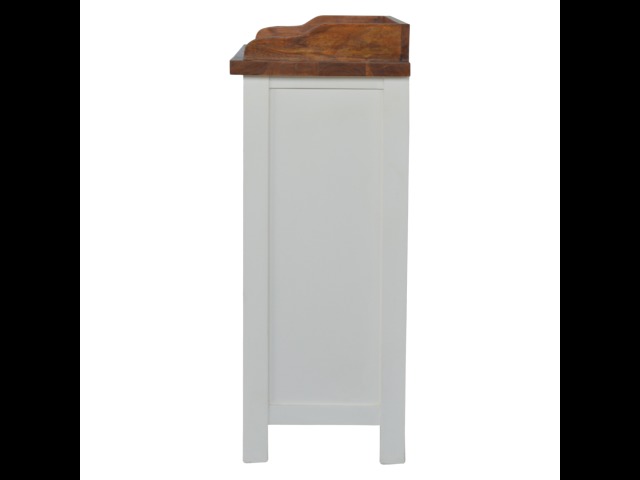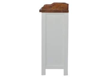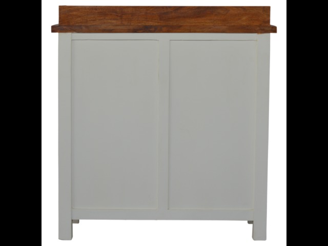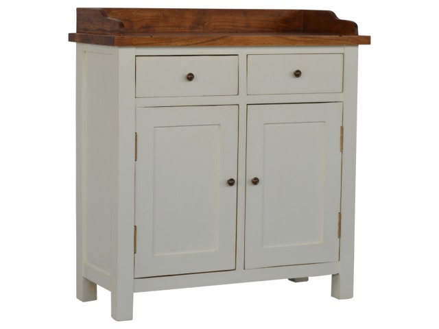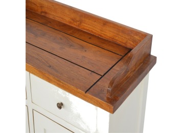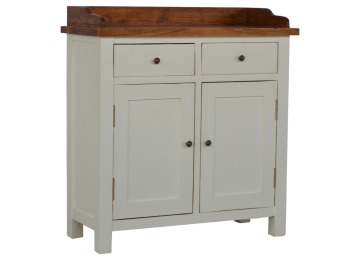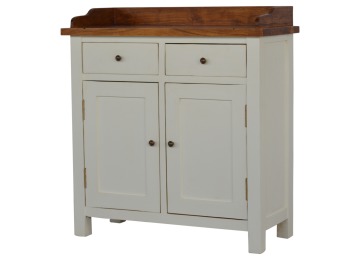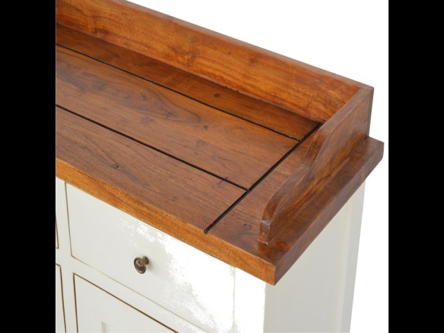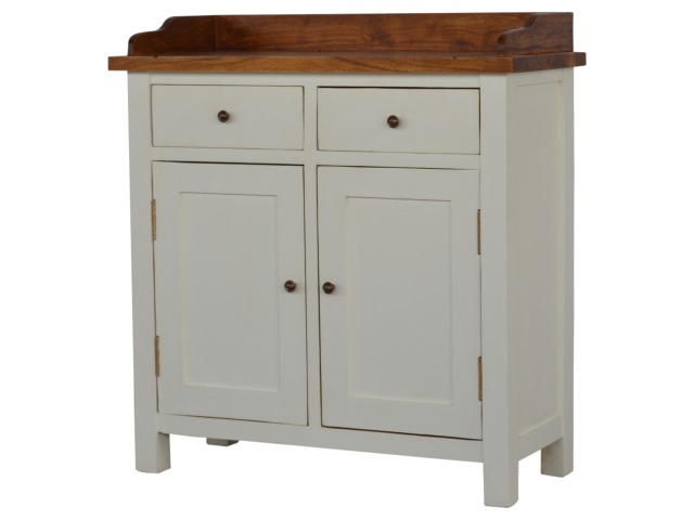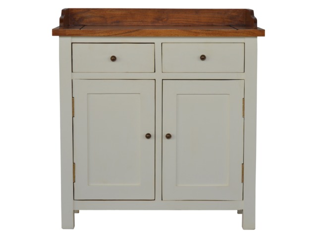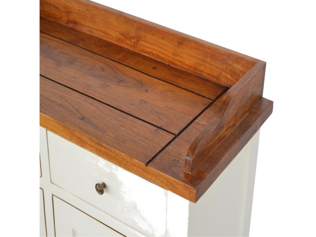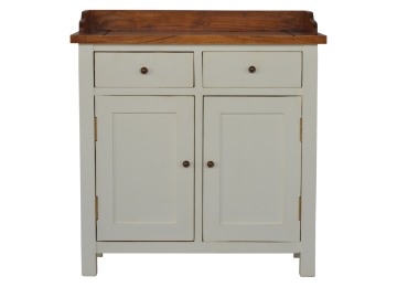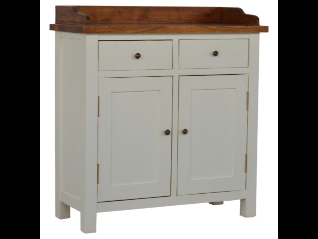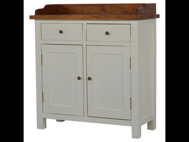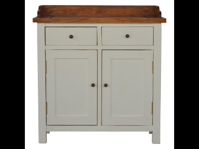 Bring a whole new look to your kitchen with this kitchen unit which has a white hand spray painted base which is constructed from solid mango wood and a rich honey finish top which is constructed from solid acacia wood. It comes with 2 drawers, 2 door Cabinets which have a 1 shelf across inside. Other features include a gallery back, straight farm house feet, shiny brass knob handles and the drawer inners and shelves have a rich honey finish. A superb piece of furniture to look at that is also highly functional.
