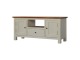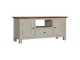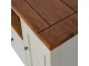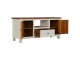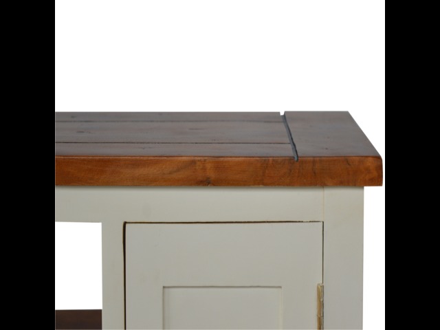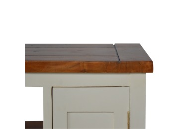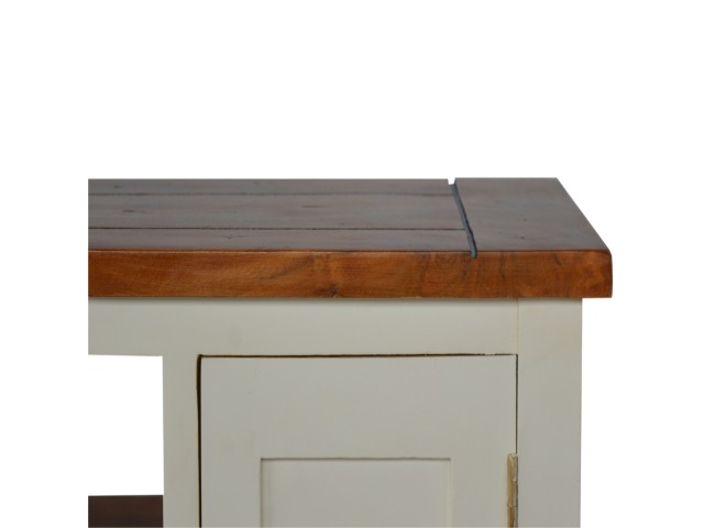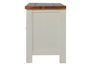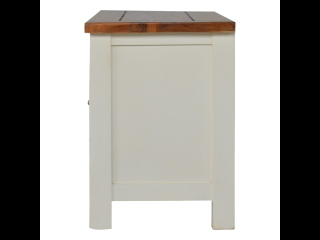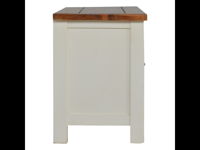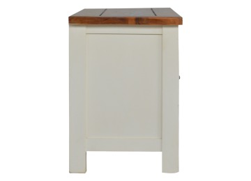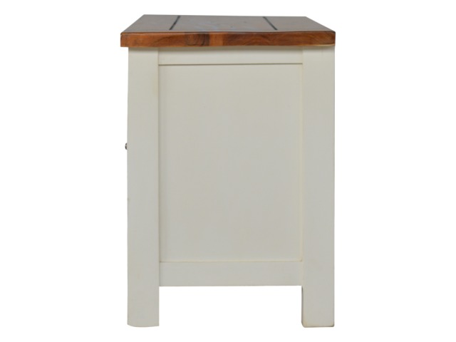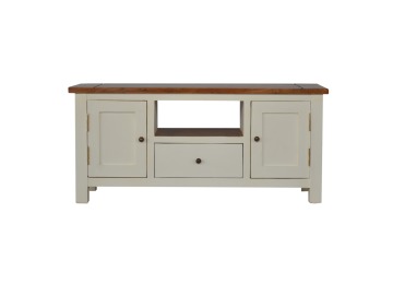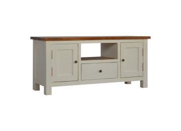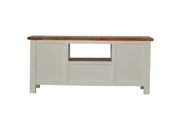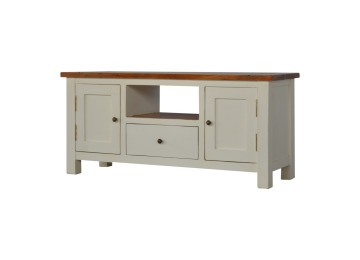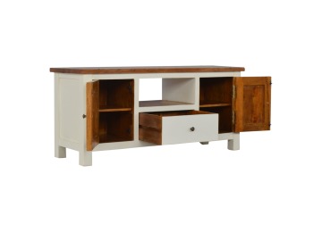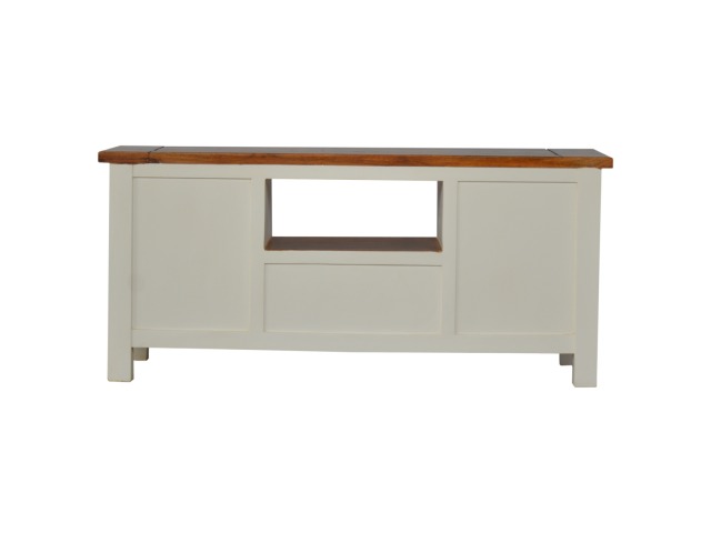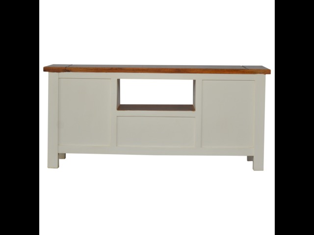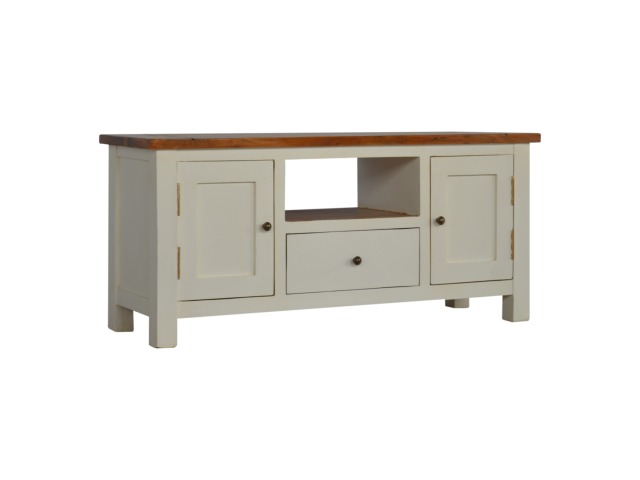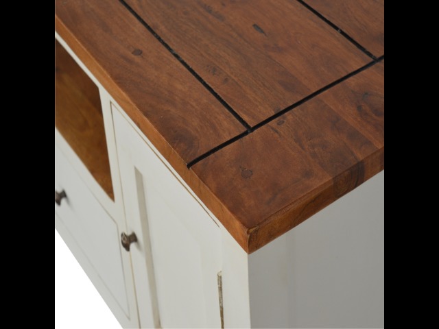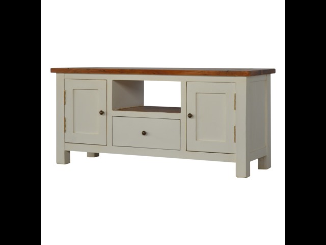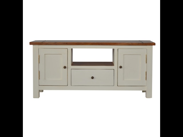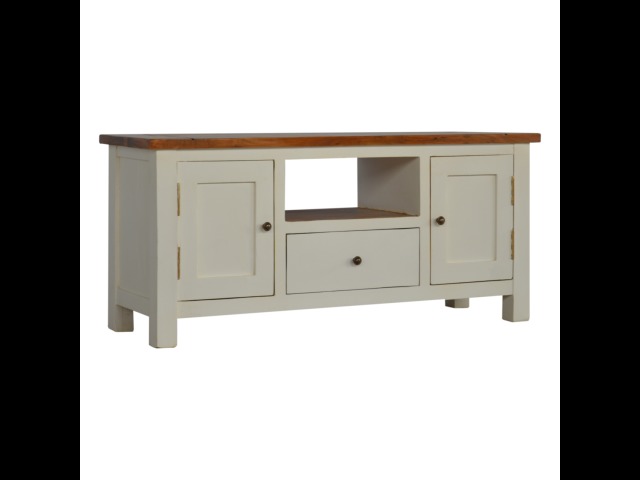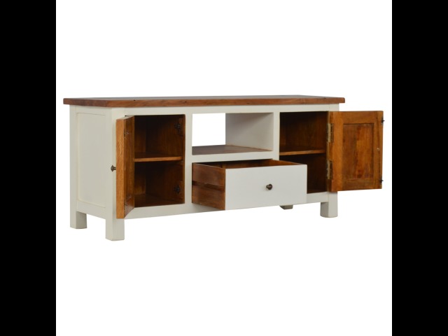This 2 toned media unit has a white hand spray painted base which is constructed from solid mango wood and a rich honey finish top which is constructed from solid acacia wood. It comes with 1 drawer, 2 door cabinets and 1 shelf also there is a decent sized top to place a TV. Other features include shiny brass knob handles; straight farmhouse feet and the drawer inners have a rich honey finish.
