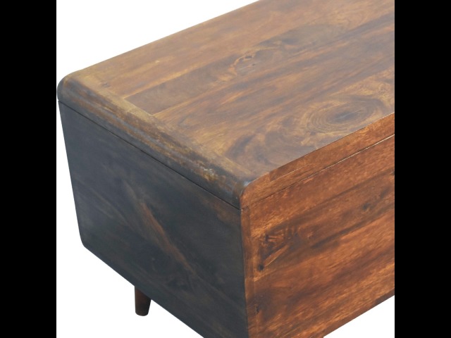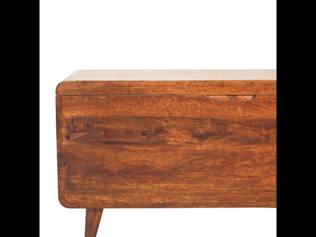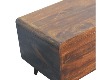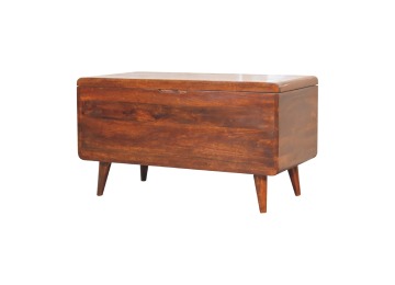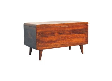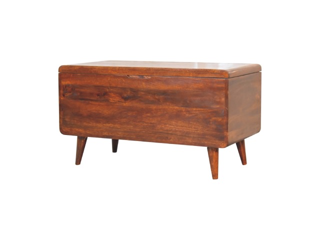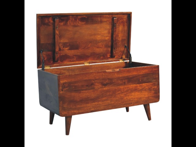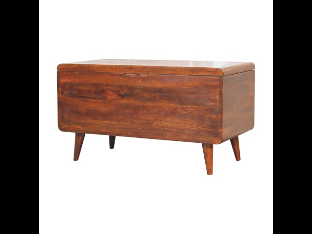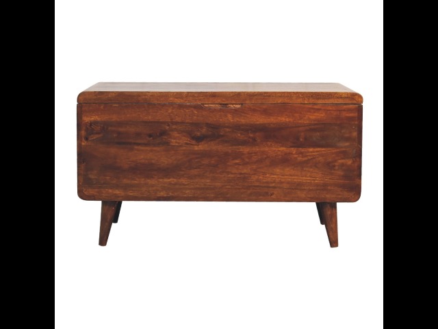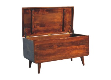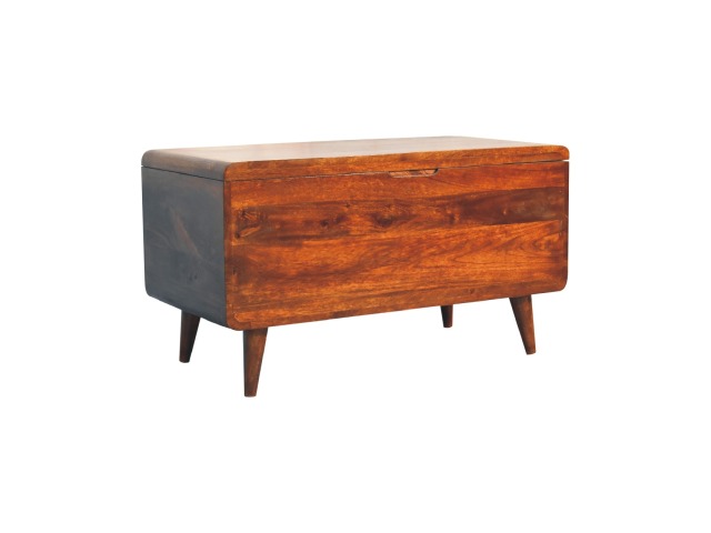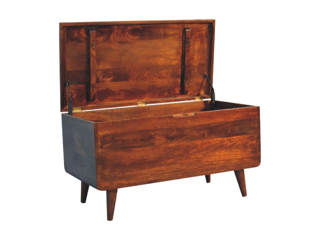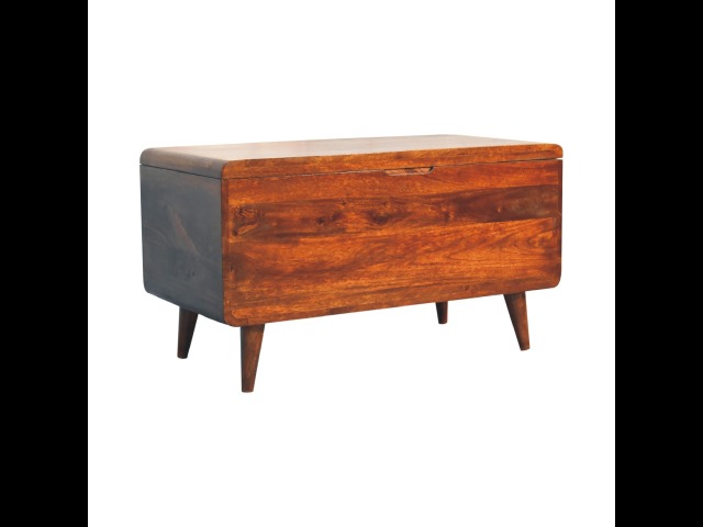 This curved blanket box is crafted from solid mango wood with a chestnut finish. Its spacious interior effortlessly holds blankets and keepsakes, preserving room tidiness. Versatile in function, it complements various decor styles and can even serve as extra seating or a display surface. Embrace the enduring charm and simple design that this blanket box brings, adding both aesthetic appeal and organization to your living space.