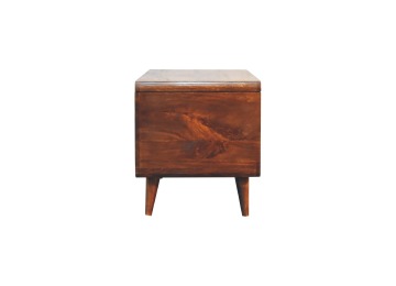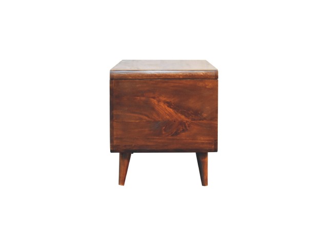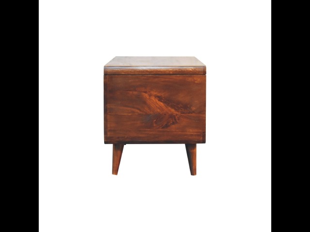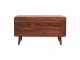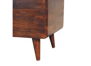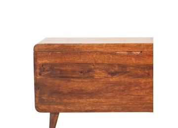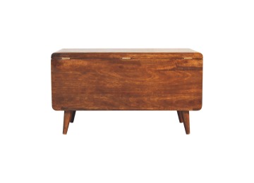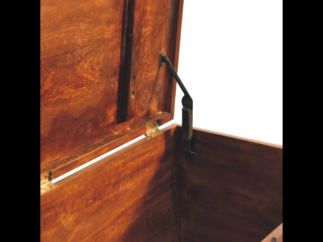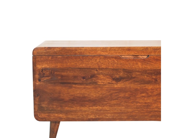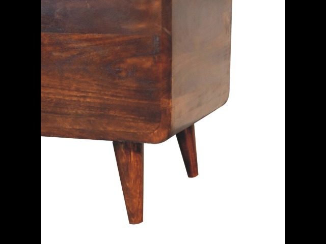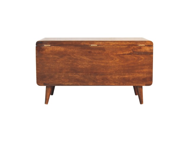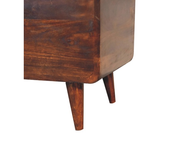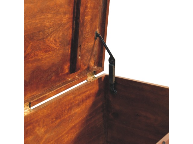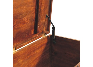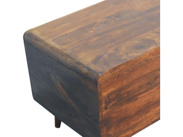 This curved blanket box is crafted from solid mango wood with a chestnut finish. Its spacious interior effortlessly holds blankets and keepsakes, preserving room tidiness. Versatile in function, it complements various decor styles and can even serve as extra seating or a display surface. Embrace the enduring charm and simple design that this blanket box brings, adding both aesthetic appeal and organization to your living space.