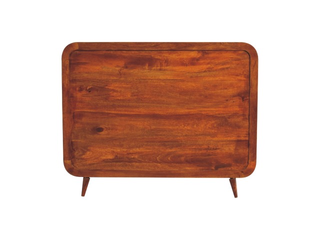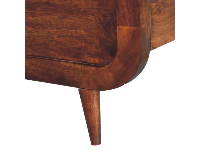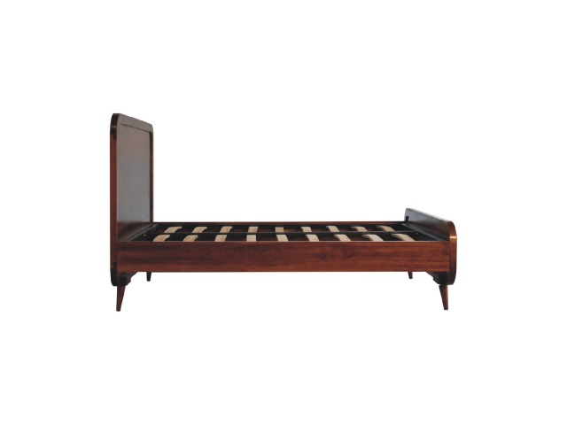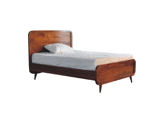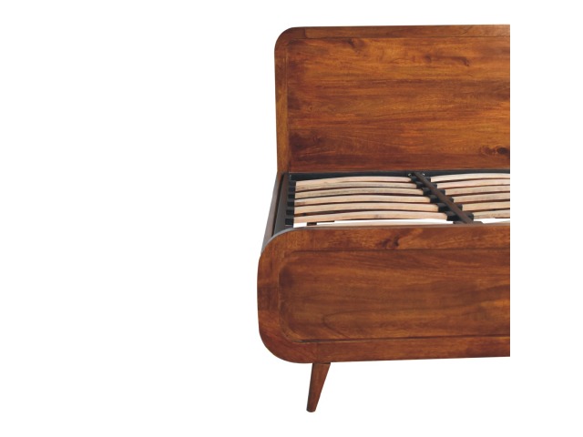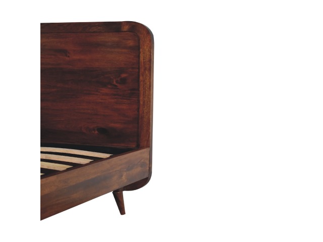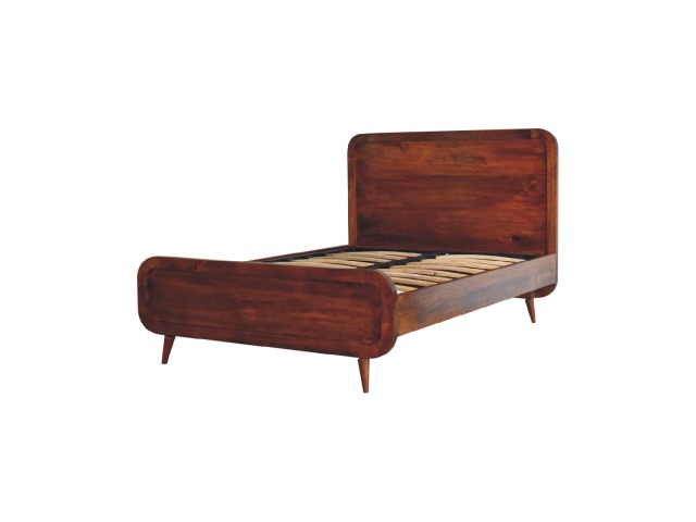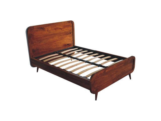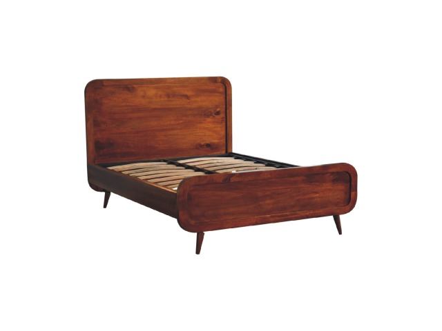 Experience the ultimate in elegance with our Curved Mango Wood Double Bed. Crafted from 100% solid mango wood in a rich chestnut finish, the headboard and footboard showcase exquisite curves. This masterpiece boasts a metallic frame with 18 wooden slats, ensuring durability and comfort. Nordic-style legs add a touch of sophistication. Transform your bedroom into a haven of style and tranquility. The box will contain 1 x headboard, 1 x footboard, 2 x side rails, 1 x metallic frame with 18 wooden slats (embedded in metallic frame), 4 x legs, 1 x hardware bag, total number of units in box = 9 units. Please note the bed does not include the mattress, duvet cover or pillows.