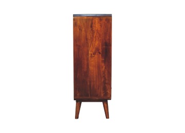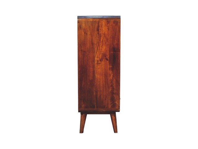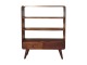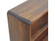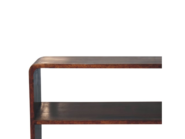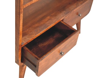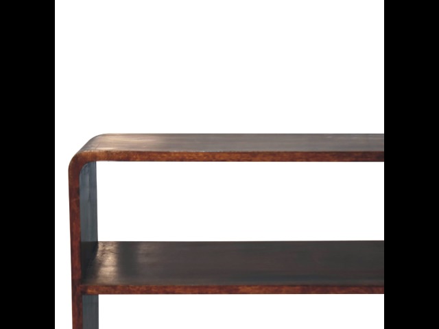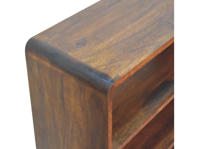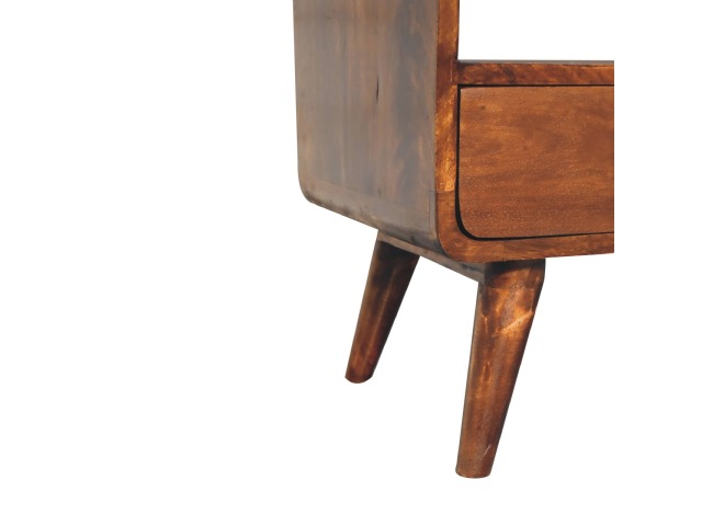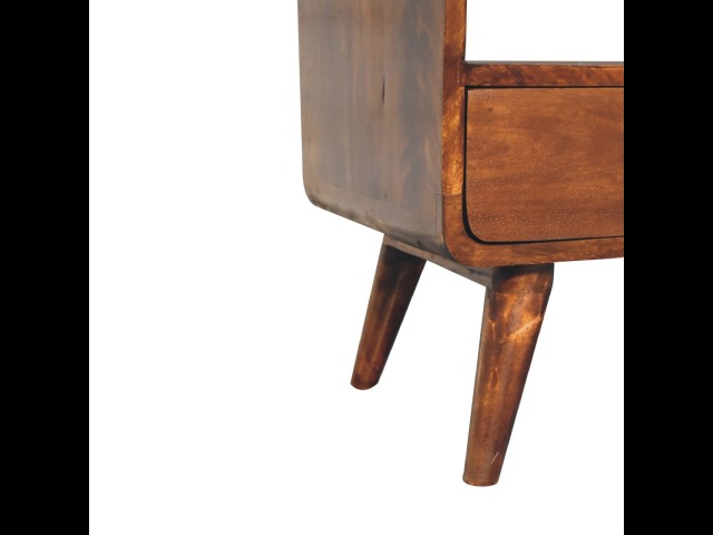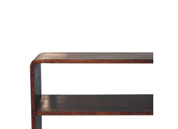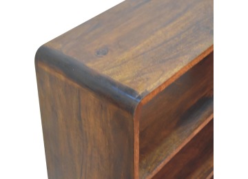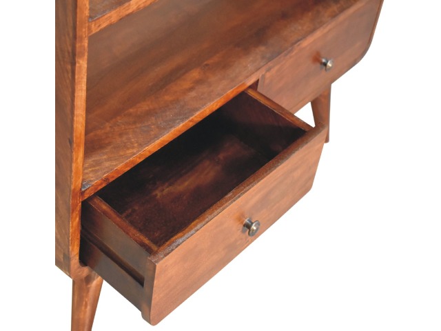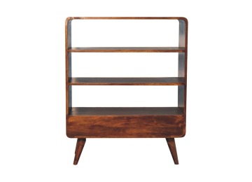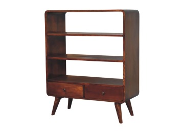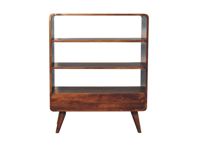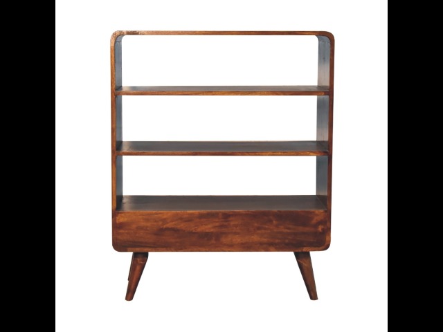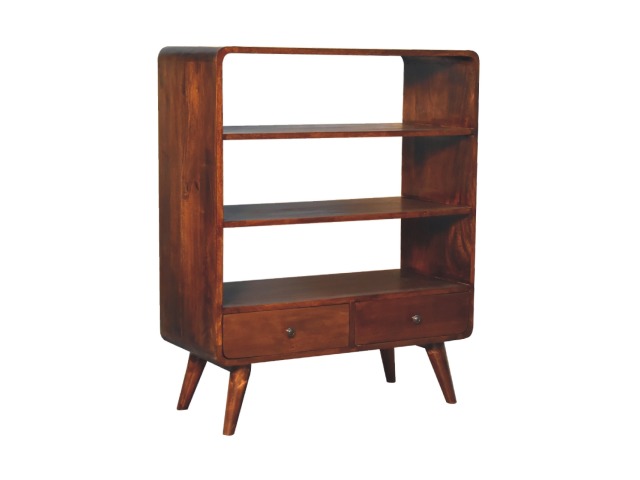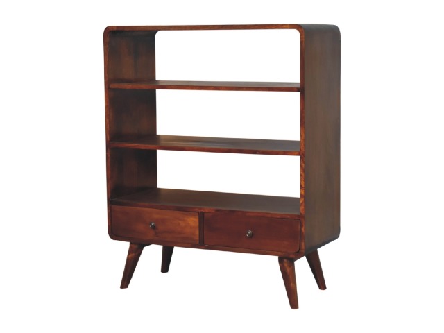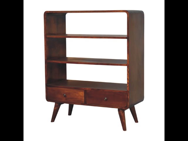 This charming rounded low bookcase is a gorgeous addition to your home. Made from 100% solid mango wood in a chestnut finish, it has shiny brass knobs on both drawers. Ample shelving space invites you to display your favorite books and treasures. Complete with sleek Nordic-style legs, this bookcase effortlessly combines style and functionality.