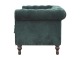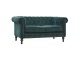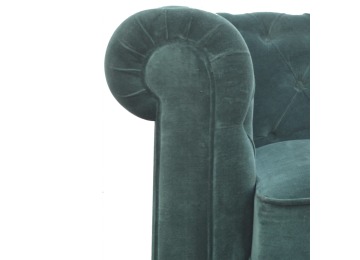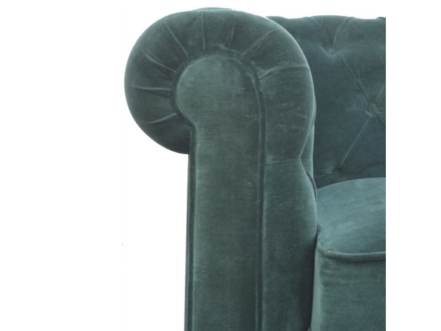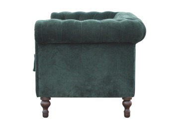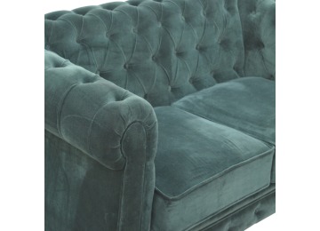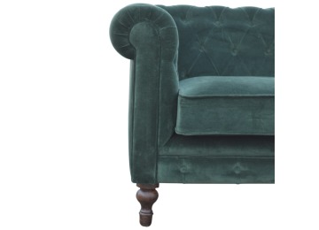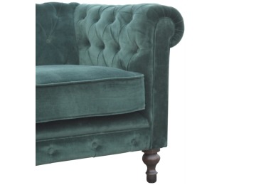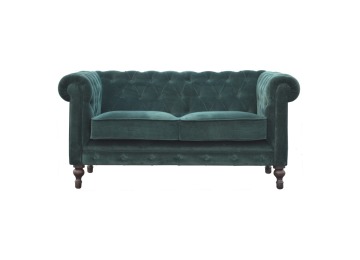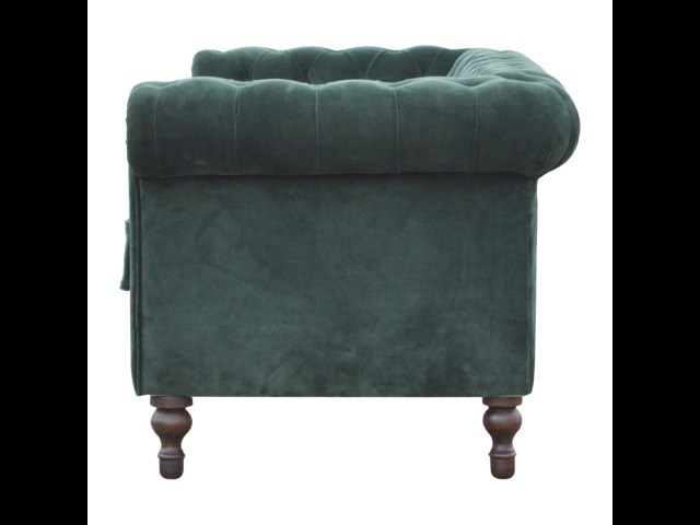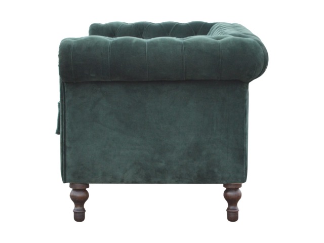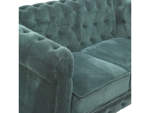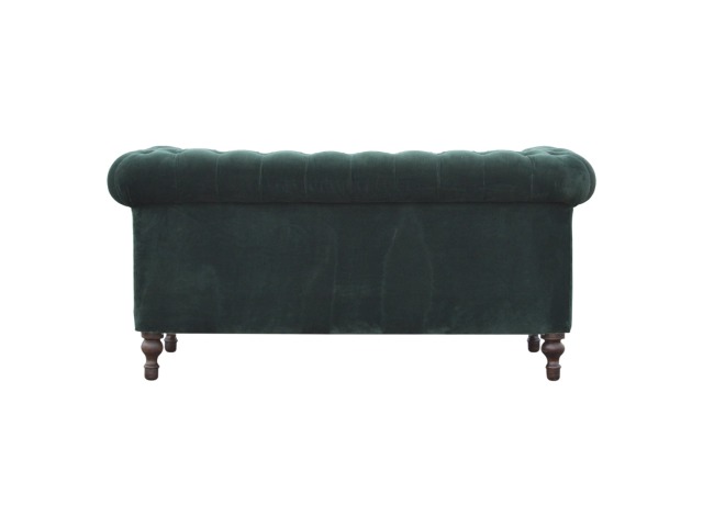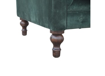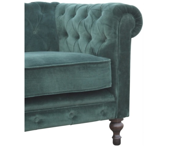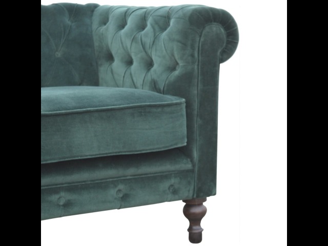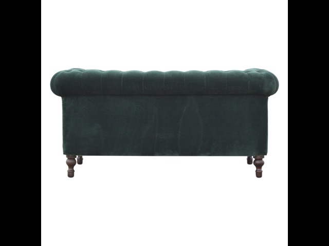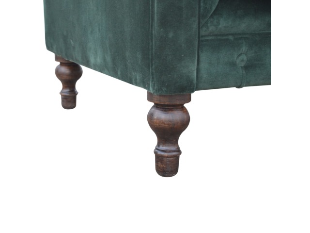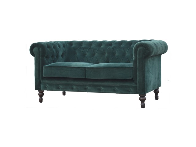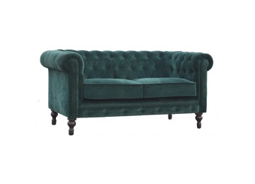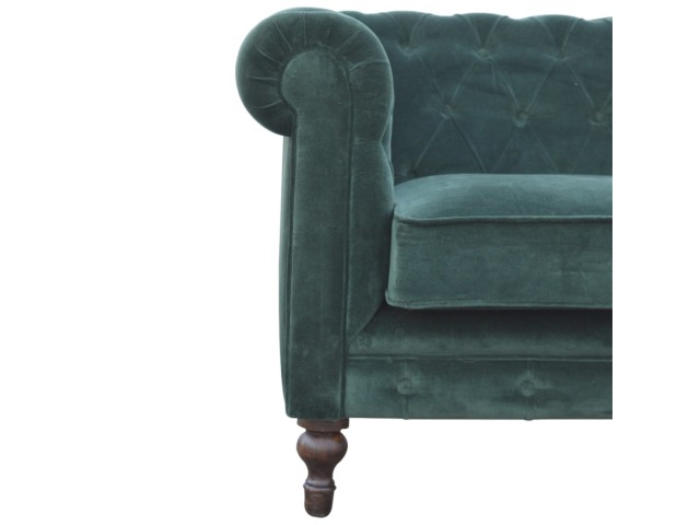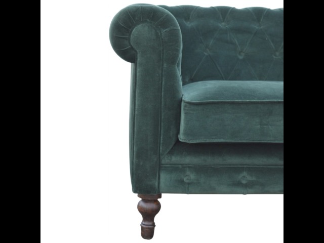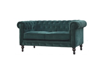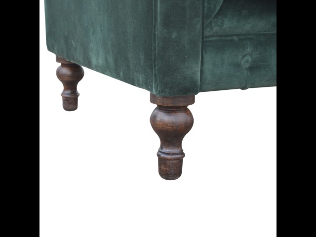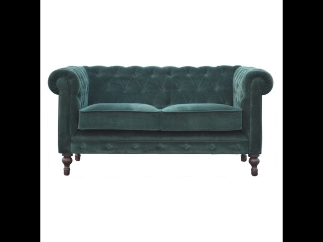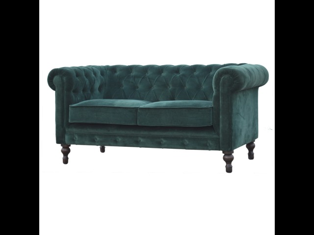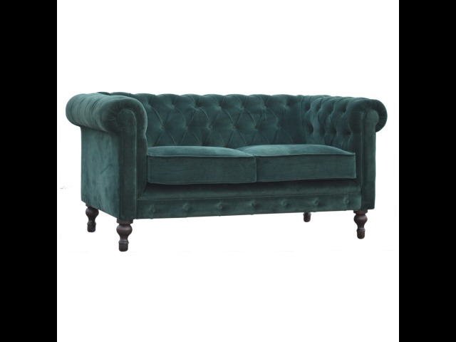 This beautiful 2 Seater Chesterfield Sofa has been upholstered in a luxurious emerald green cotton velvet and features 4 turned feet constructed from 100% solid mango wood in a walnut finish. This sofa is detailed with deep button tufts, piping and sheltering arms. This is a statement piece for the home which can be added as a pop of colour to any room in the home or can be suited well with many different styles and colours of interiors being modern or classic. Product to be delivered on the pallet as a pavement/kerbside delivery. Customer needs to dispose off or use it if they wish to. For possible returns, we would require the original pallet alongside full packaging as part of returns policy.
