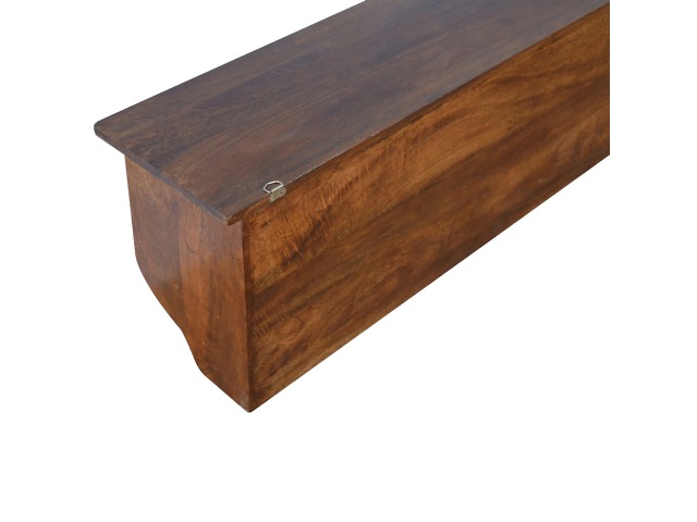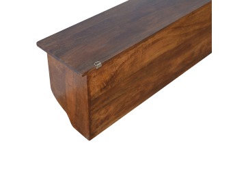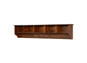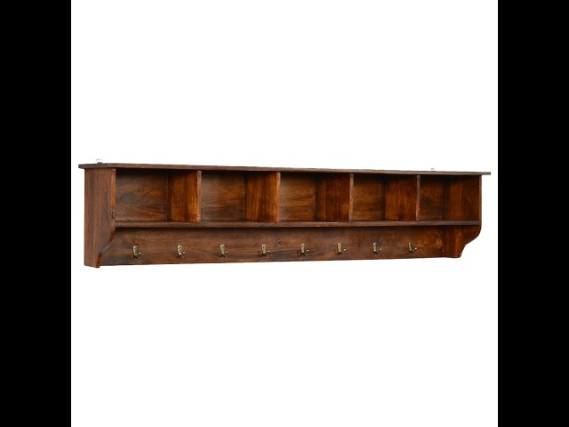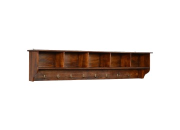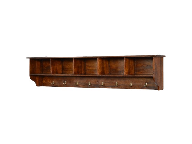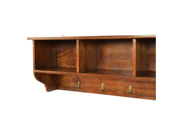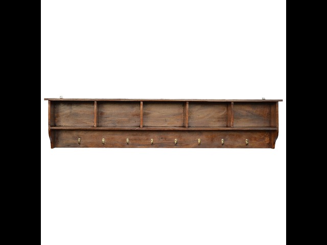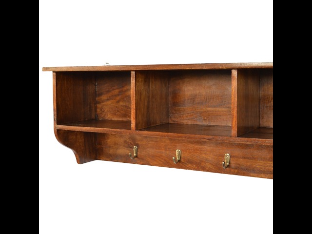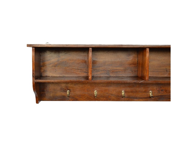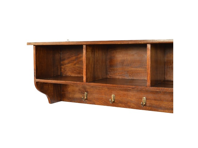 Add this wall mounted storage unit to your hallway or corridor, it offers handy storage and takes up no floor space. It has been made from 100% solid mango wood with antique brass hooks and an oak-ish finish. It has 3 open compartments, to allow easy access for placing or picking up any belongings before leaving the house, and is a nice addition to the come.