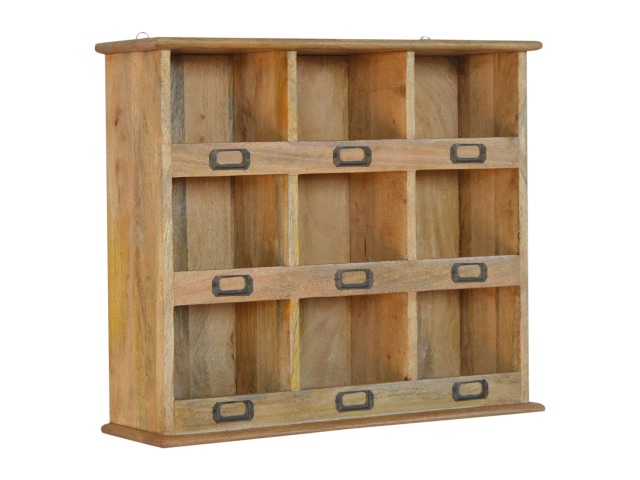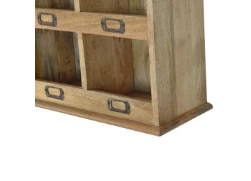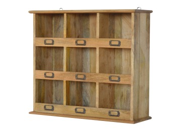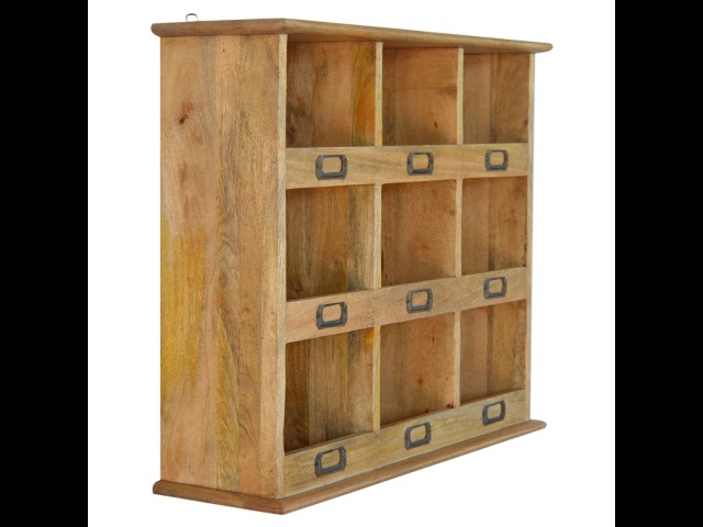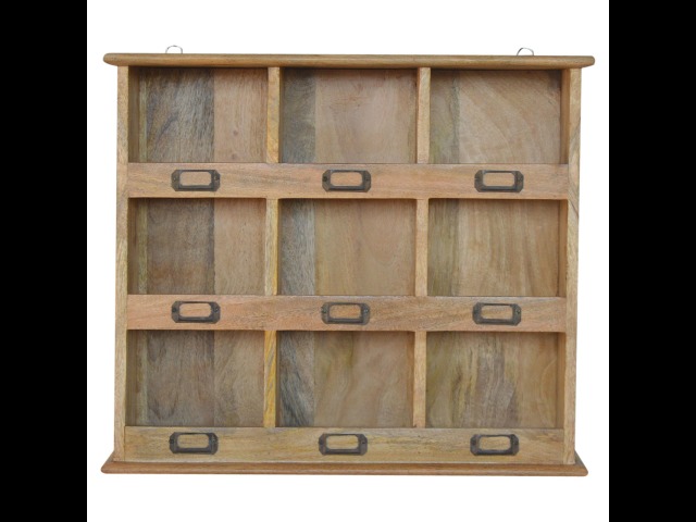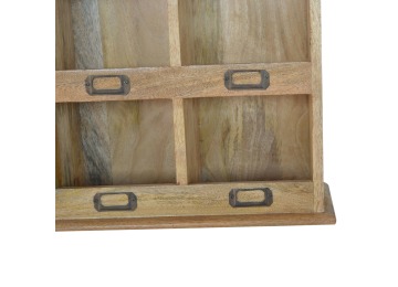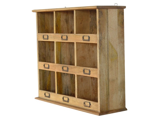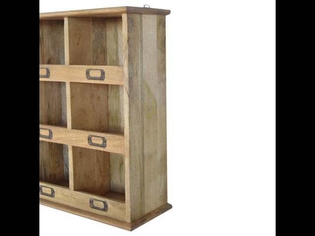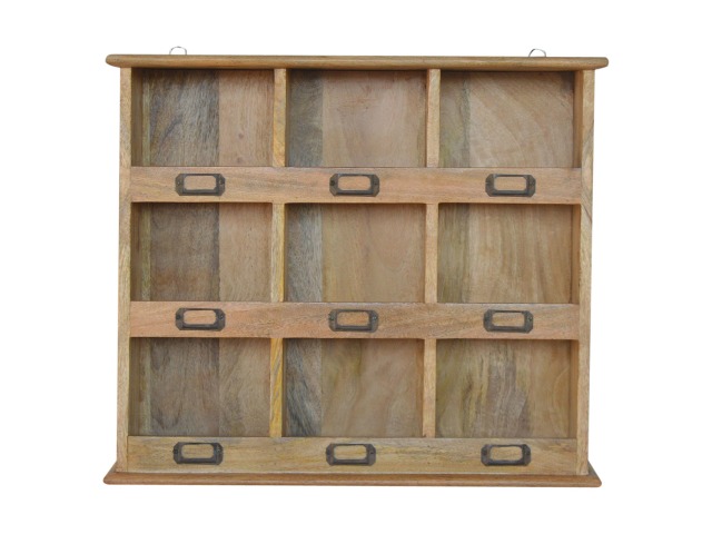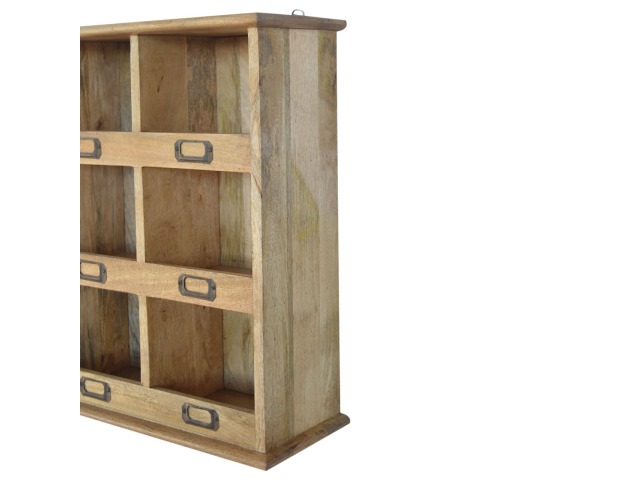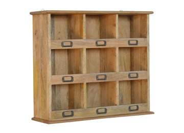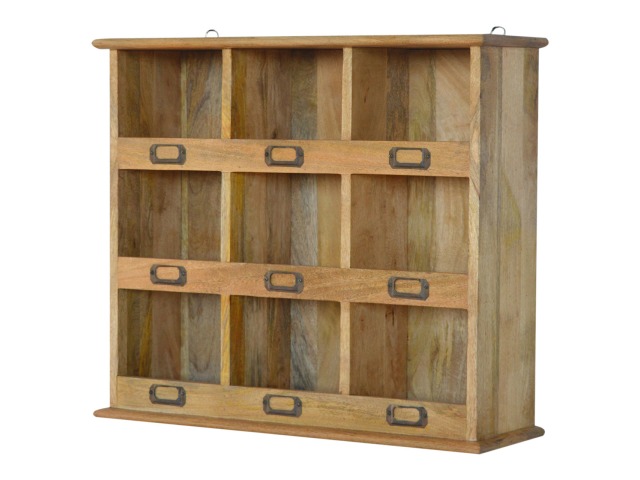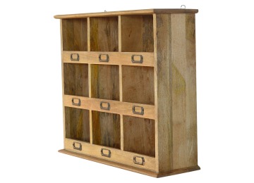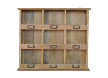 A neo-classic wall mounted unit with nine utility slots for everyday use. A practical solution to everyday storage needs in the kitchen or elsewhere. Handcrafted brass finished metal slots to name or number the item. It is constructed from 100% solid mango wood and has a fine oak-ish finish.
