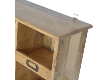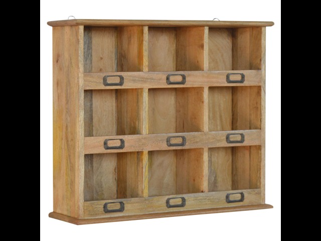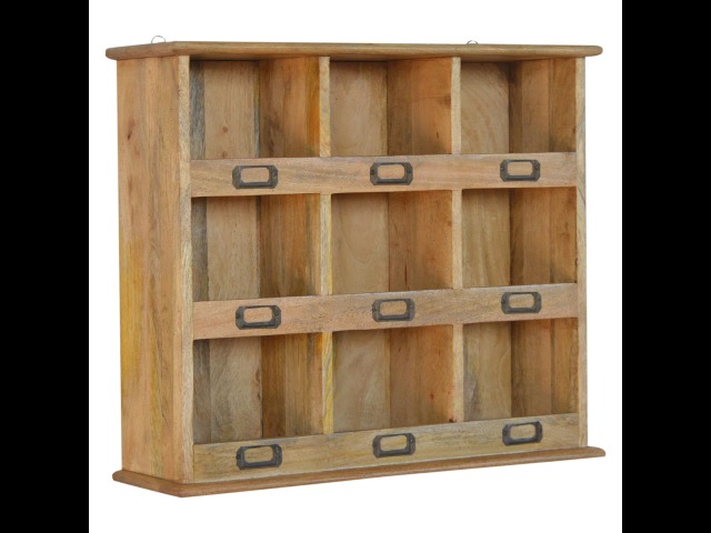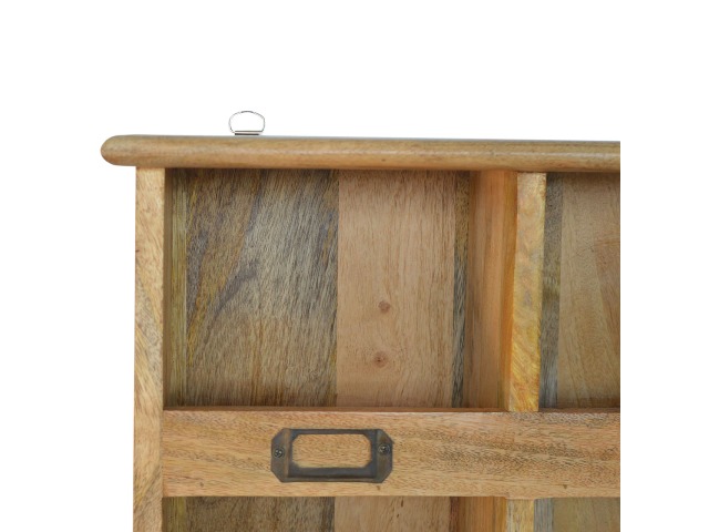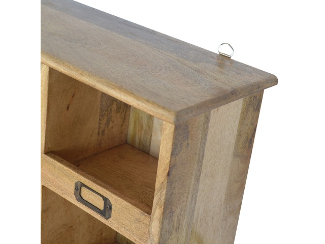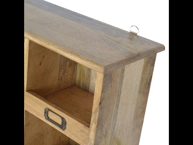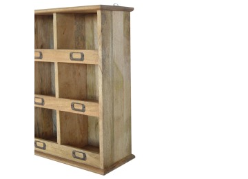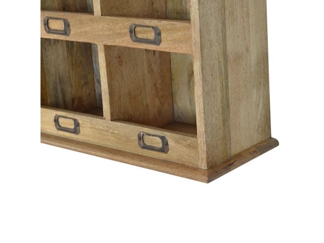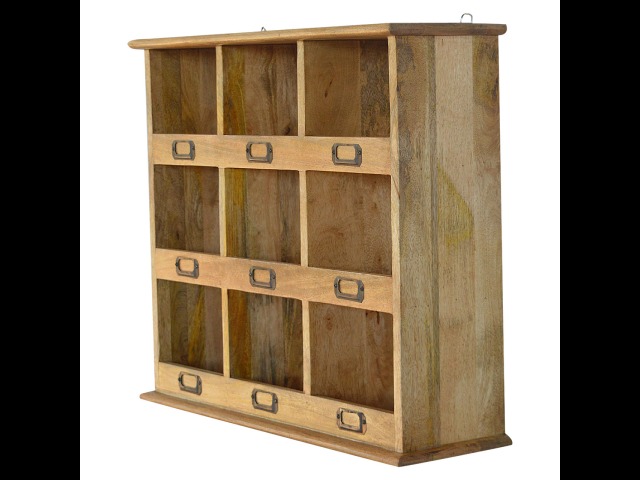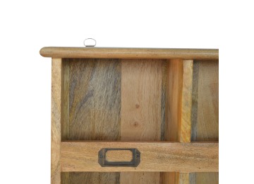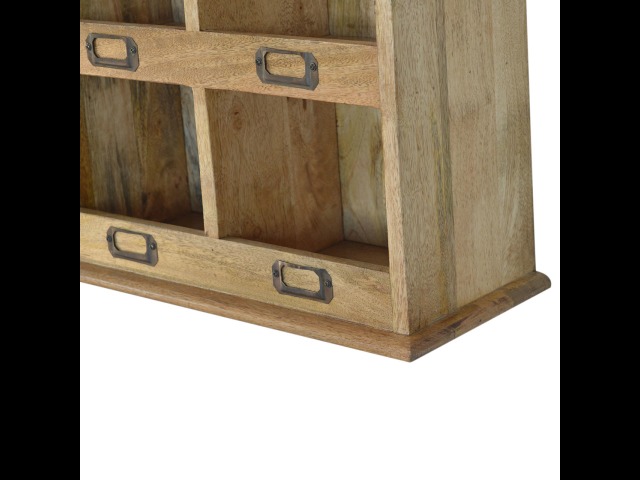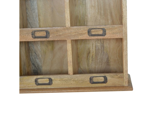 A neo-classic wall mounted unit with nine utility slots for everyday use. A practical solution to everyday storage needs in the kitchen or elsewhere. Handcrafted brass finished metal slots to name or number the item. It is constructed from 100% solid mango wood and has a fine oak-ish finish.