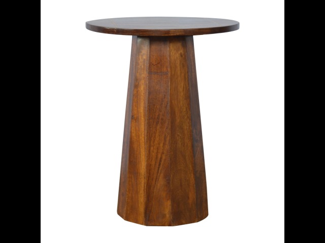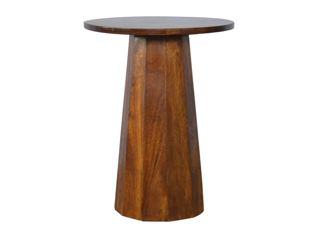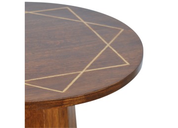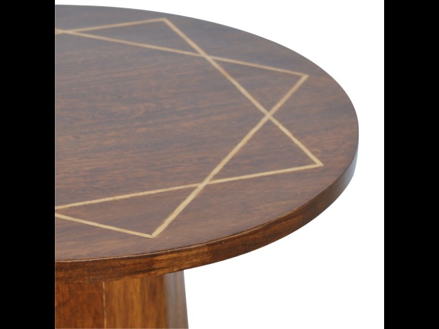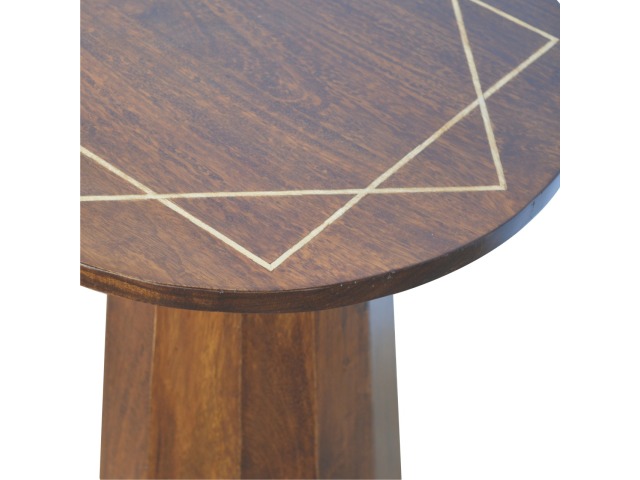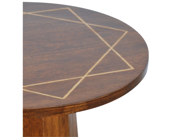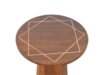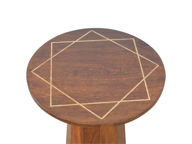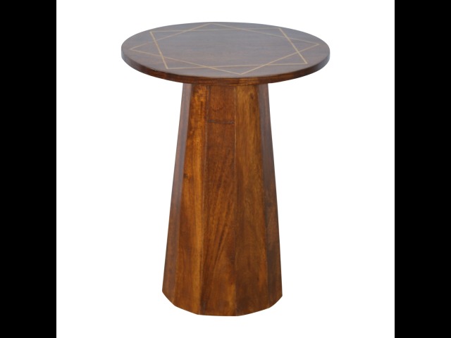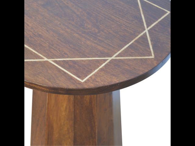 The petite end table has been constructed from 100% solid mango wood in a chestnut finish with a tapering base, the main feature of this product is the geometric print on the table top that has been made with a gold wire complimenting the wood perfectly. It can stand alone or be partnered with other gold wired front pieces.