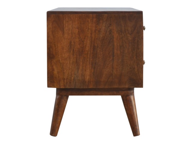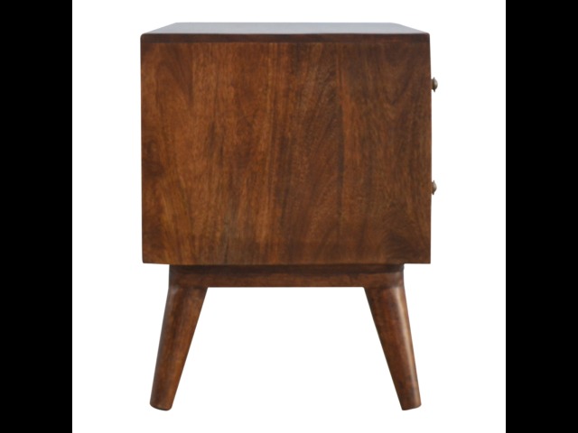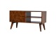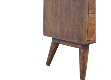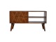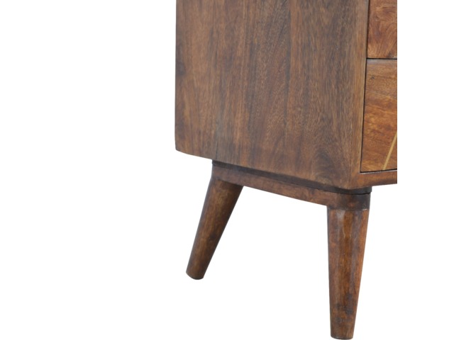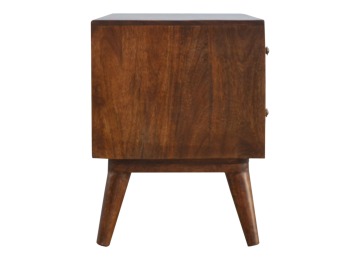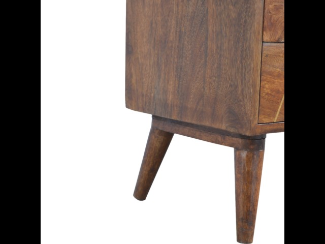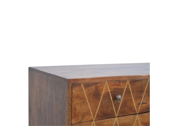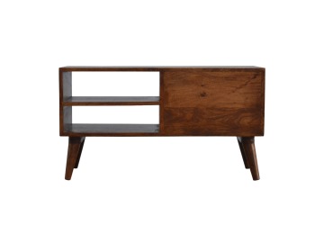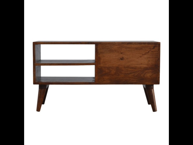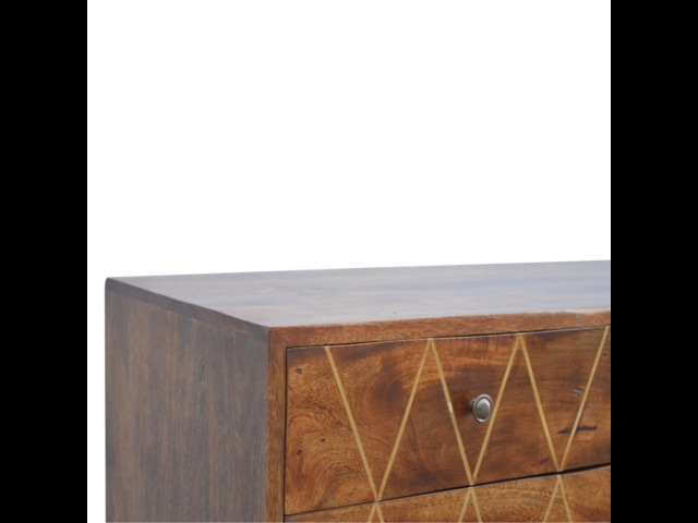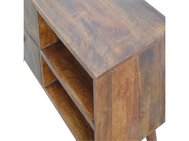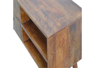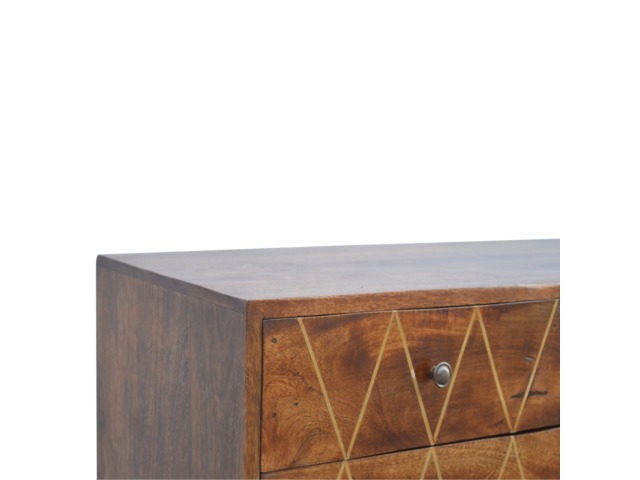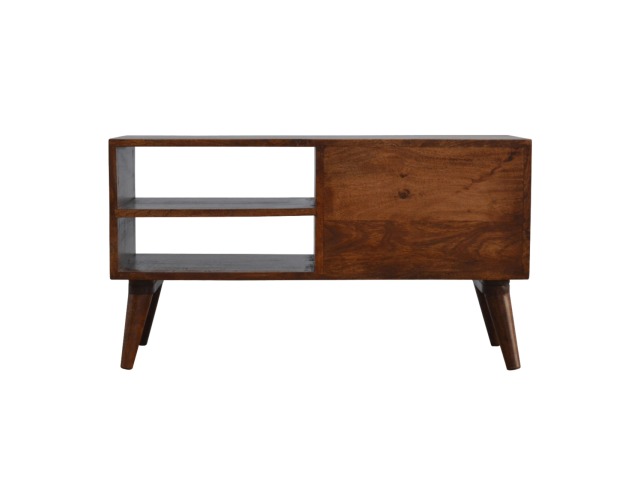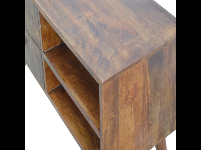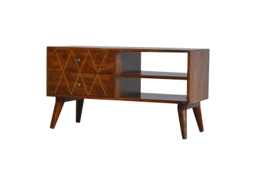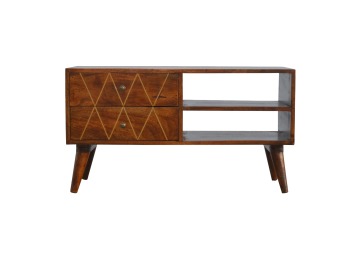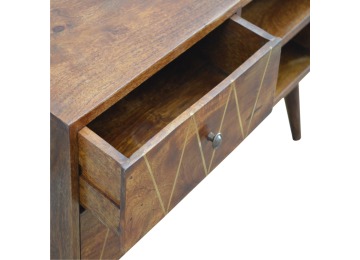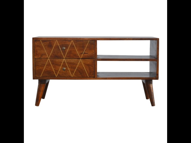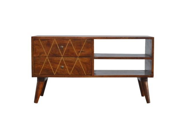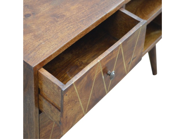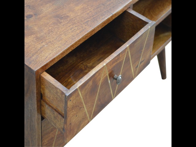 This solid timber media unit is expertly constructed from 100% solid mango wood, and has a fine, smooth chestnut finish. A simple yet modern design to suit most homes, featuring carefully handcrafted joints, wooden runners and 2 brass knobs. Useful storage space is available with 2 gold inlay drawer fronts and 2 open slots with 4 Scandinavian styled legs.