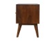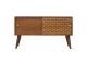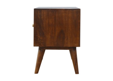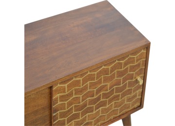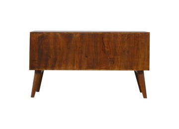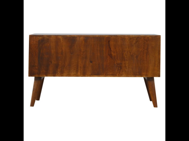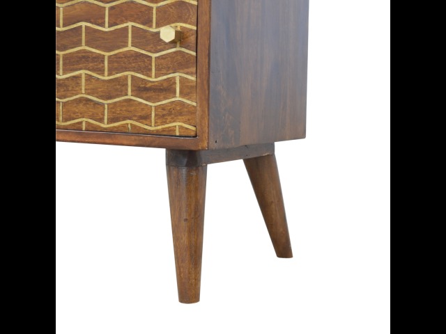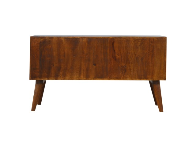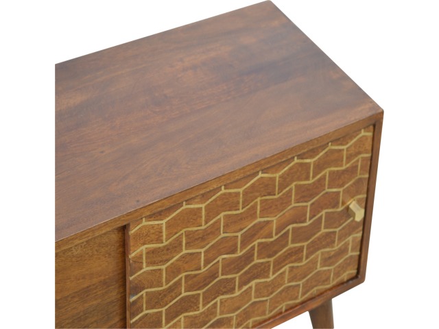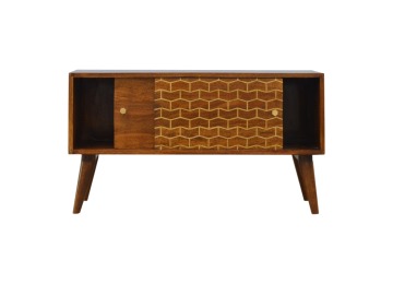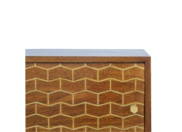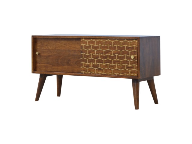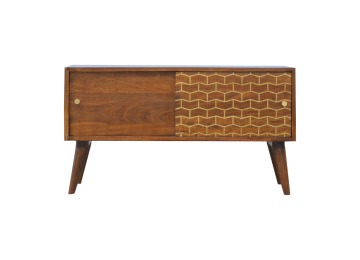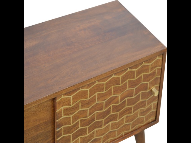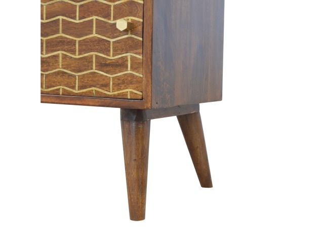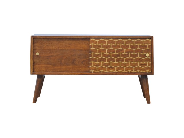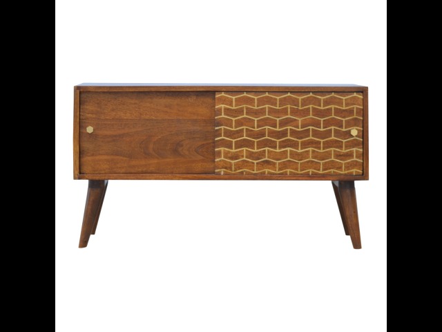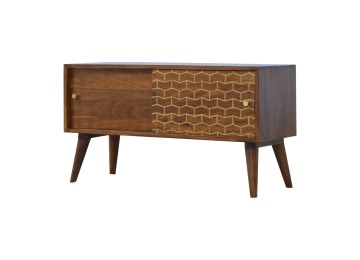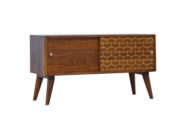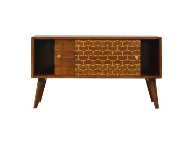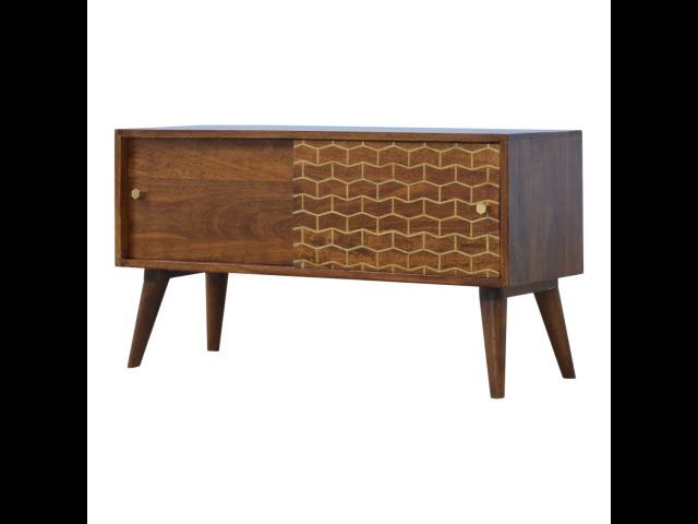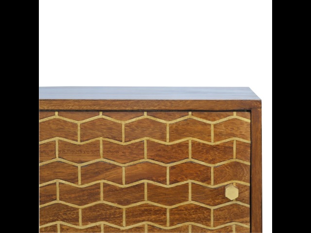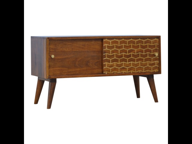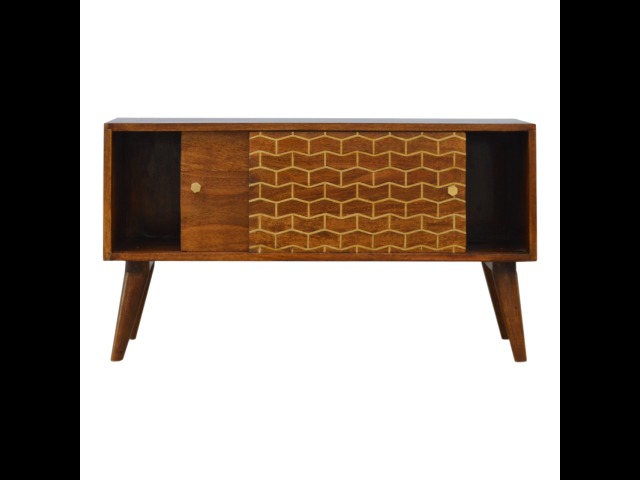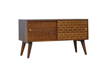This solid timber media unit is expertly constructed from 100% solid mango wood in a chestnut finish and features a clean and simple design to suit most homes. It has a gold pattern on the door frnt with 2 shiny brass knobs. This piece will compliment your home beautifully whether it is a standalone piece or partnered from the other pieces from the range. It is carefully finished in a durable lacquer to help protect and enhance the look of this solid oak piece of furniture.