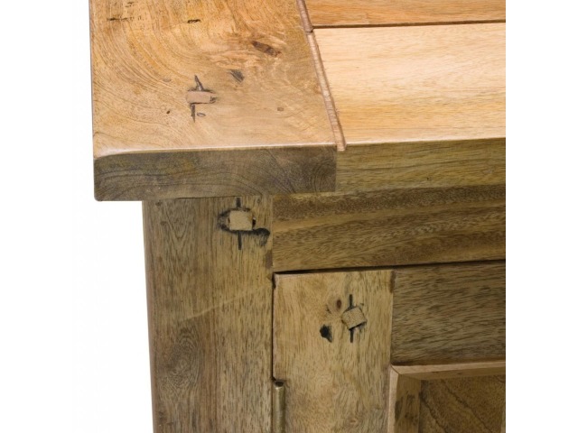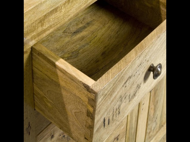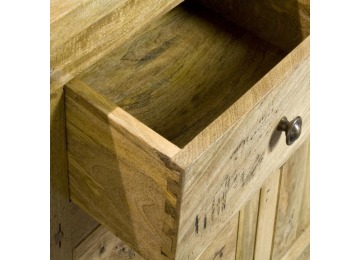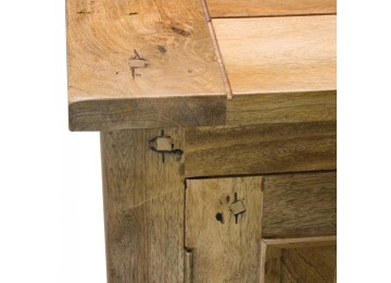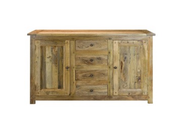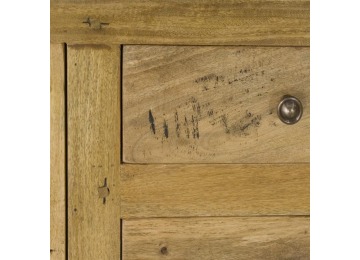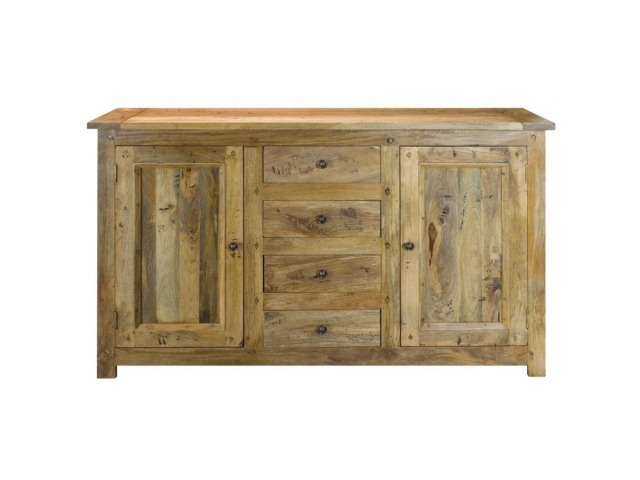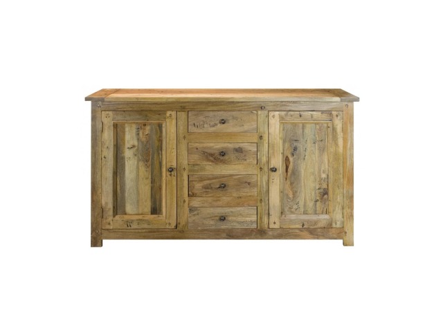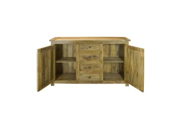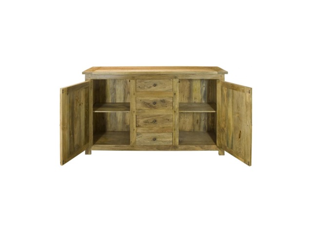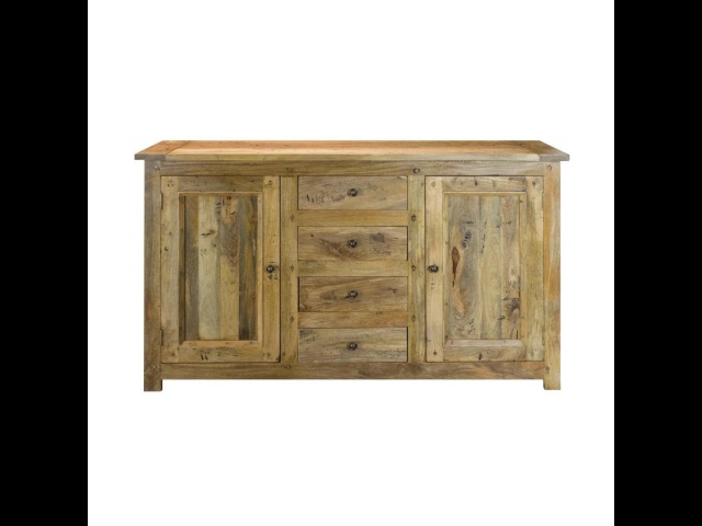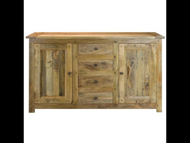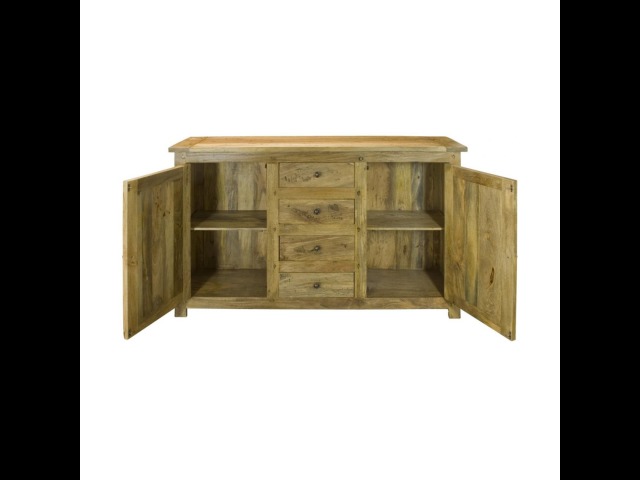 This sideboard is made of 100% solid mango wood with a hand-distressed oak-ish finish that gives it a rustic appeal while maintaining its classic charm, making it the ideal addition to your home. With four drawers, two cabinets, and shiny knobs, this product will provide you with all the storage space you need. Product to be delivered on the pallet as a pavement/kerbside delivery. Customer needs to dispose off or use it if they wish to. For possible returns, we would require the original pallet alongside full packaging as part of returns policy.