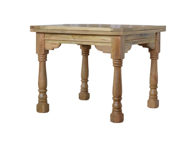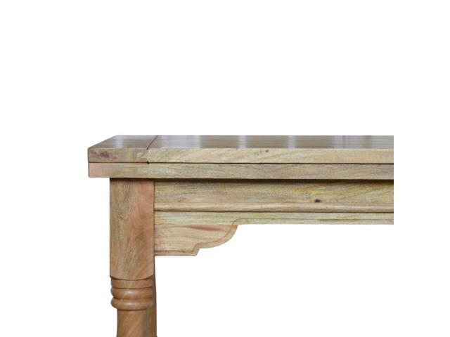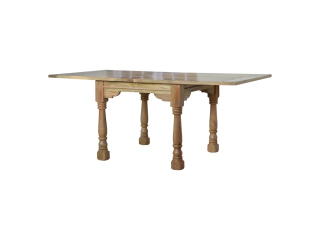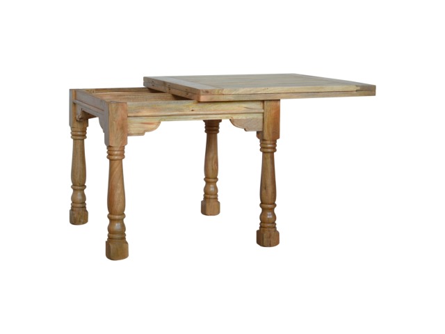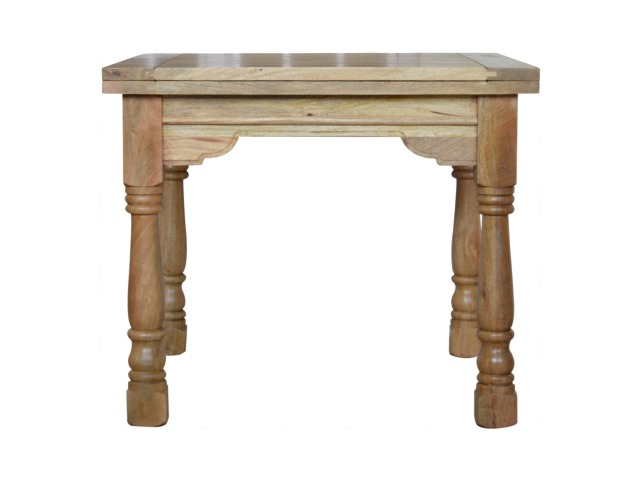 This charming butterfly table is excellent for intimate dinners for two in kitchen-diners or smaller dining rooms, but extends to seat four to six people when needed. This table has a butterfly extension that stores beneath the tabletop and is very easy to use. This piece has been built to last, with a simple functional design and hints of country charm; made from 100% solid Mango wood with a fine hand-distressed oak-ish finish.