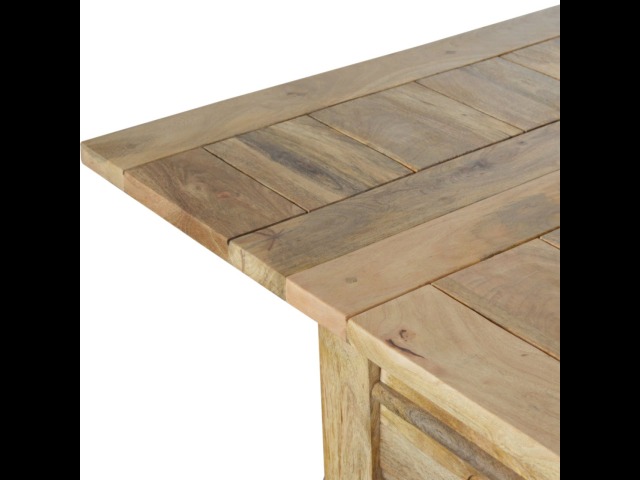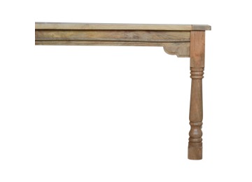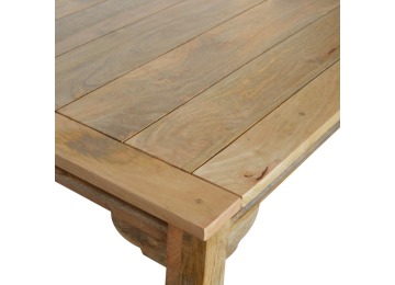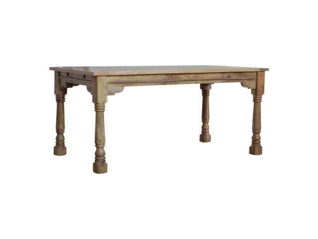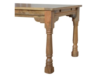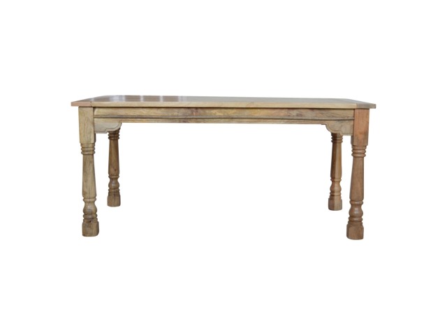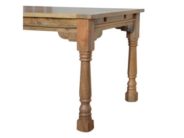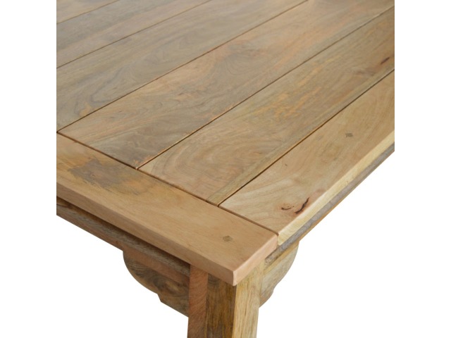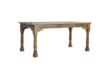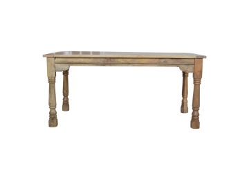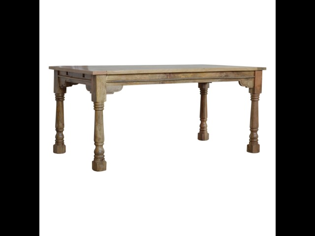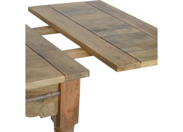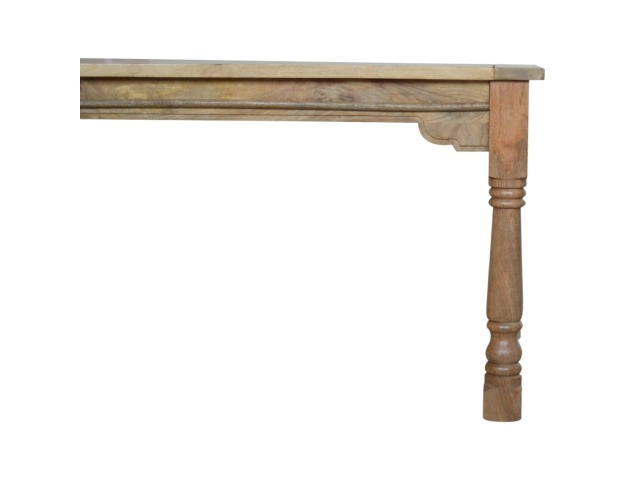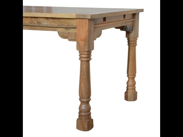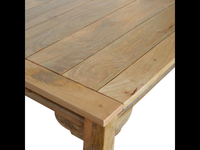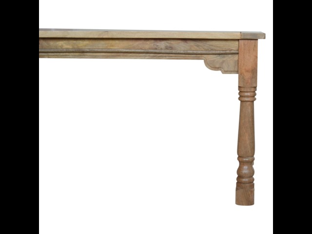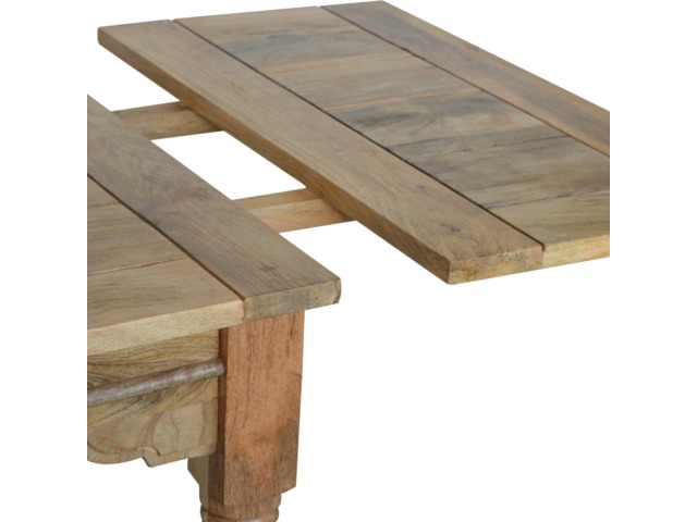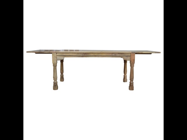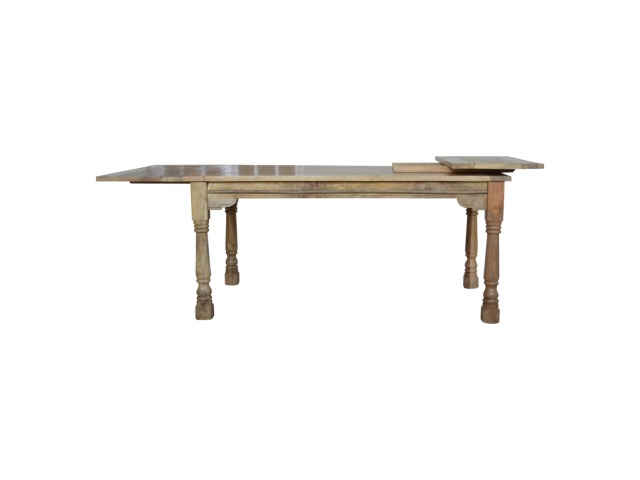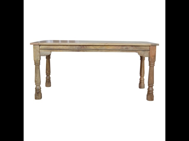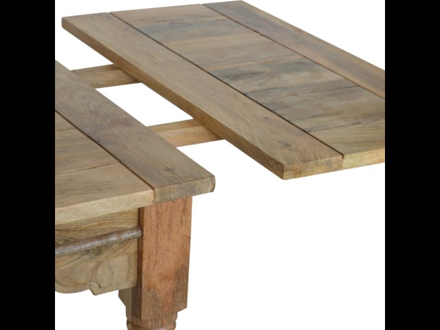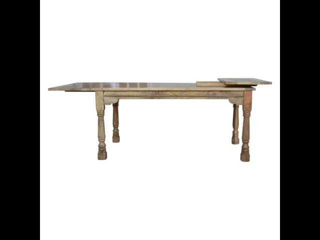 This Dining Table will offer a touch of elegance to any home. It comfortably seats six diners and is excellent for a range of dining occasions due to its distinct rustic design and character. Hand-turned legs, a delicate hand-distressed oak-ish finish, and 100% solid mango wood are some of the product characteristics. Each leaf adds 45cm to the table's length, bringing the total length to 255cm. Product to be delivered on the pallet as a pavement/kerbside delivery. Customer needs to dispose off or use it if they wish to. For possible returns, we would require the original pallet alongside full packaging as part of returns policy.