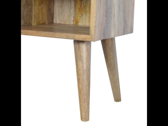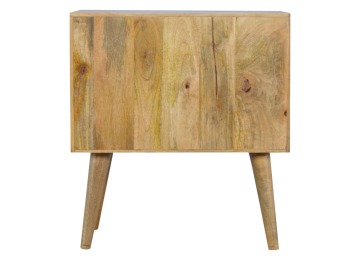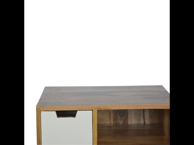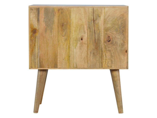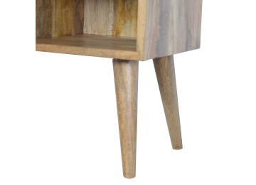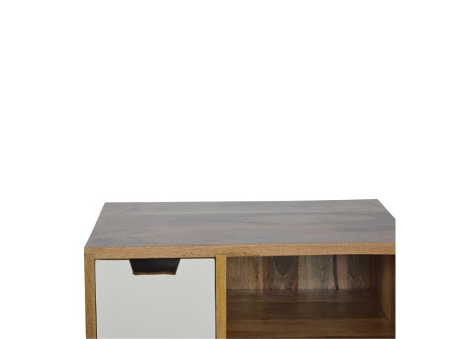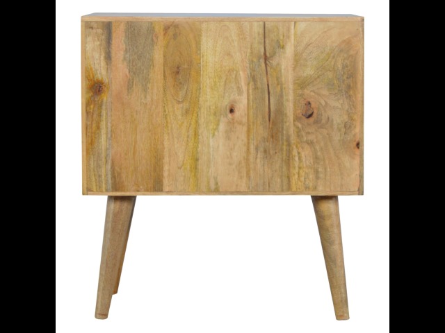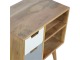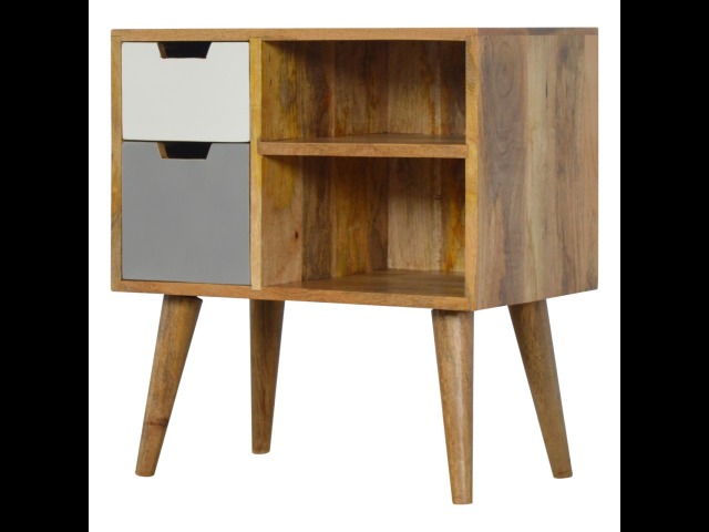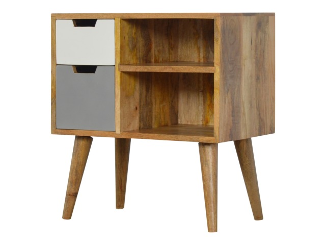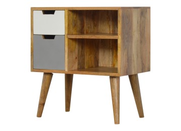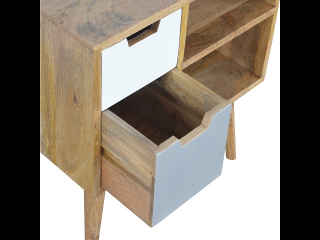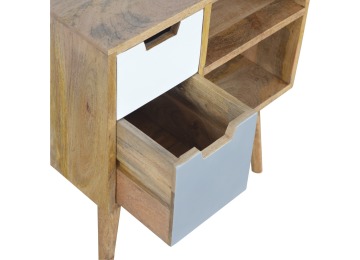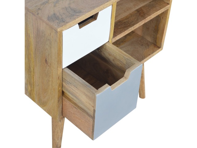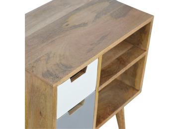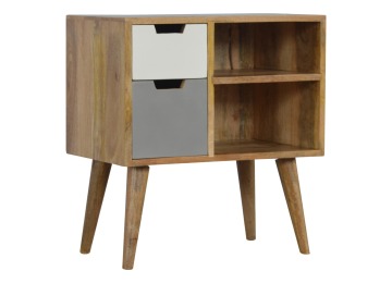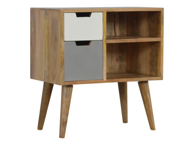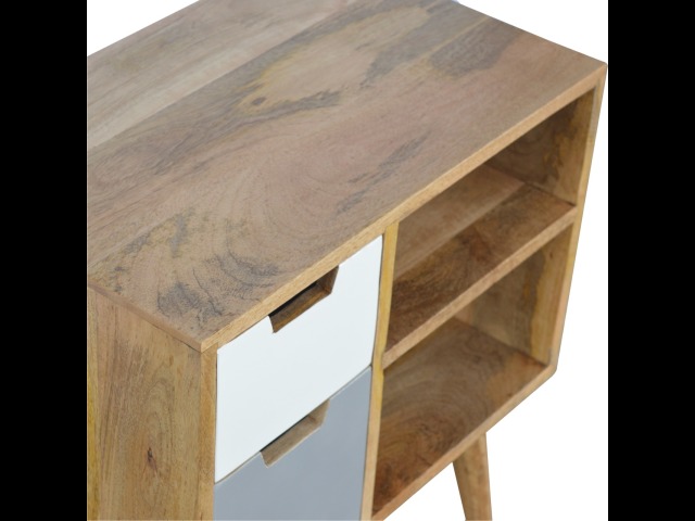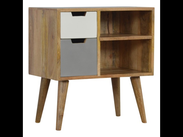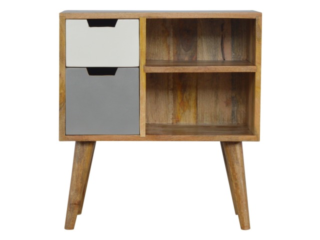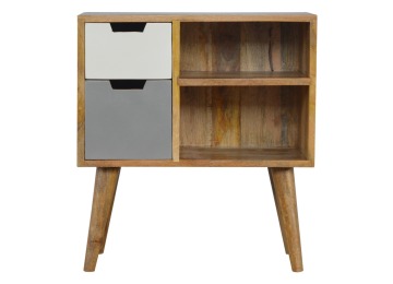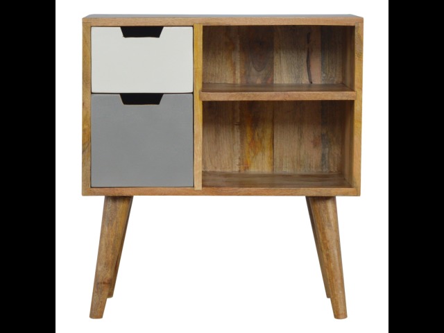 If you're in need of any extra storage in the home this handy cabinet is all you will need, constructed from 100% solid mango wood with an oak-ish body it features 2 small hand painted cut out drawers and 2 open slots to allow you to display your favourite ornaments or photo frames and stands on 4 Nordic style legs. The perfect addition for any home that can stand alone or be partnered with the other pieces from the grey painted range.
