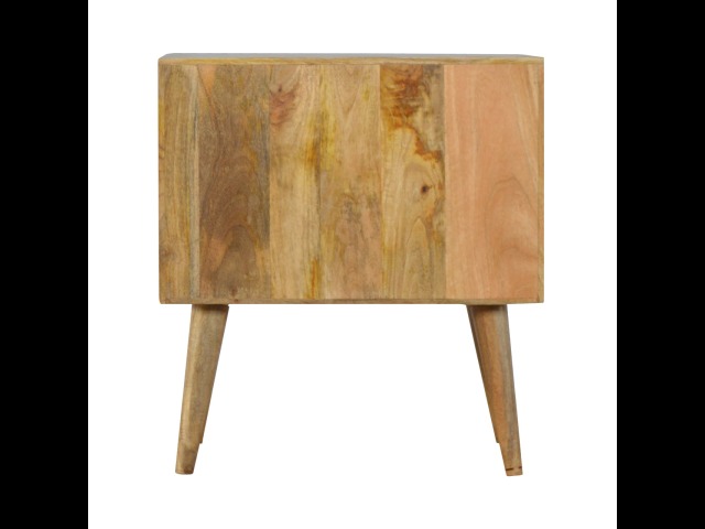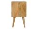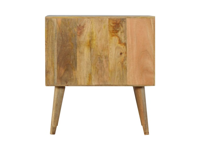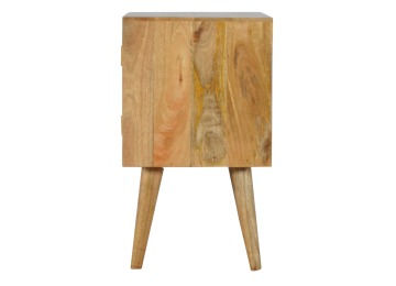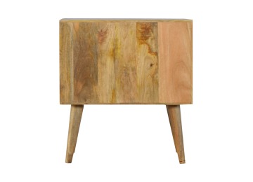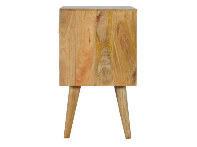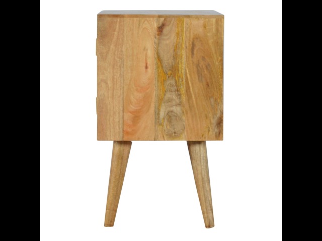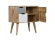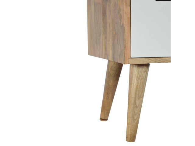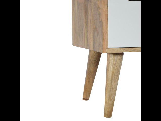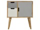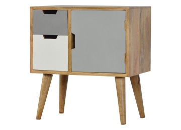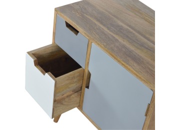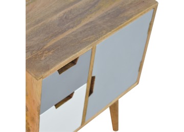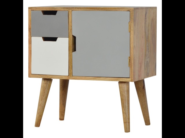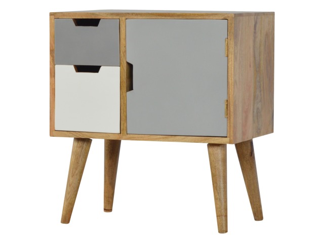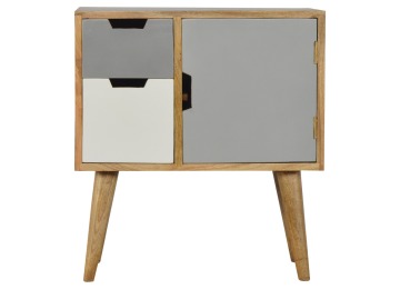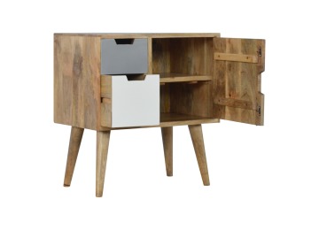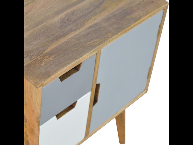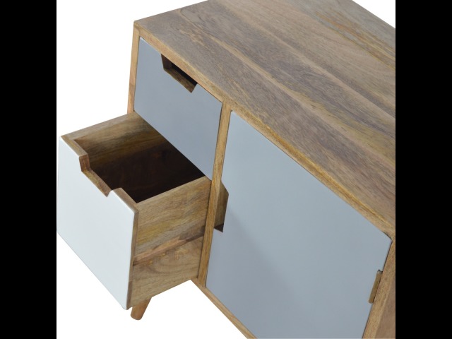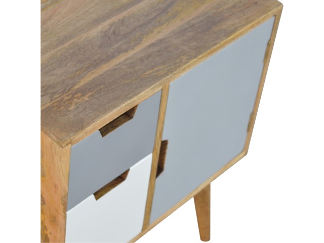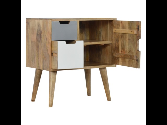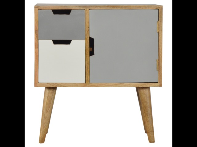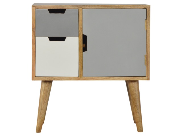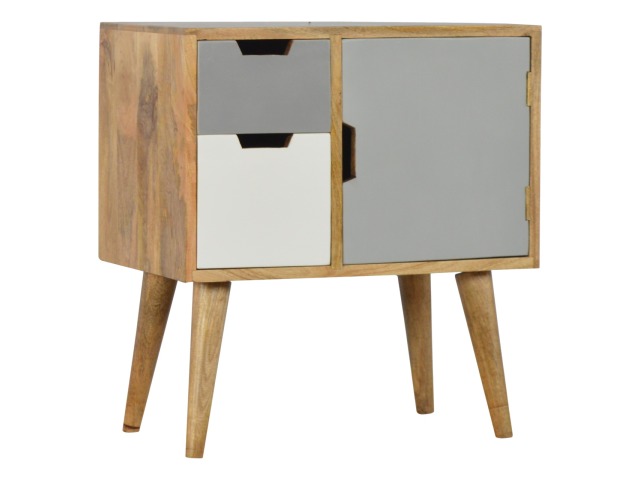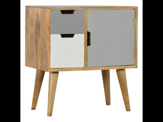 Add a fresh look to your home with this cabinet. Constructed from 100% solid mango wood in an oak-ish finish. It has features such as 2 mini cut out drawers and a small cabinet door painted in shades of grey. It provides enough space for storing any bits and pieces you wish you keep out the way and ample space on top if you wish to diaply any photo frames or ornaments and it stands on 4 Nordic style legs.